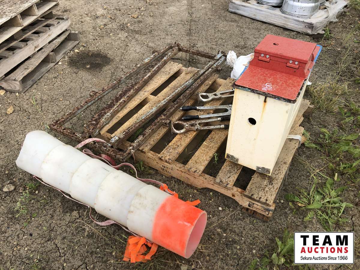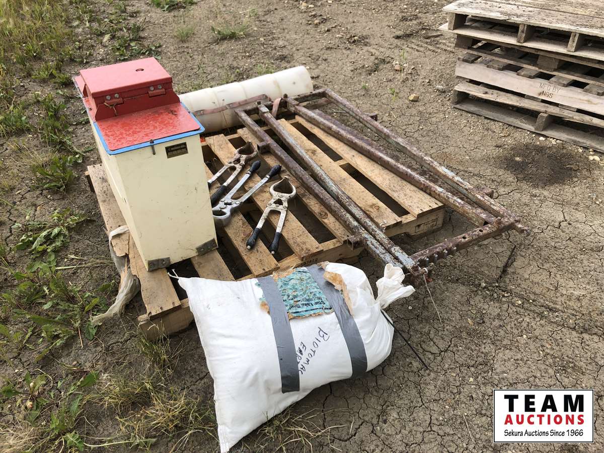 50 head watering bowl, (3) Burdizzo pliers, head gate, earth mineral, auger pails