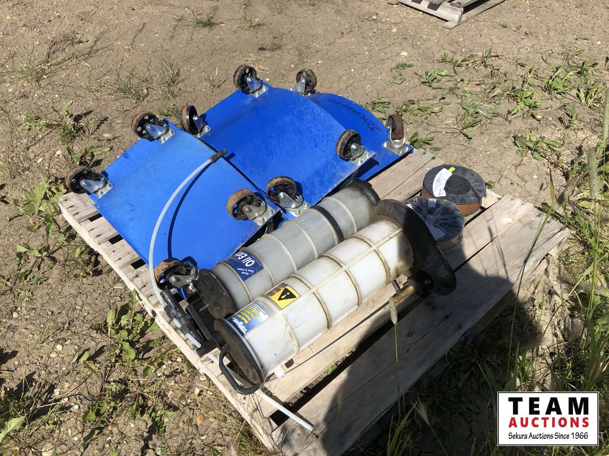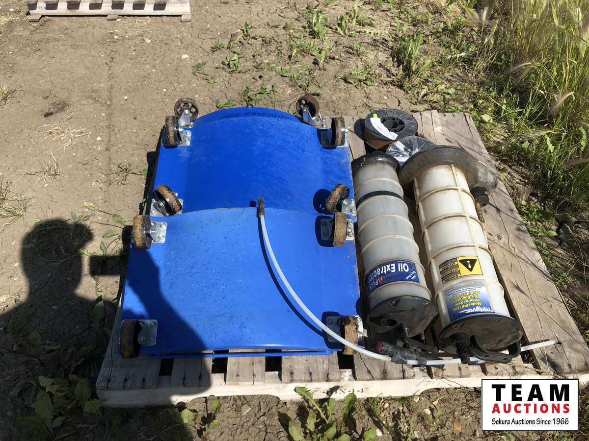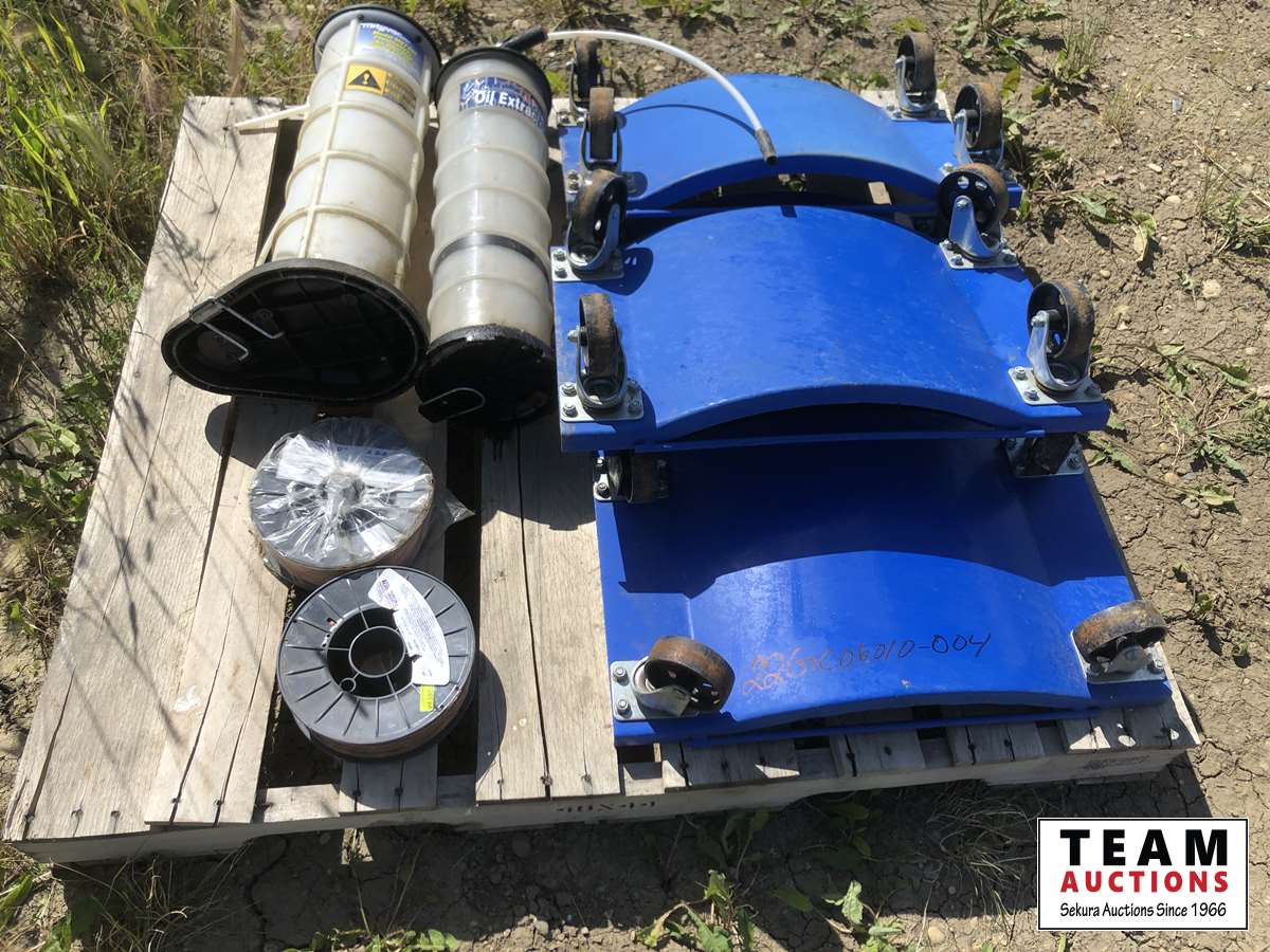 Set of (4) metal car dolly's, (2) oil extractors, (2) Blue Shield welding wire 11 lb roll