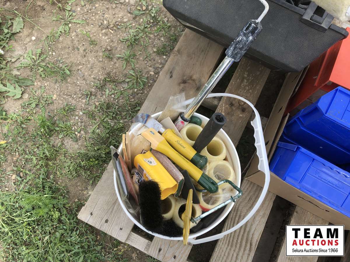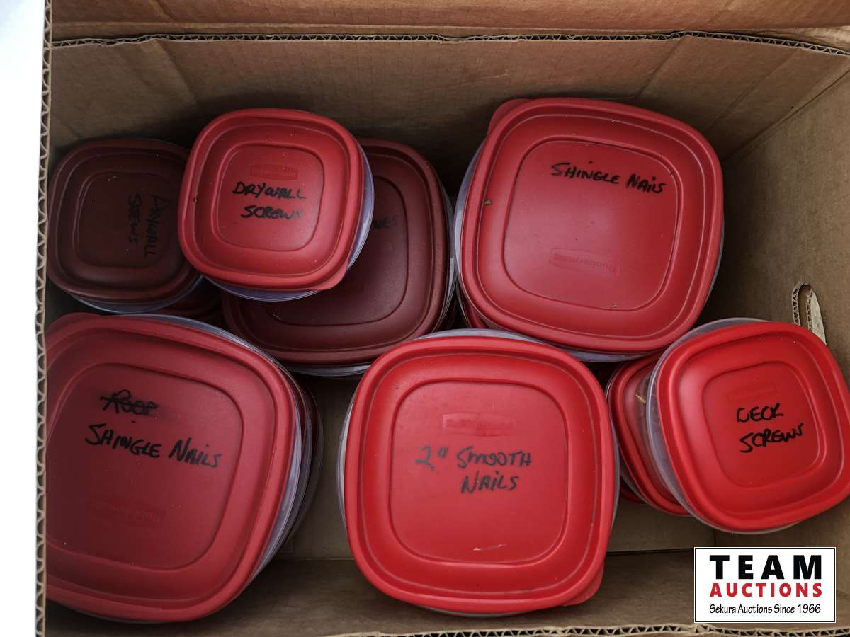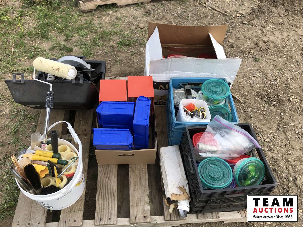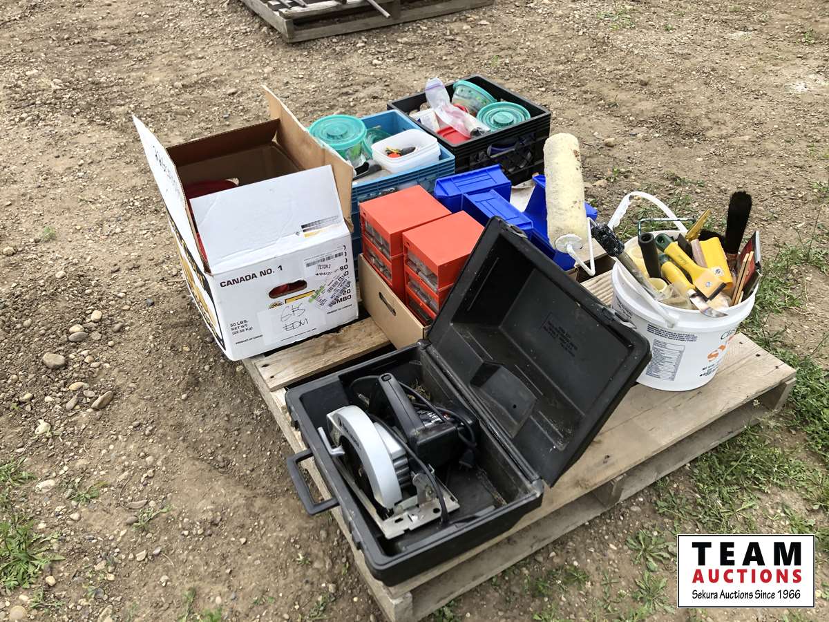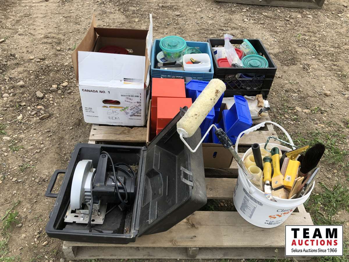 Bolt bins, skill saw, miscellaneous painting supplies, miscellaneous bolts & nails