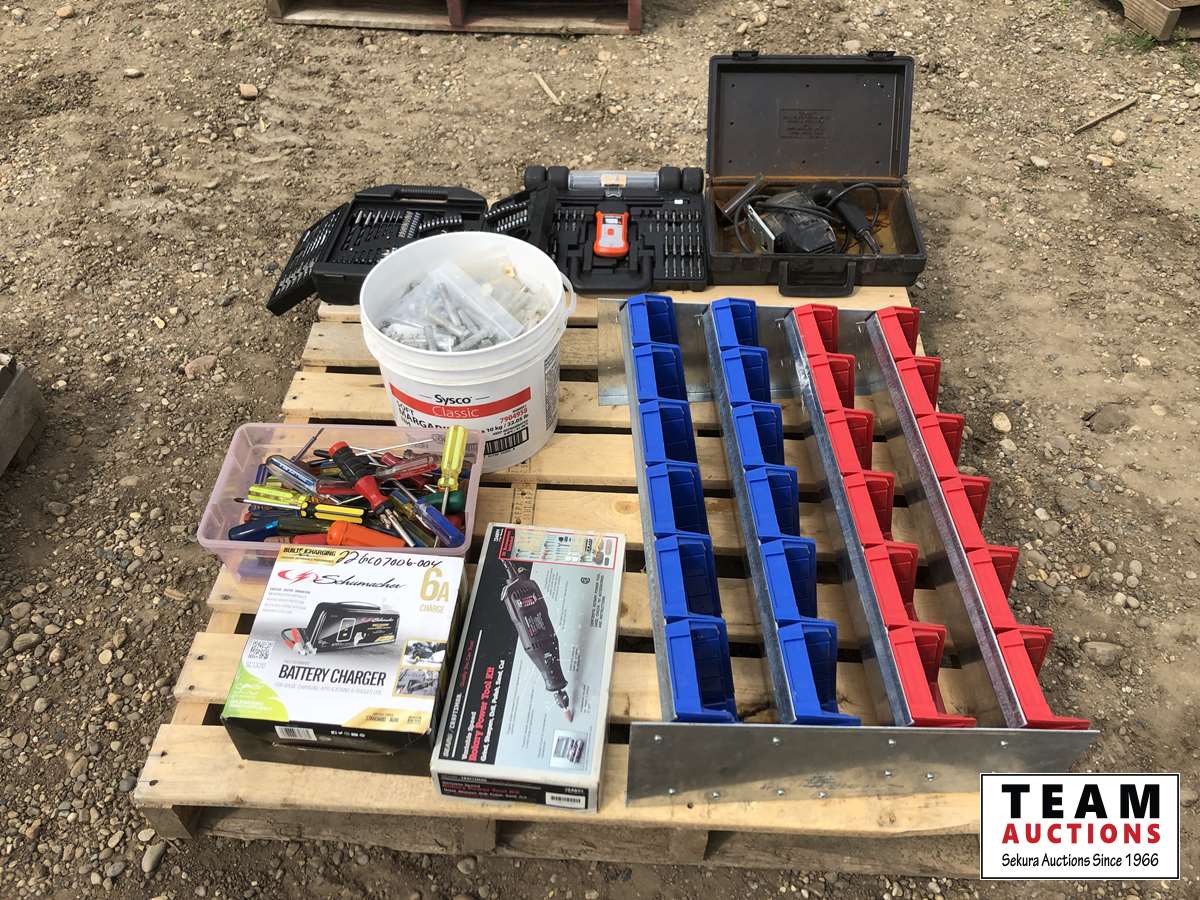 Battery charger, bolt bin, assortment of bolts, tig saw, drill bit assortment, jig saw, screw drivers, rotary power tool