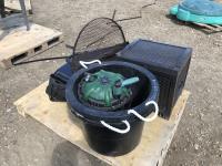 Suncast hose reel, portable BBQ, (2) large black buckets
