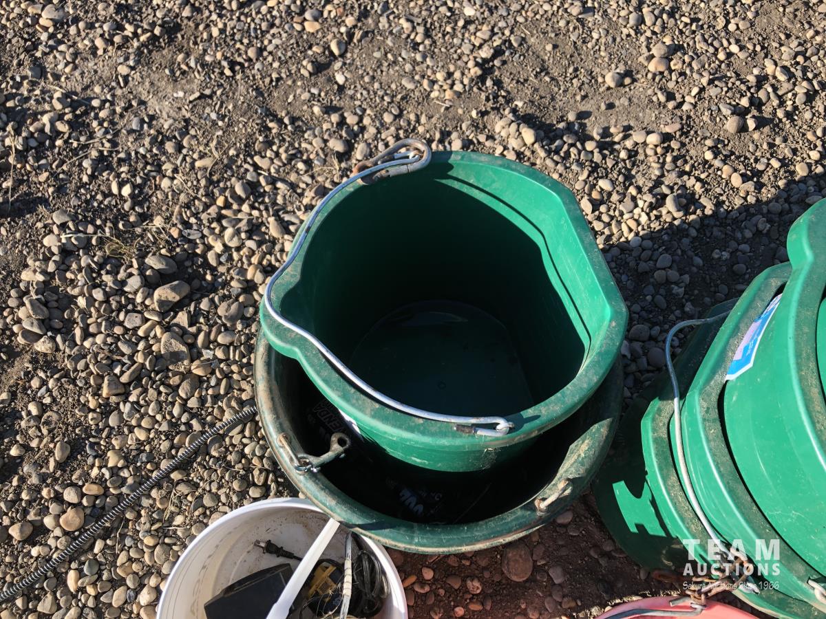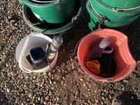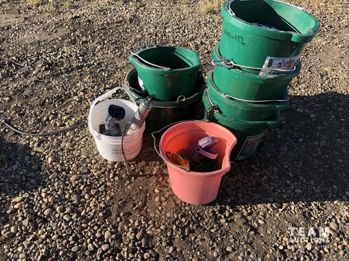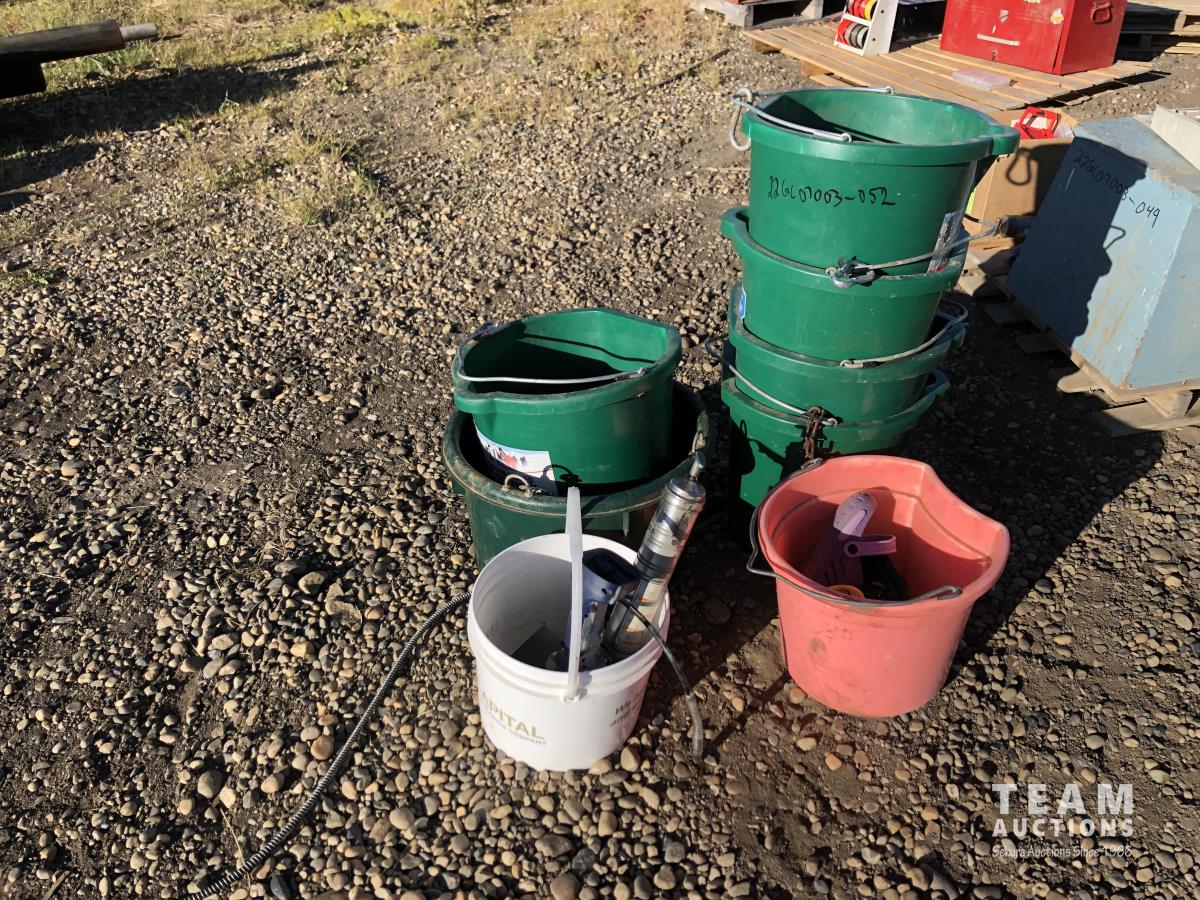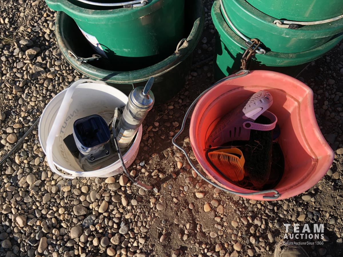 5 gallon flat back buckets, brushes, electric grease guns with battery & charger