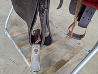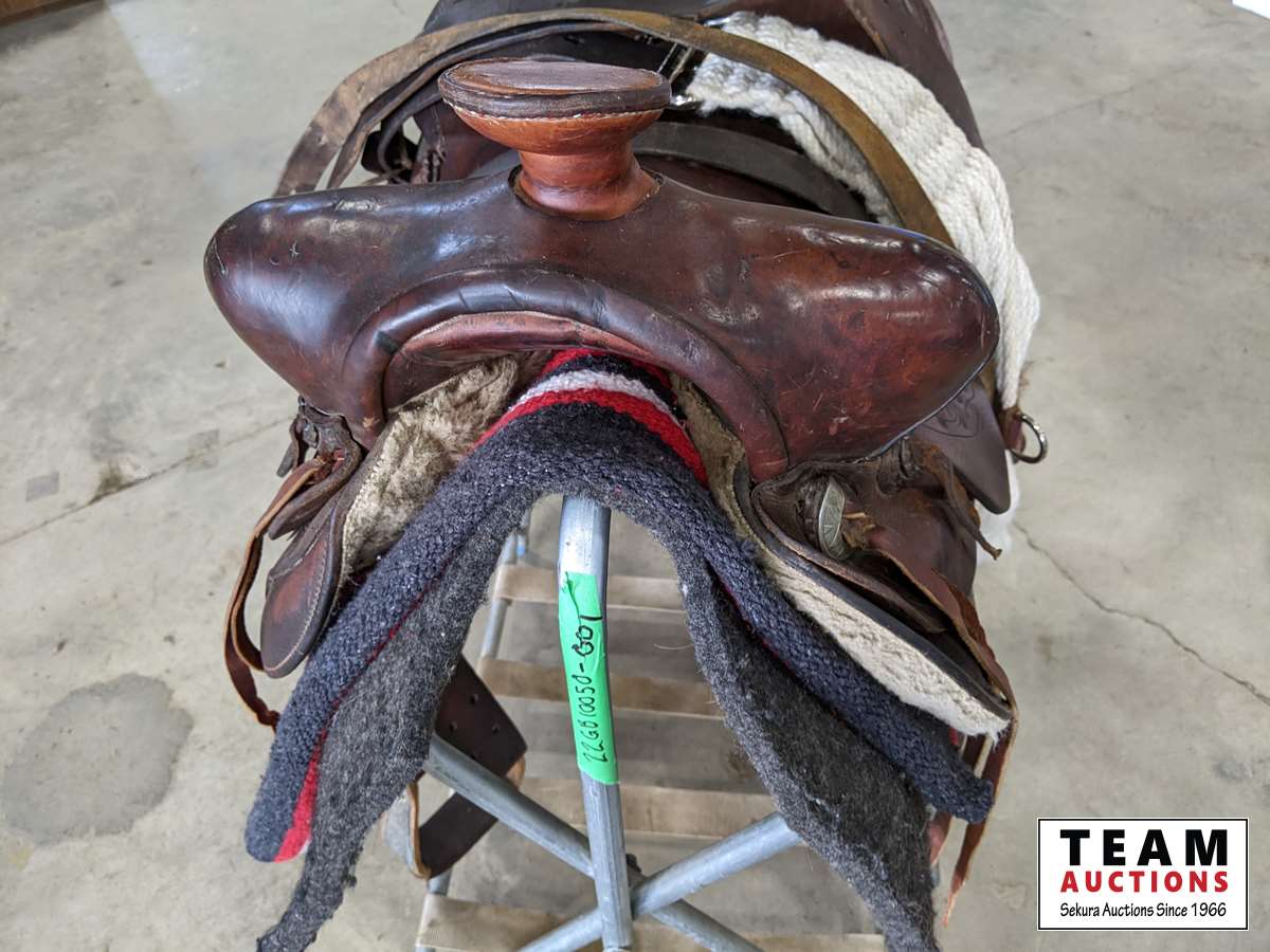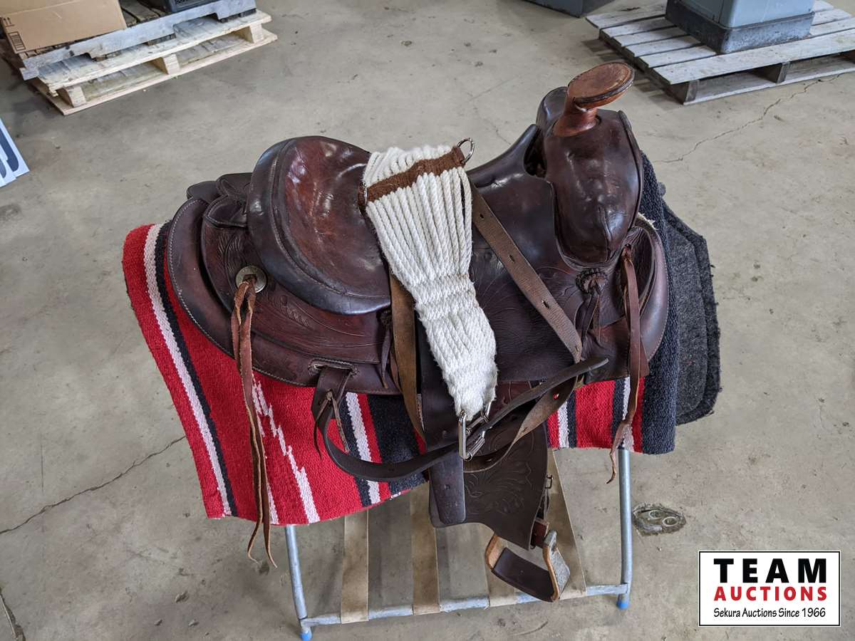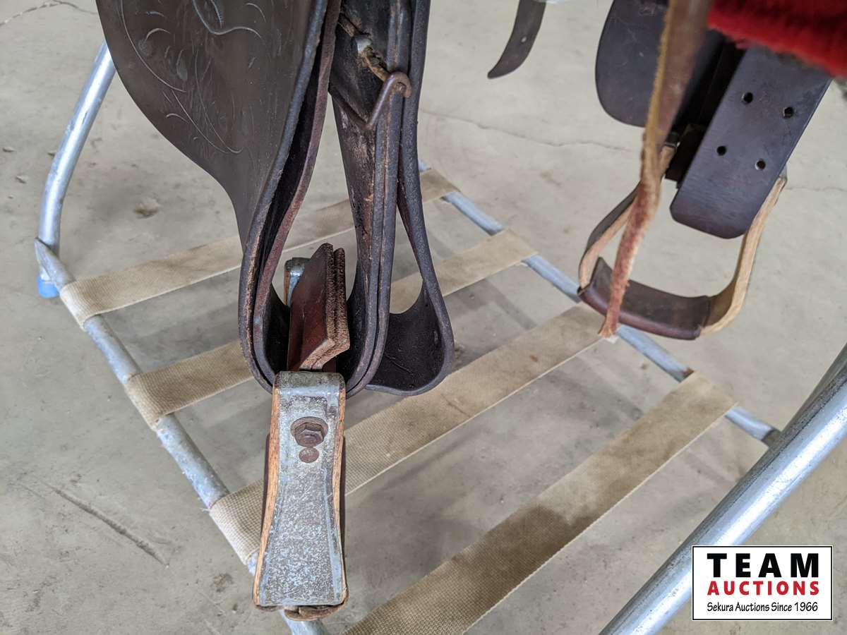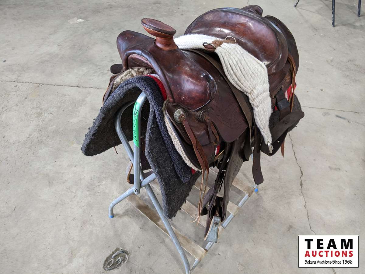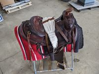 c/w wool saddle pad, saddle blanket, cinch and folding saddle stand