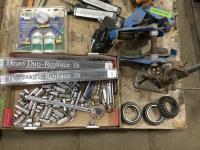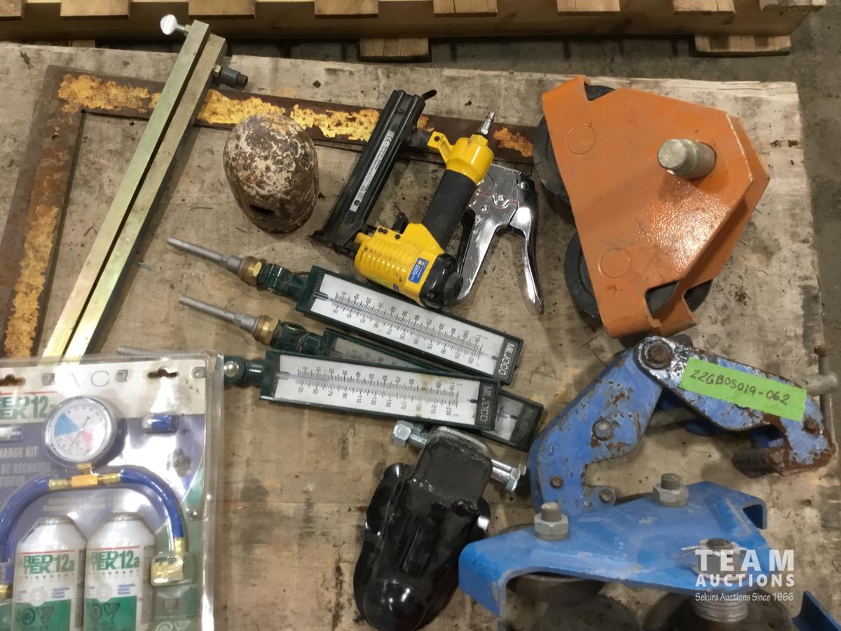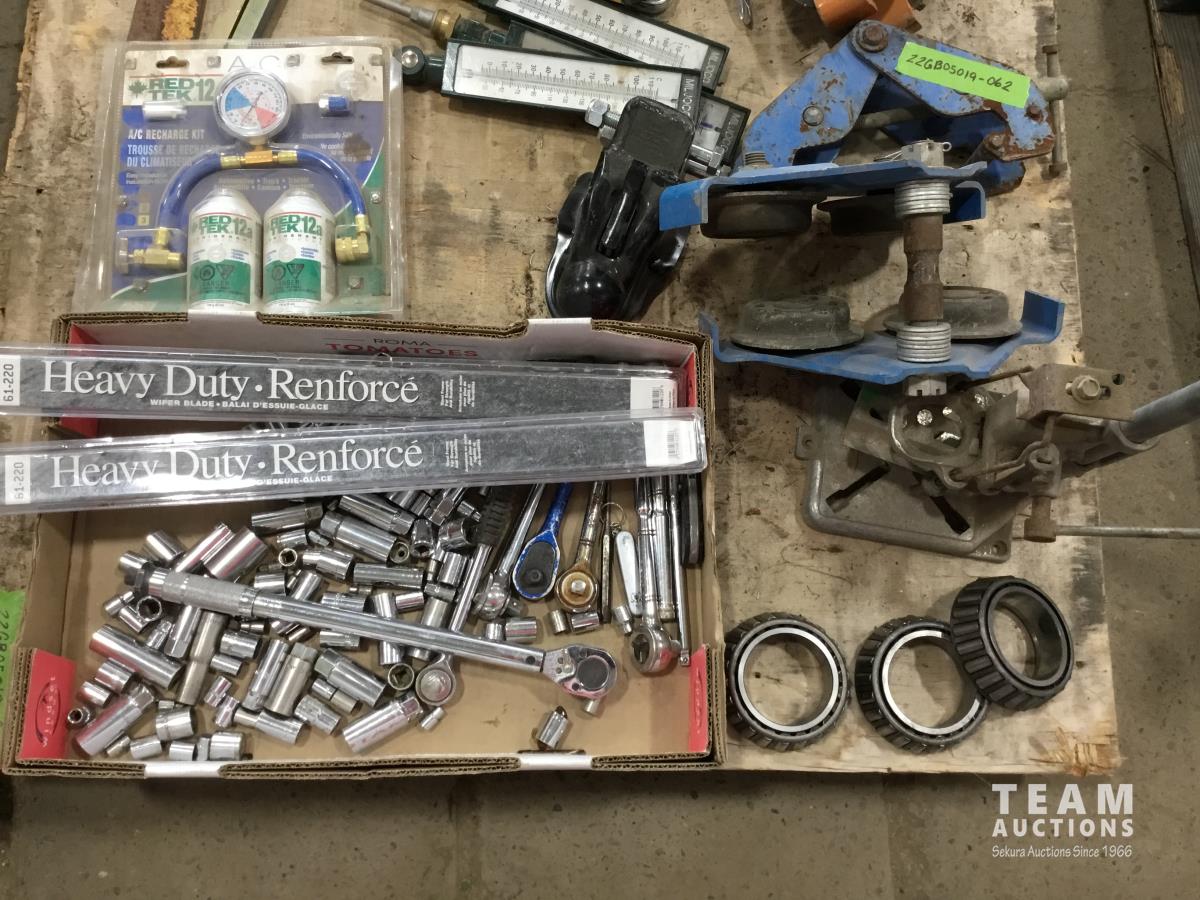 Ratchet set, knives, staple guns, torque wrench, A/C recharge kit, temperature gauges, heavy duty windshield wipers, sockets