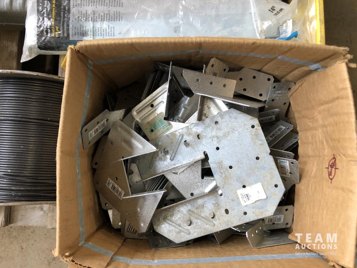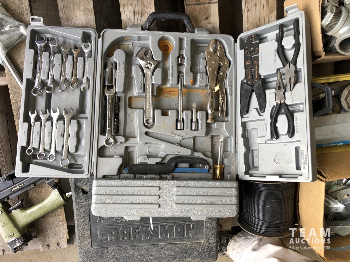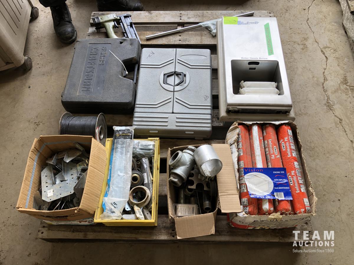 Box of mastic, qty of pipe fittings, qty of rafter & deck ties, hand dryer, (2) socket sets, air staple gun