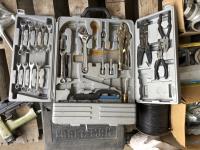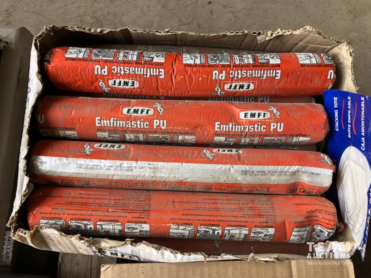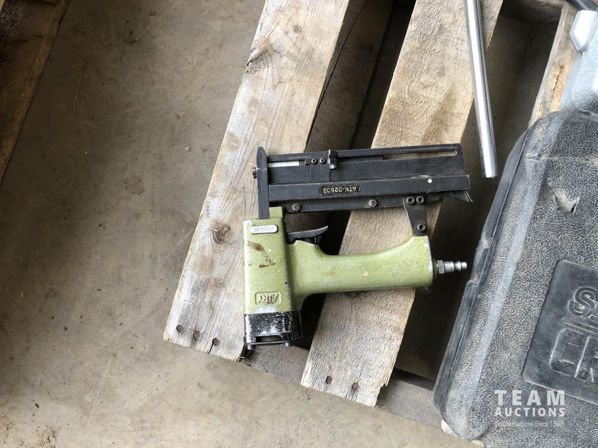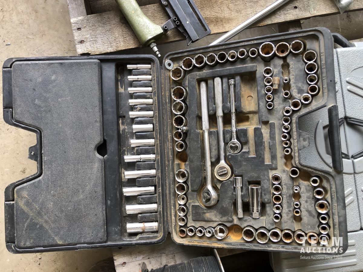 Box of mastic, qty of pipe fittings, qty of rafter & deck ties, hand dryer, (2) socket sets, air staple gun