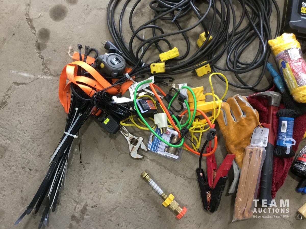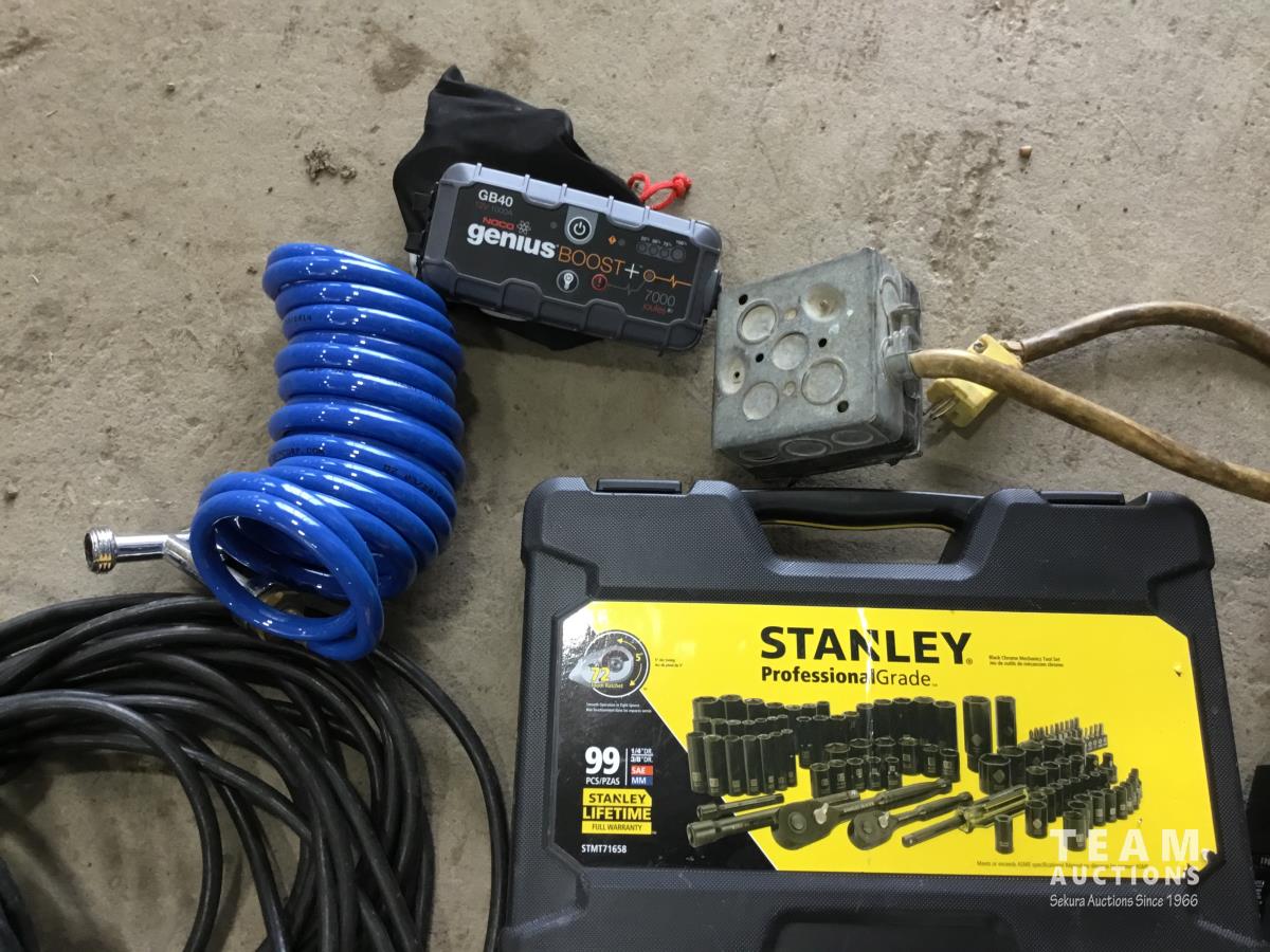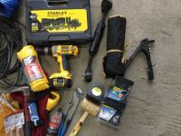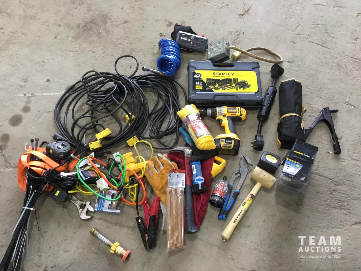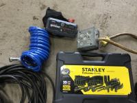Dewalt 18v drill, Stanley tool set, (2) 100 ft. extension cords