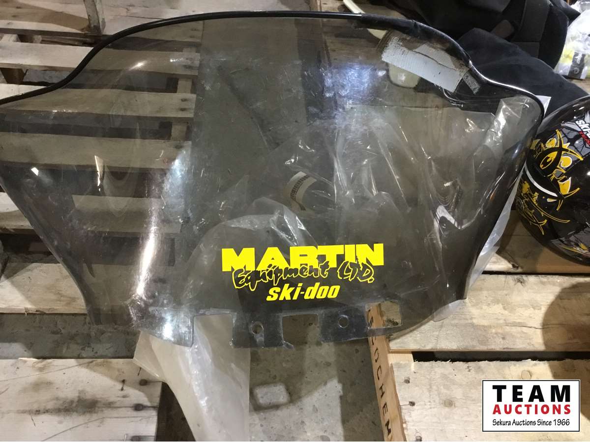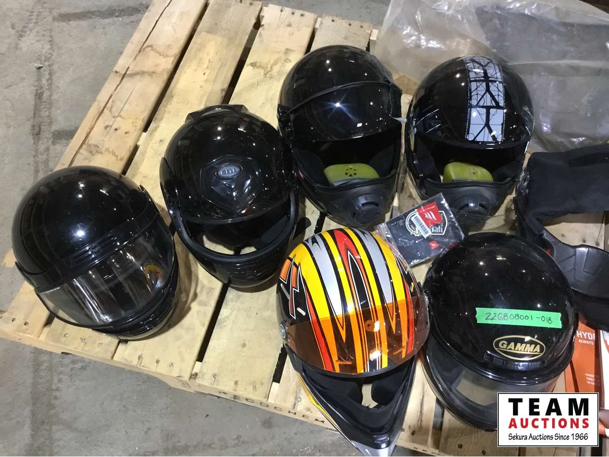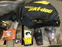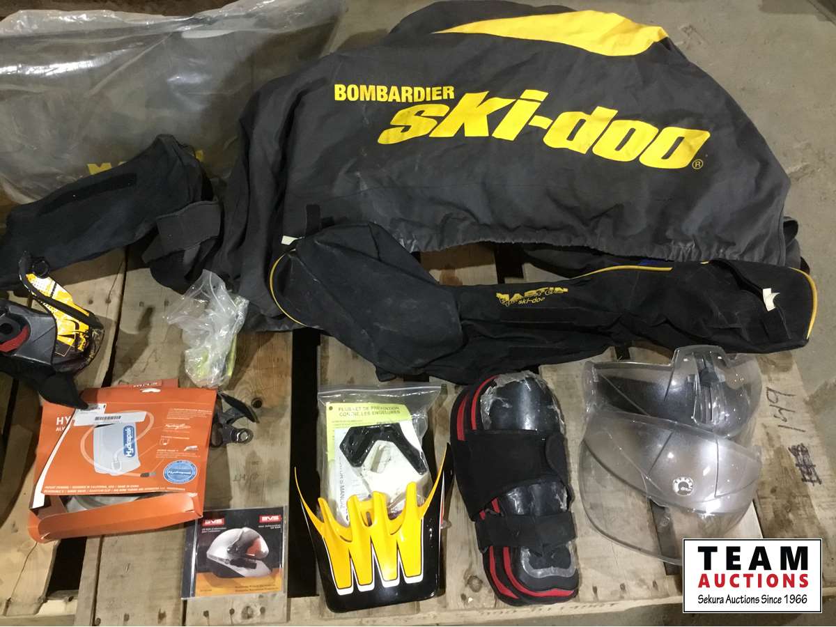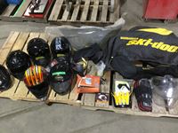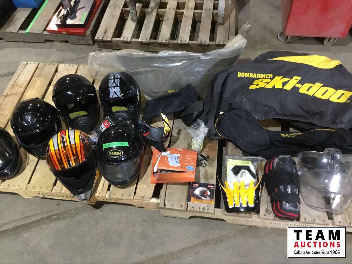 Assorted helmets, snowmobile cover, hydration pack bladders, skidoo windshield