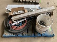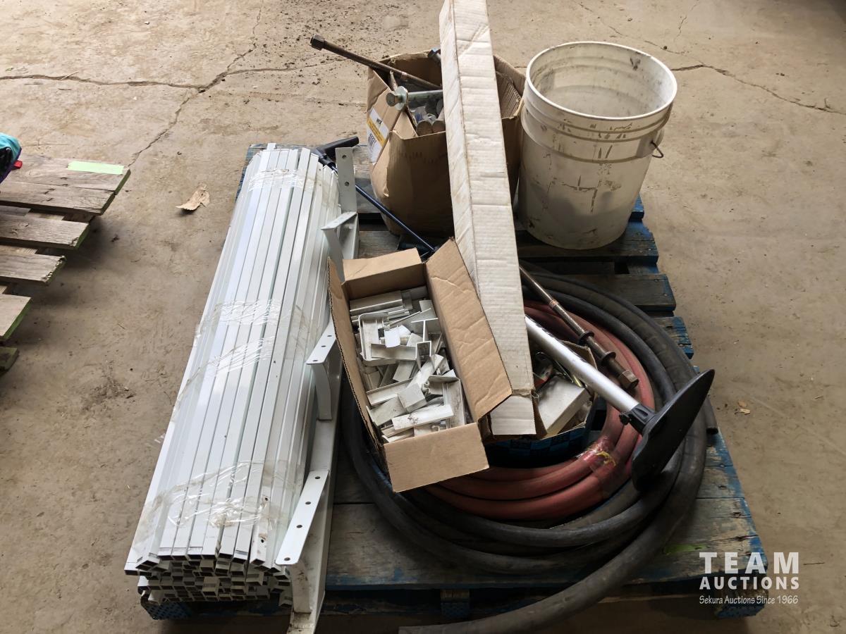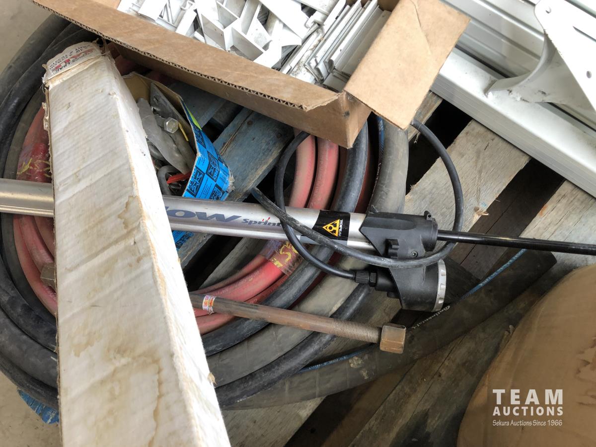 Nuts, bolts, 3 ft X 10 ft truck cover, rubber hoses, sprint pump, metal patio bannister