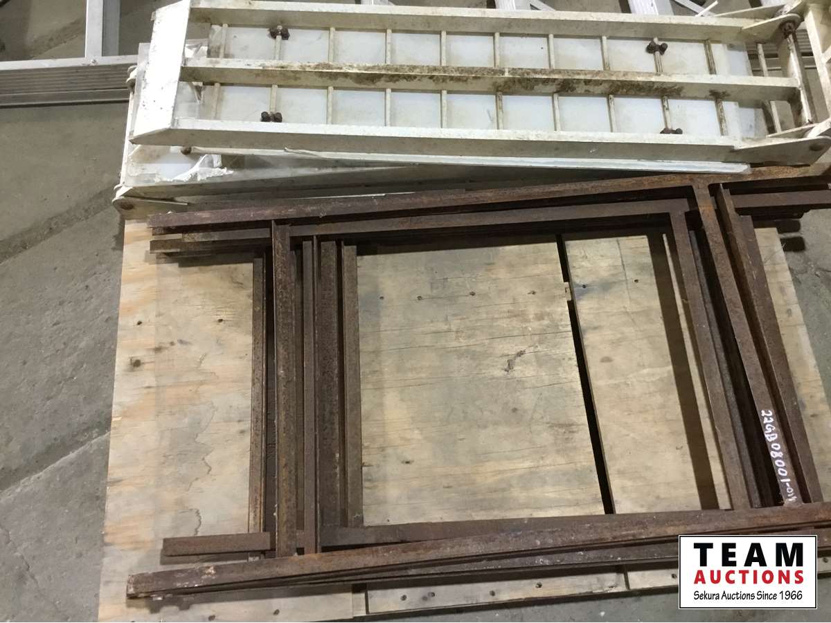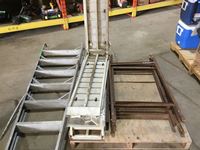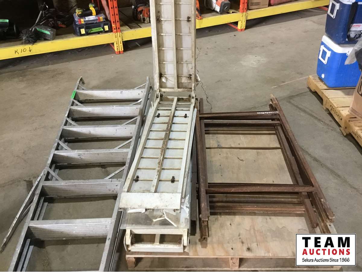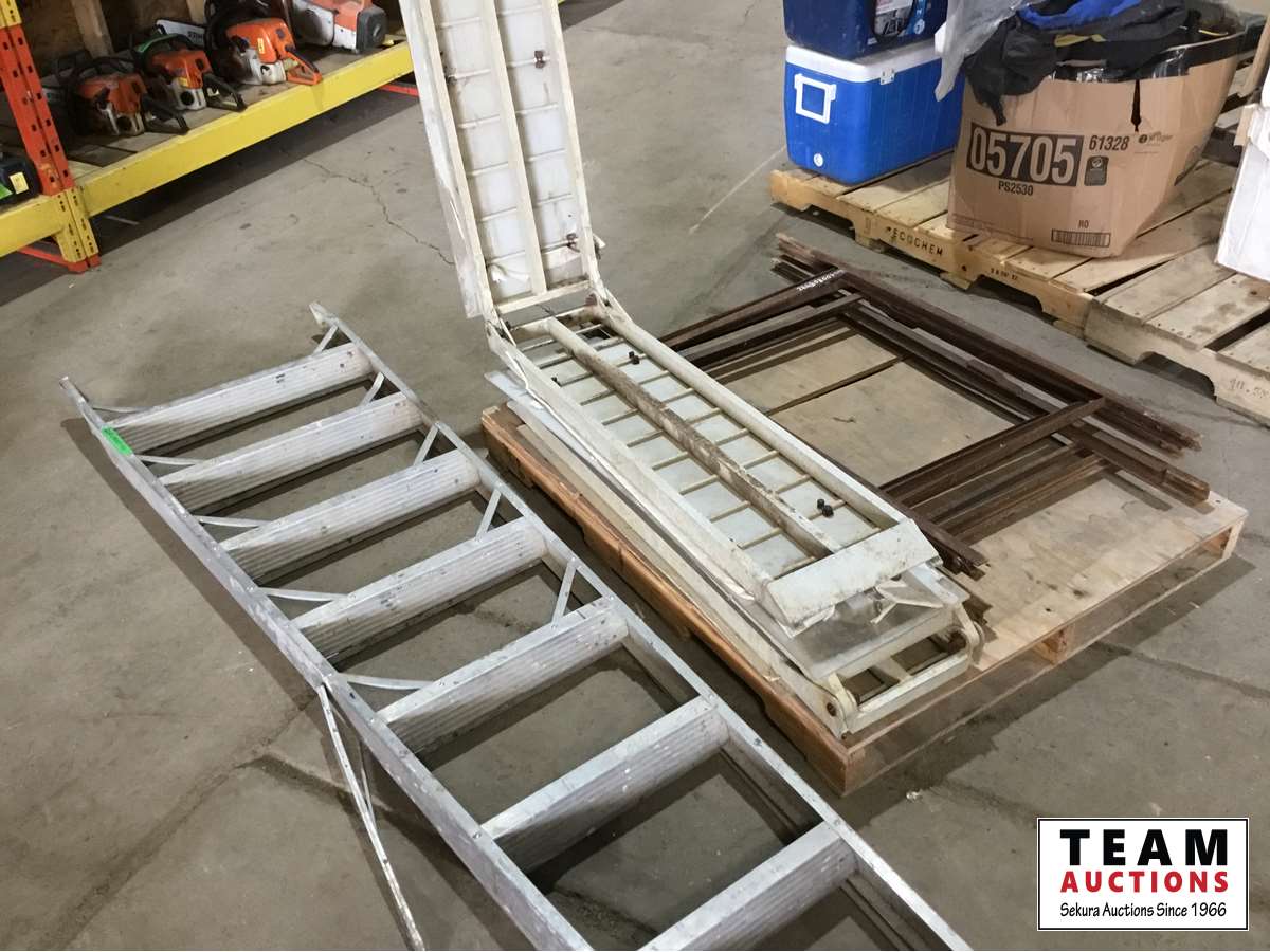 10 ft aluminum ladder (broken), 92 inch aluminum ramps, (3) steel signs