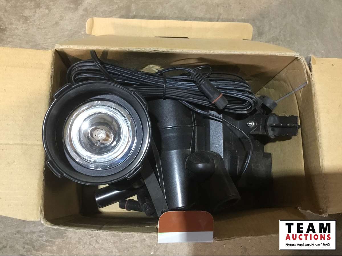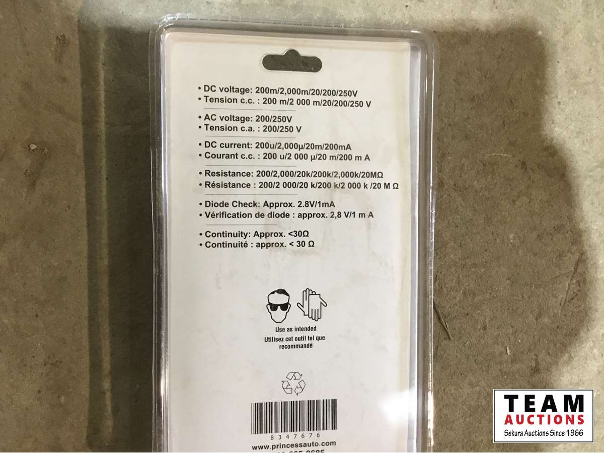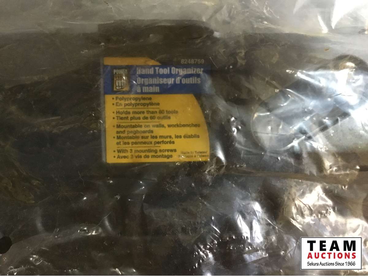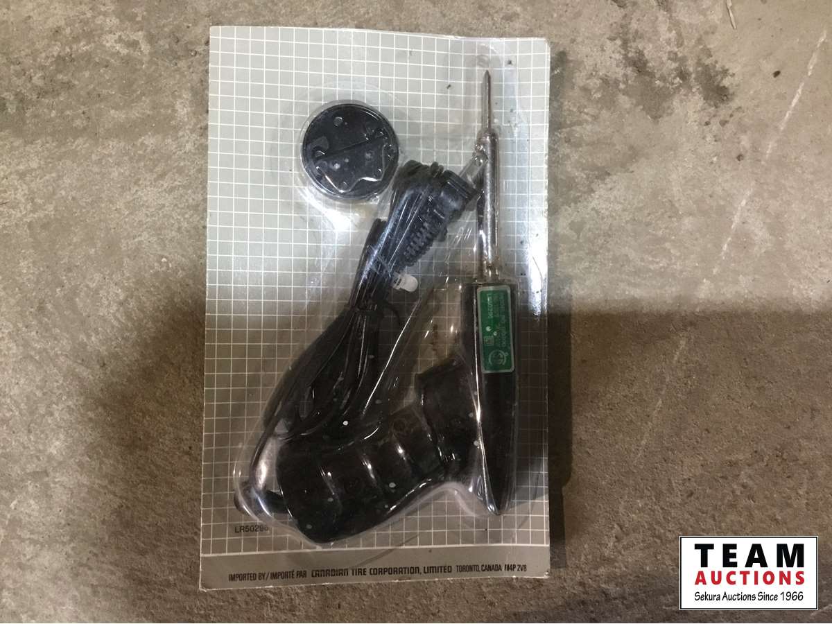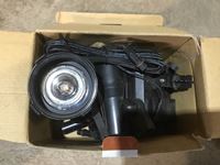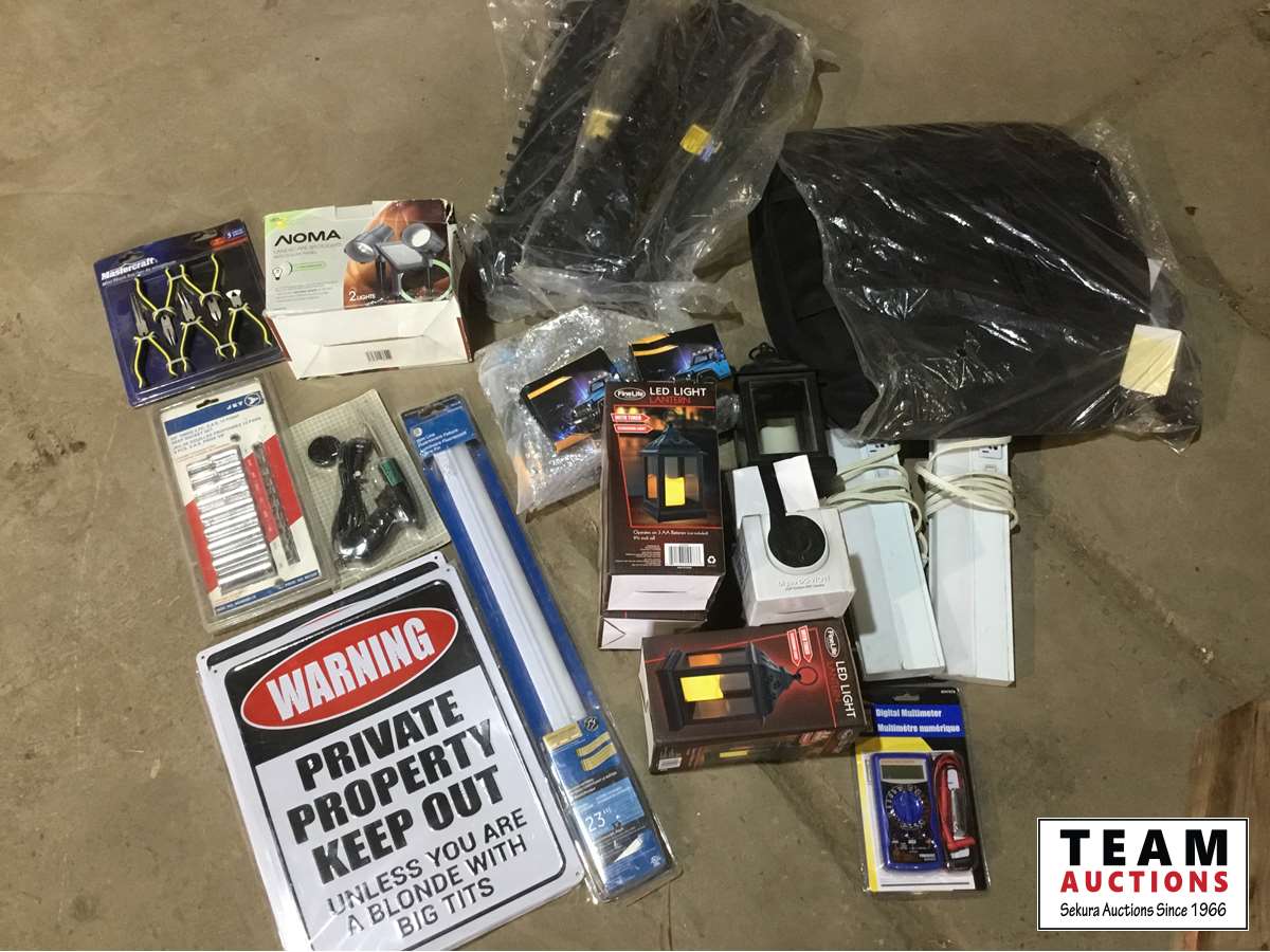 Multimeter, signs, spotlights, mini pliers, soldering gun, Jet socket set, LED work lights, qty of miscellaneous lights, tool organizer