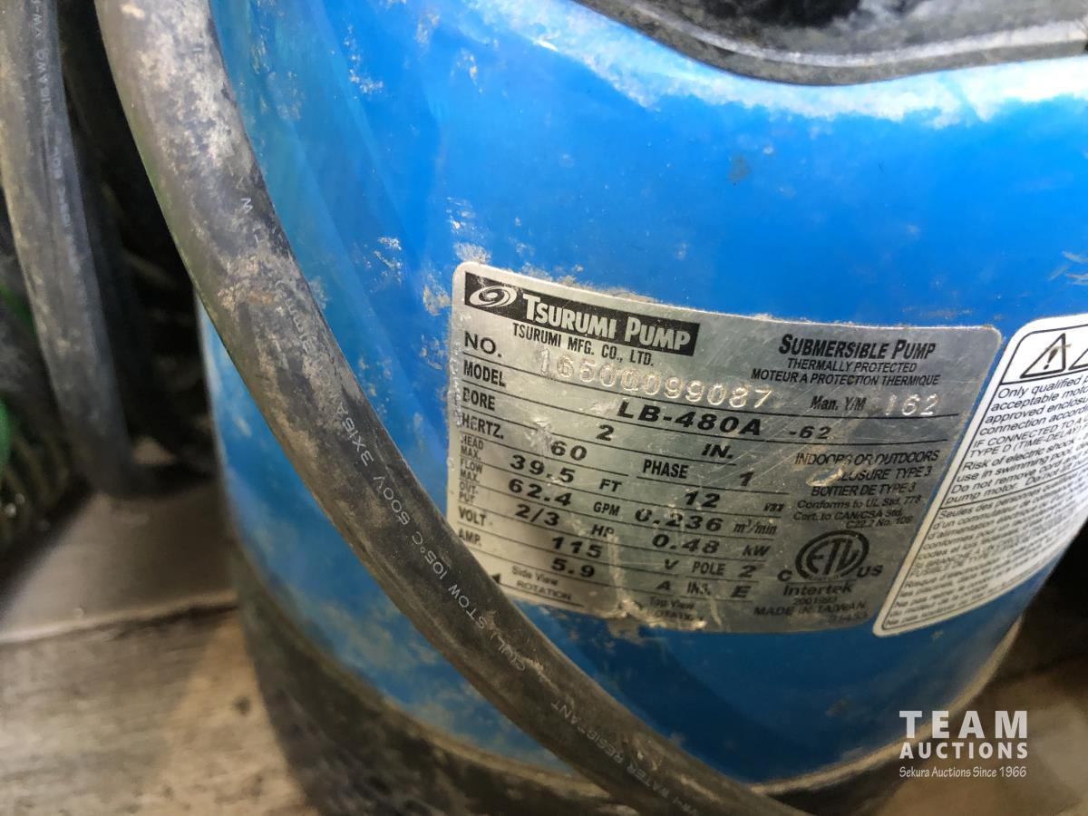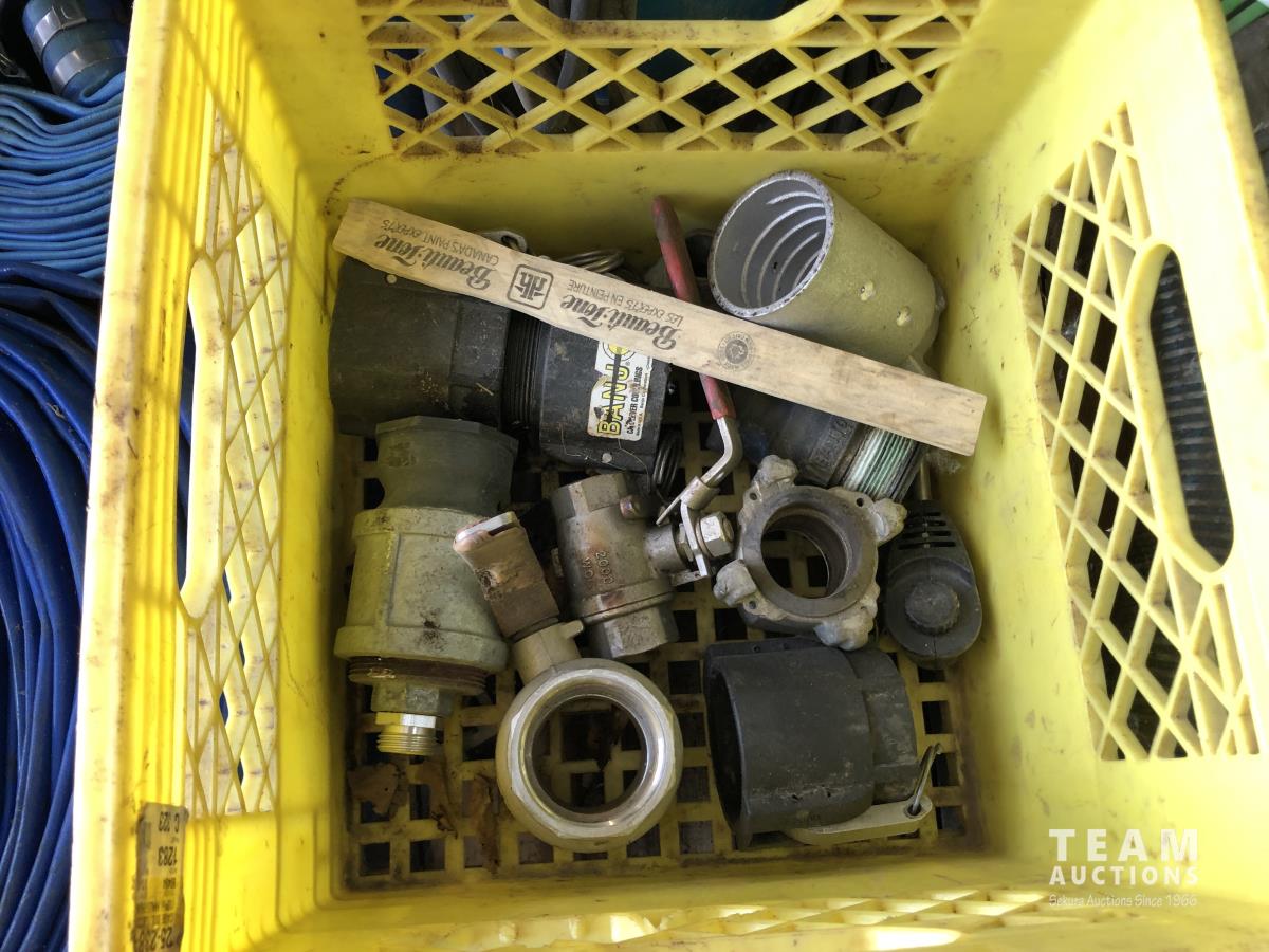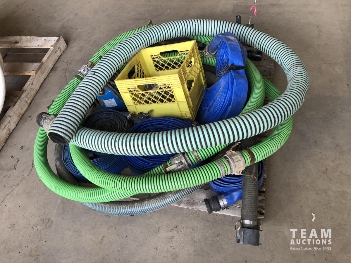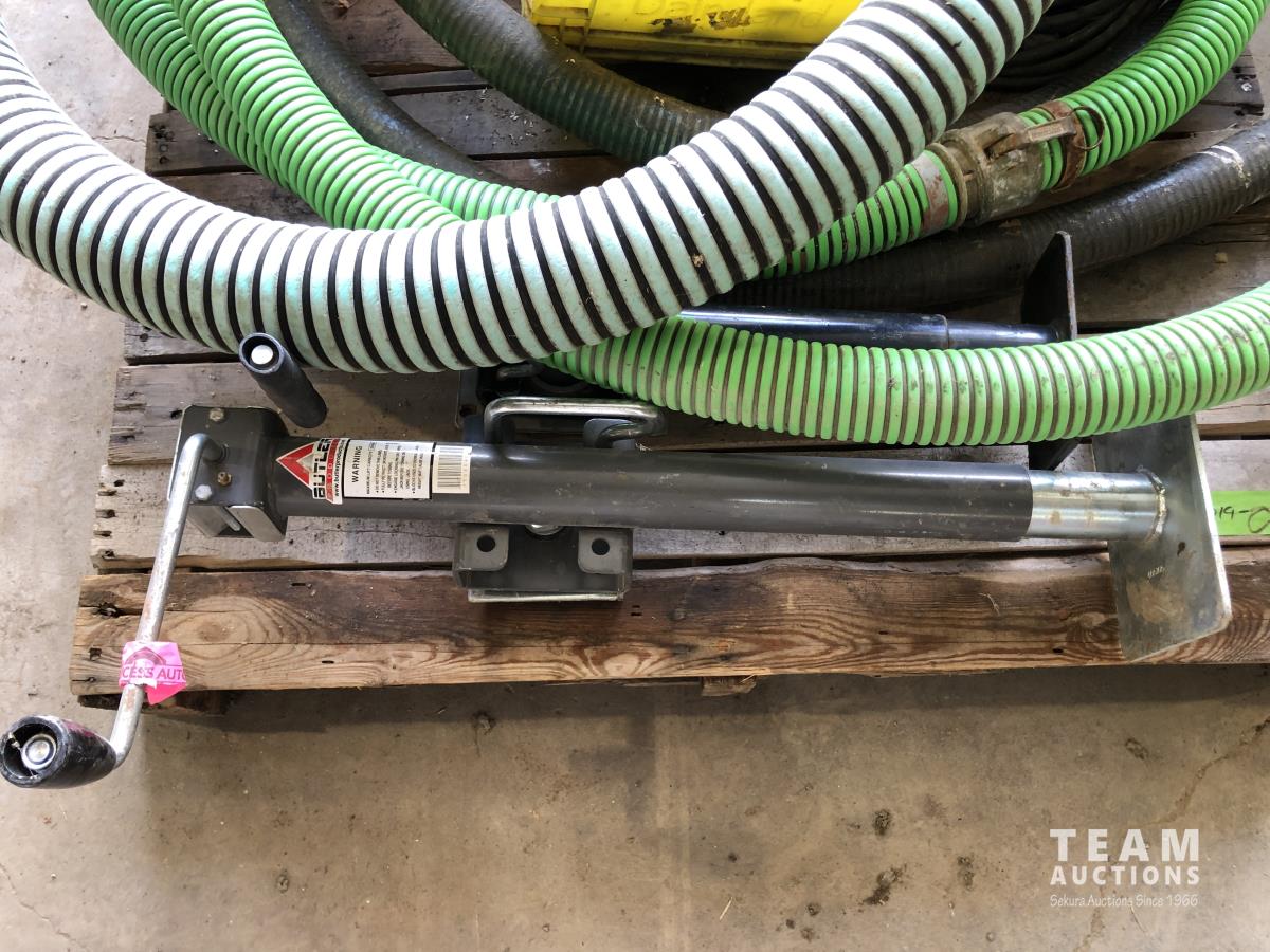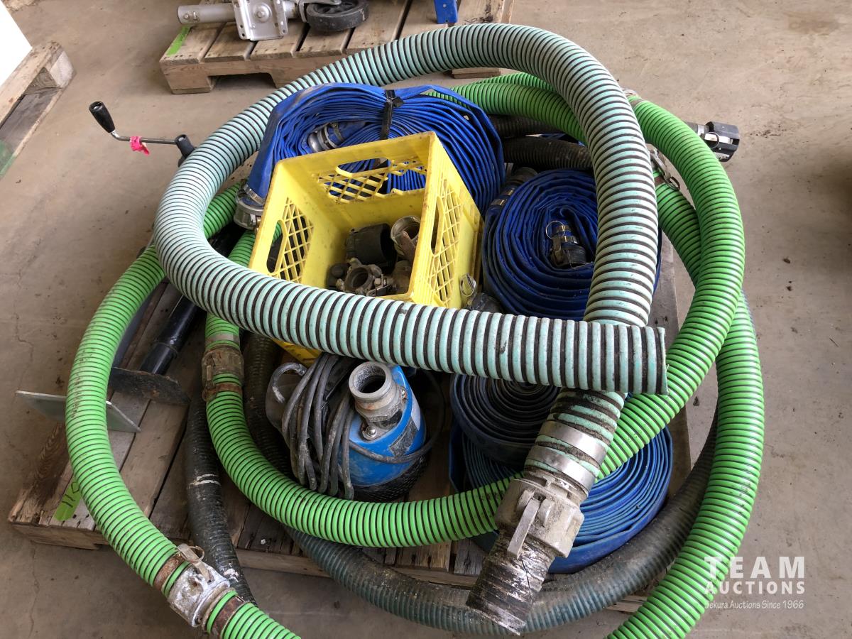 lay flay hose, camlocks and valves, trailer jacks, 2 inch submersible pump, assortment of suction hoses