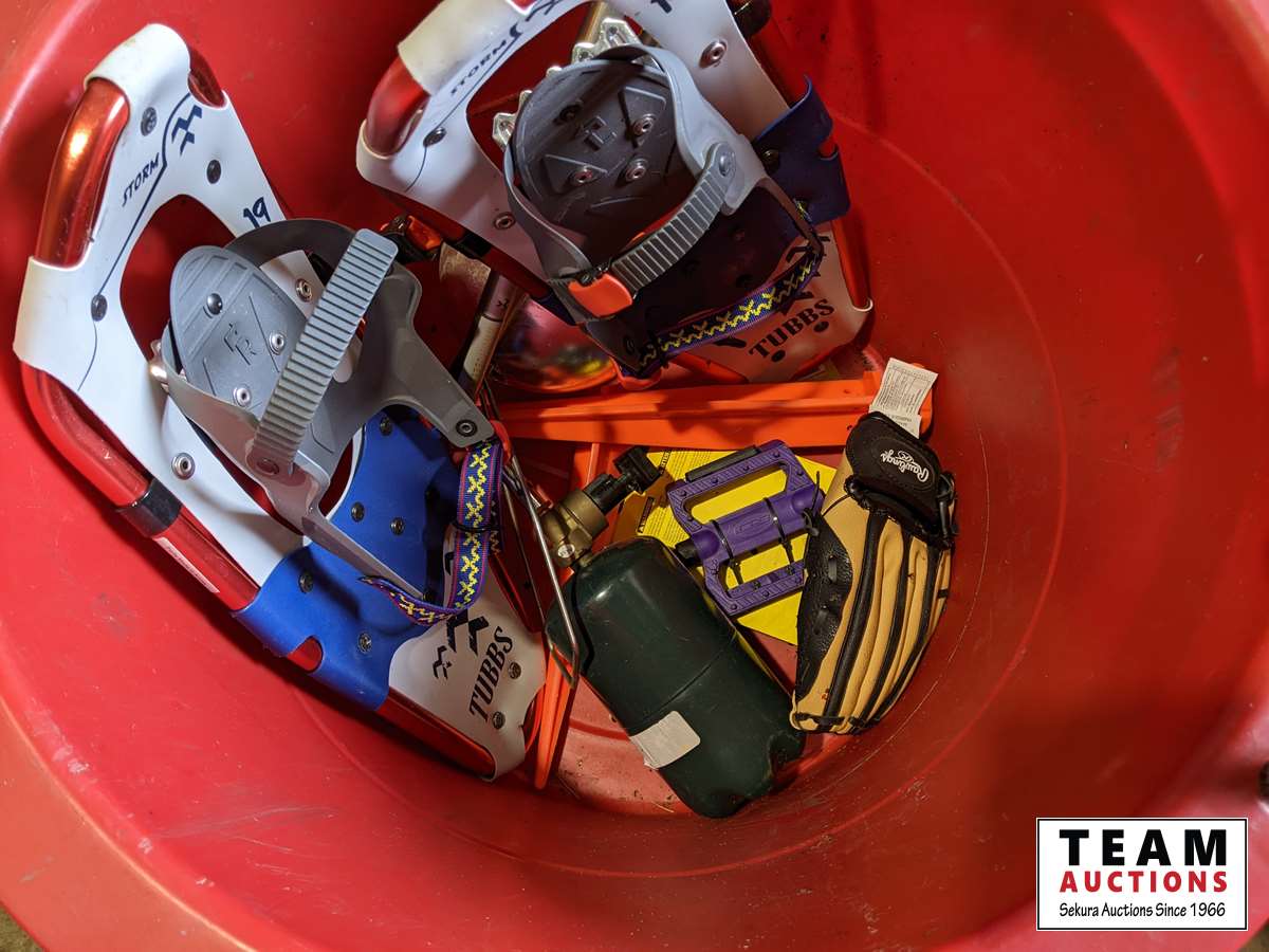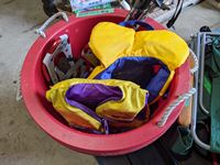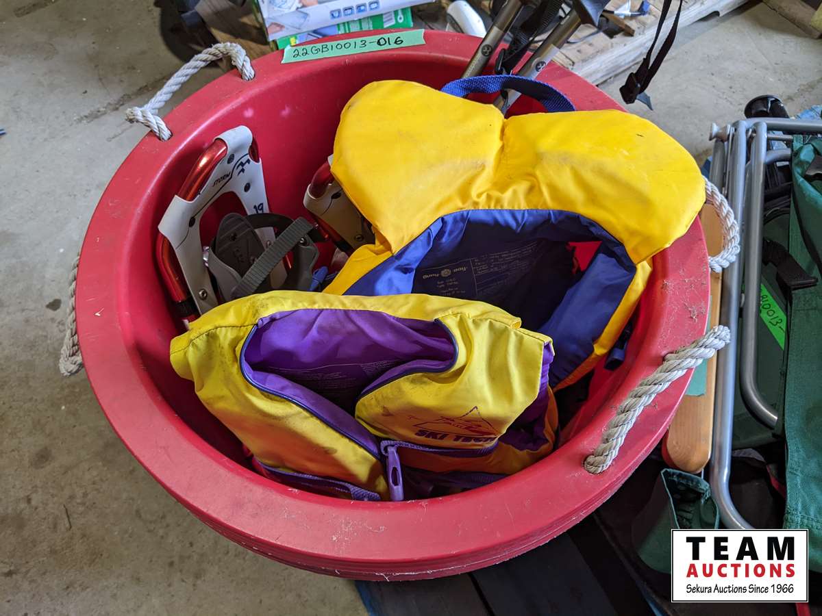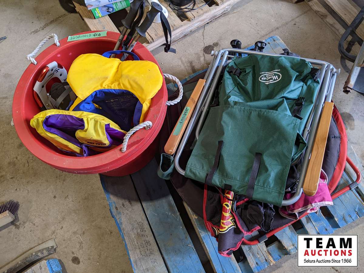 Camping chairs, bins, snowshoes, dome tent, childrenès life jackets