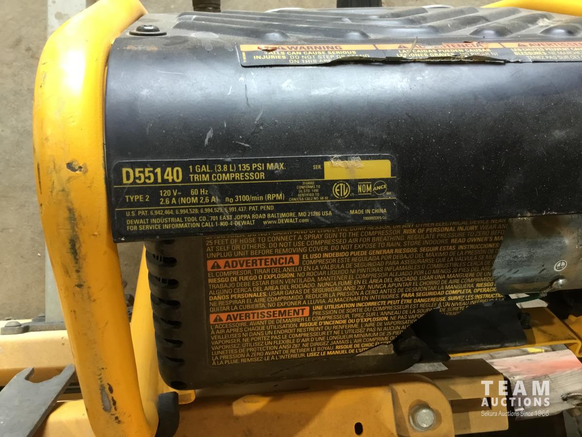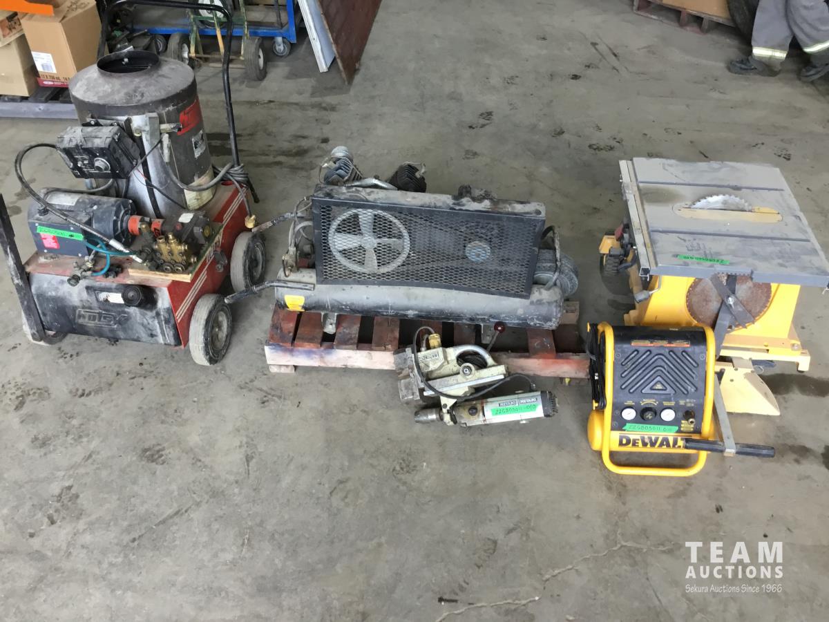 DeWalt table saw, IMC air compressor, magnetic drill press, DeWalt 1 gal trim compressor, Hotsy washer