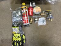 Clamps, valves, thread locker, electrical tape, cut resistant gloves, winter hard hat liners
