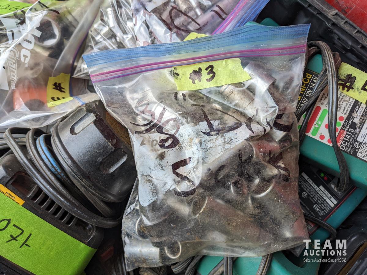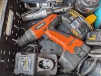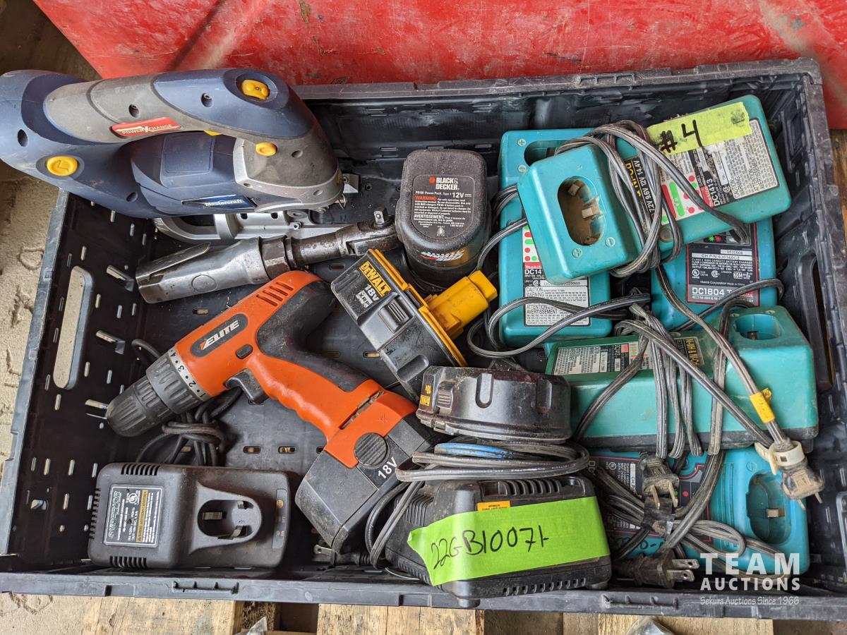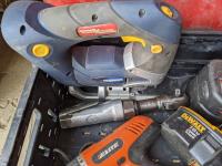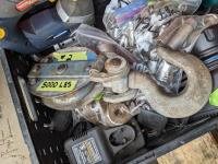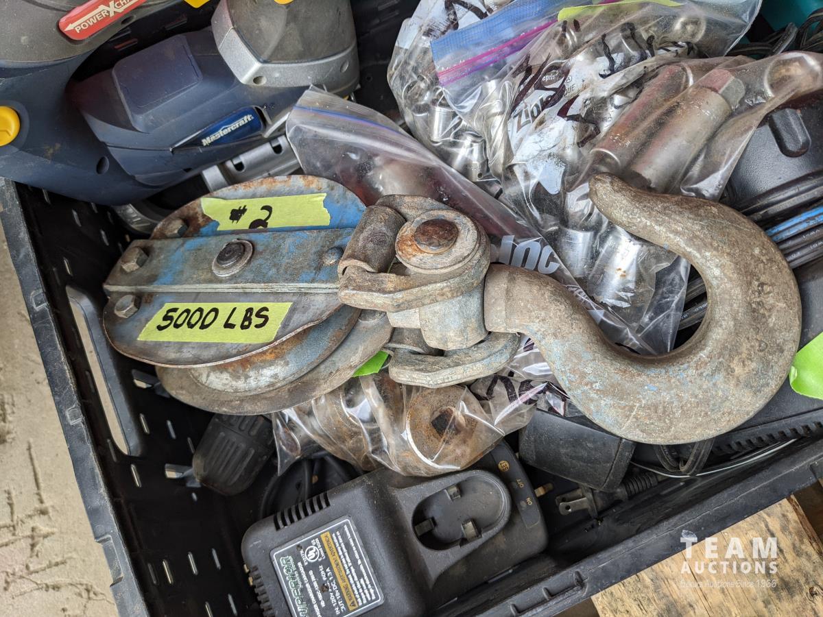 5,000lb snatch block, 12 inch pully, assorted sockets, cordless drill and jigsaw w/ batteries and chargers