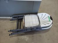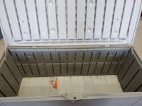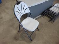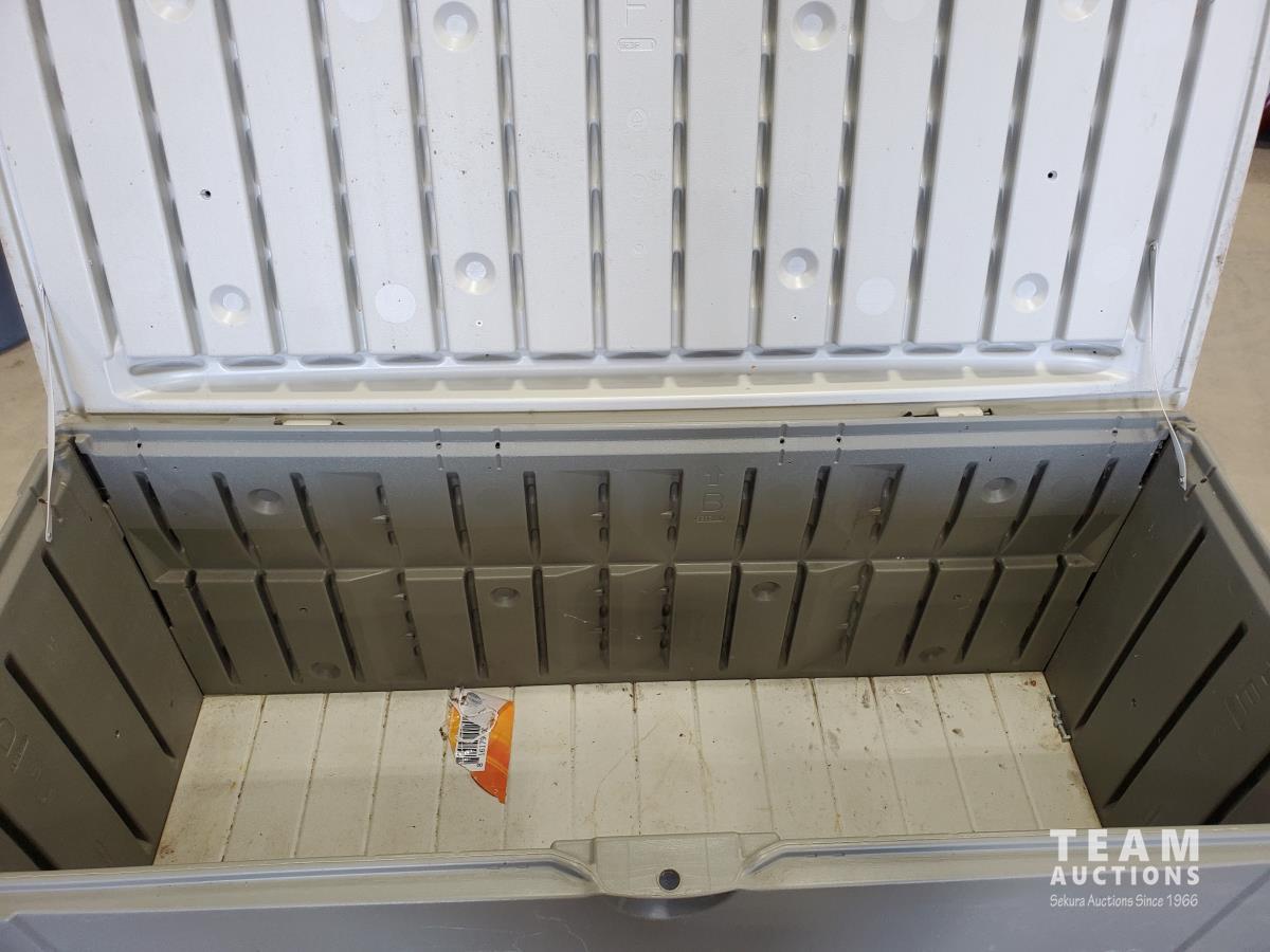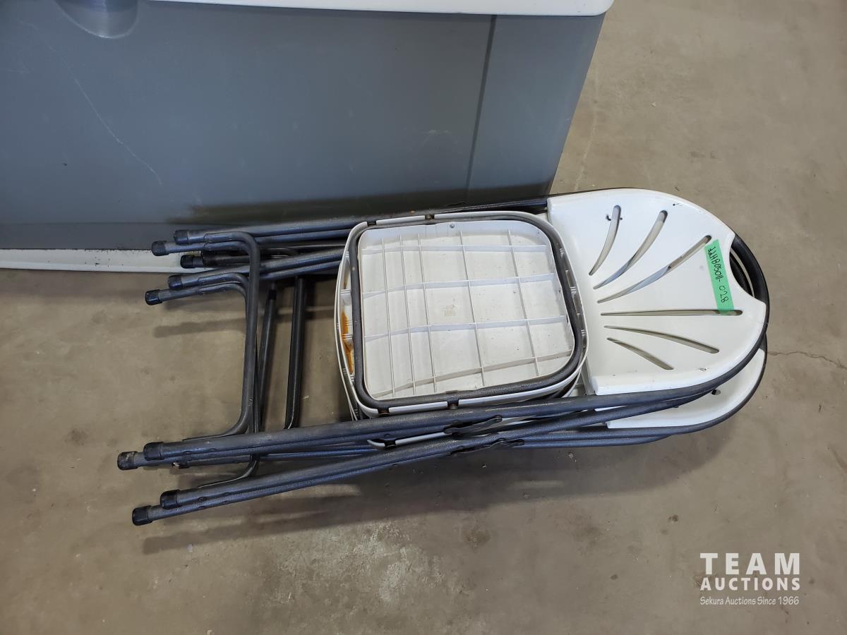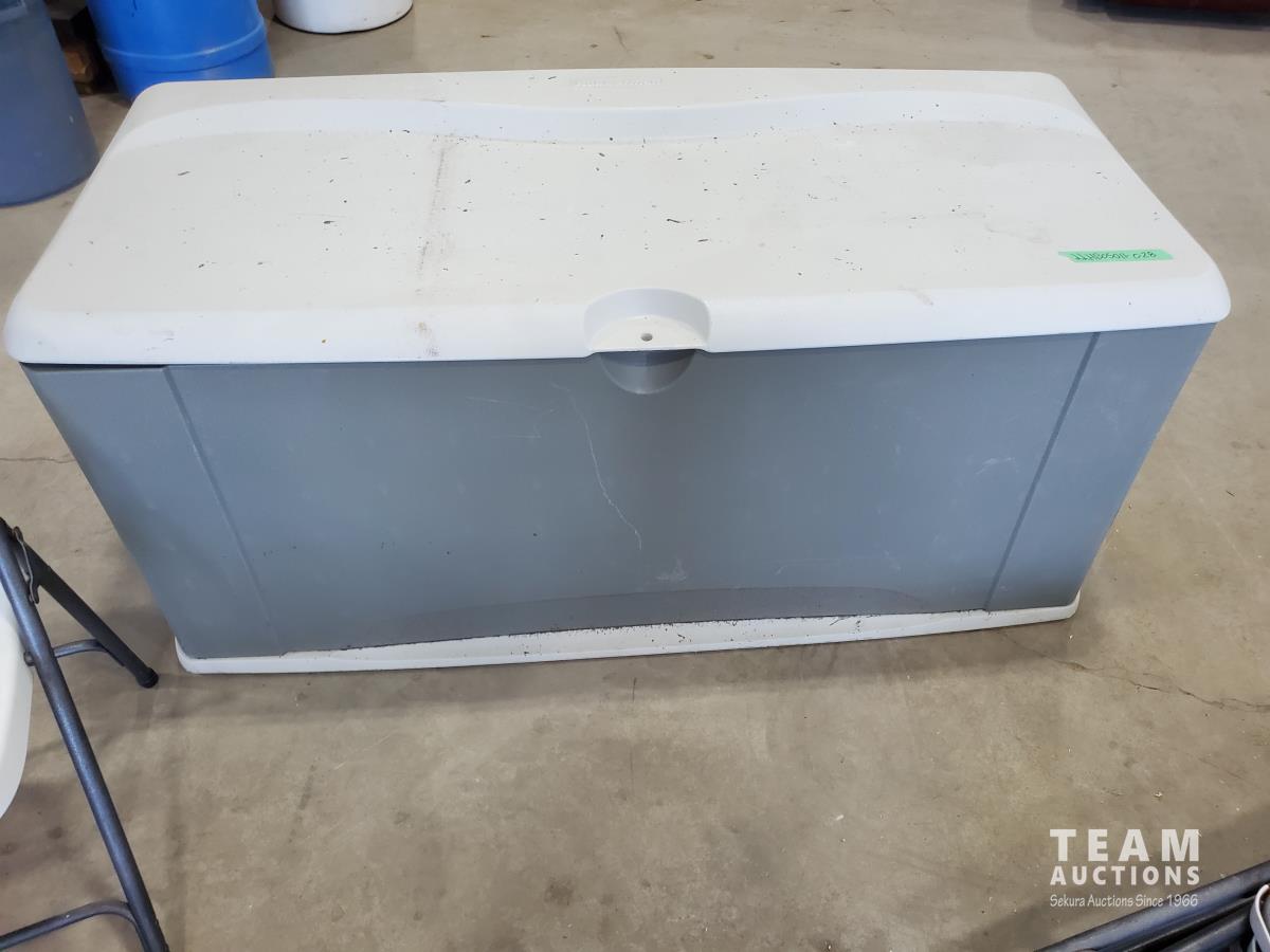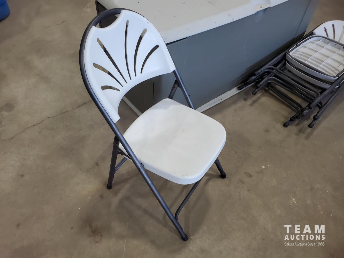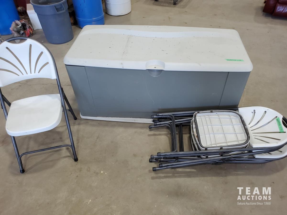 1560 (5) Plastic Folding Chairs and Rubbermaid Outdoor Storage Box