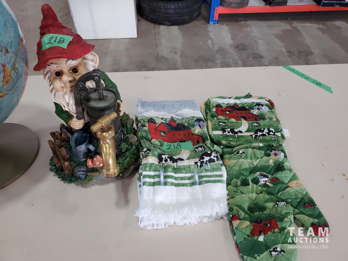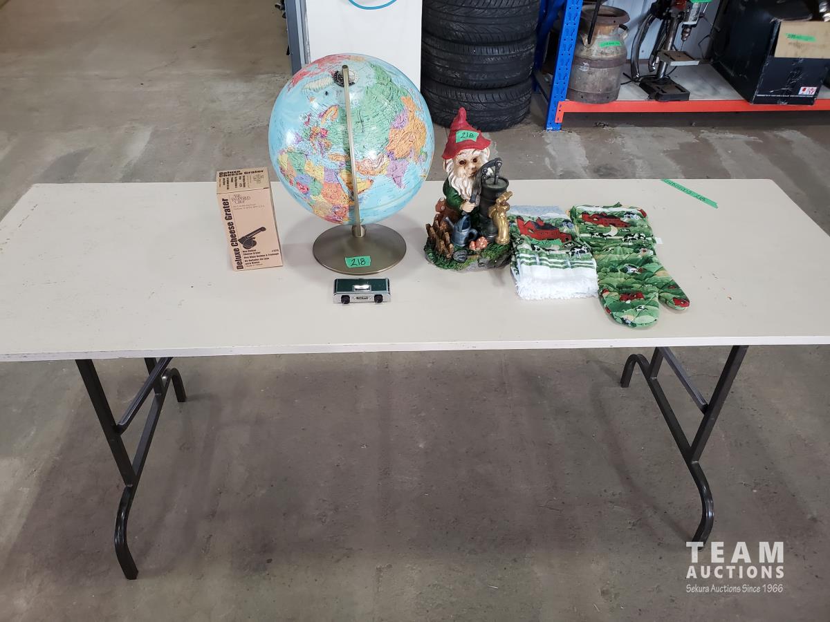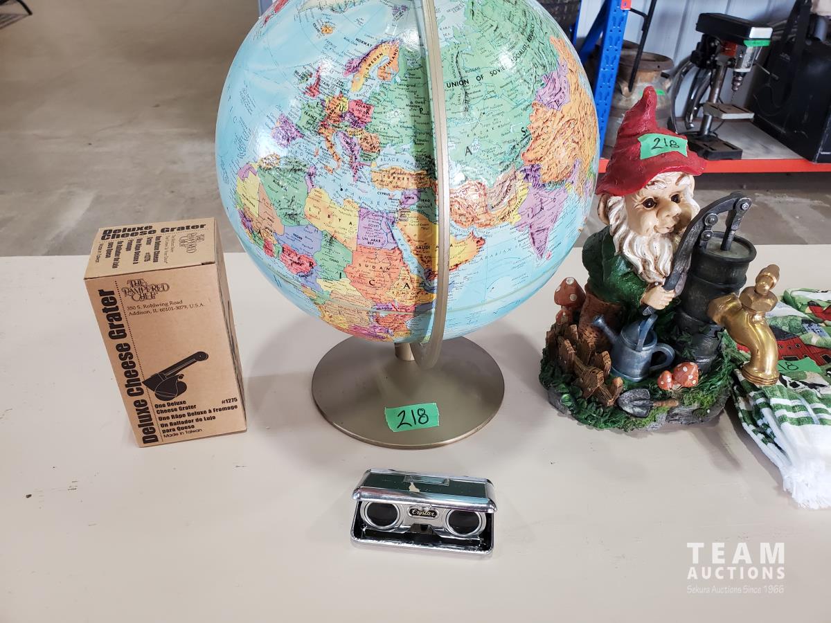 1447 Antique Binoculars, Vintage Globe, Gnome Fountain, Folding Table