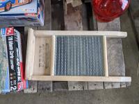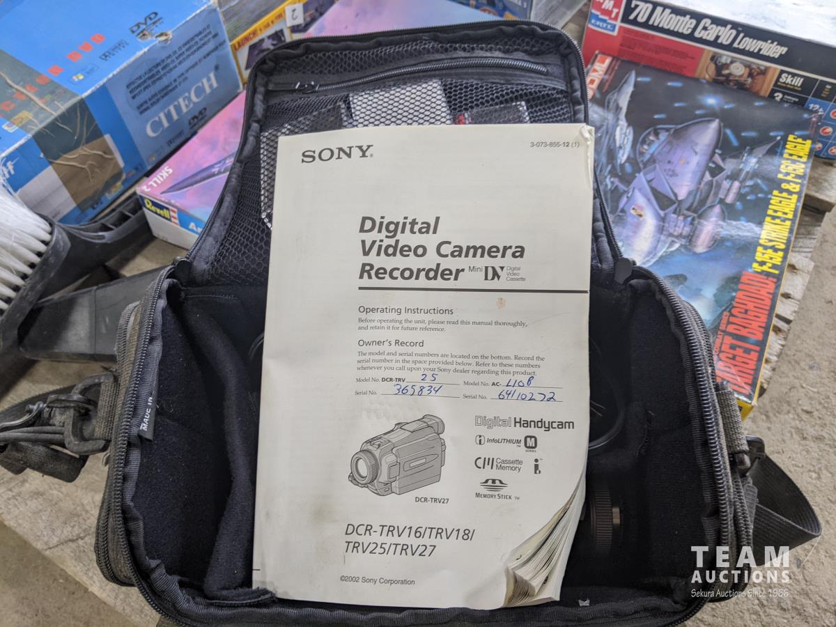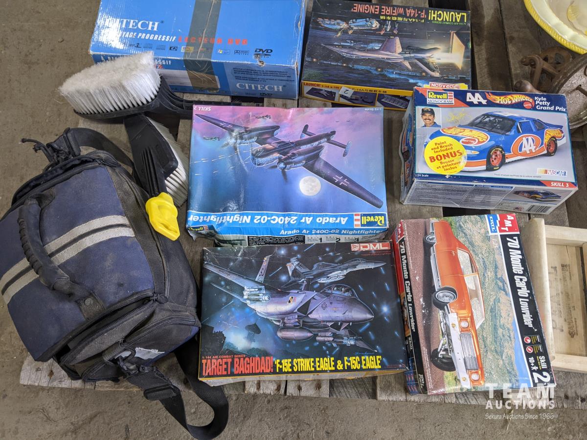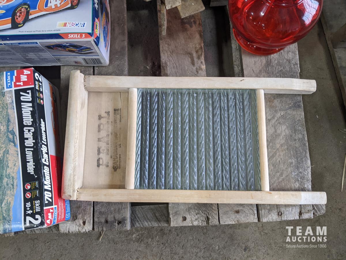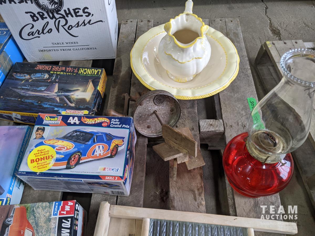 video camera, model planes, diecast cars, antique wash board, oil lamp, antique butter churn, dvd players