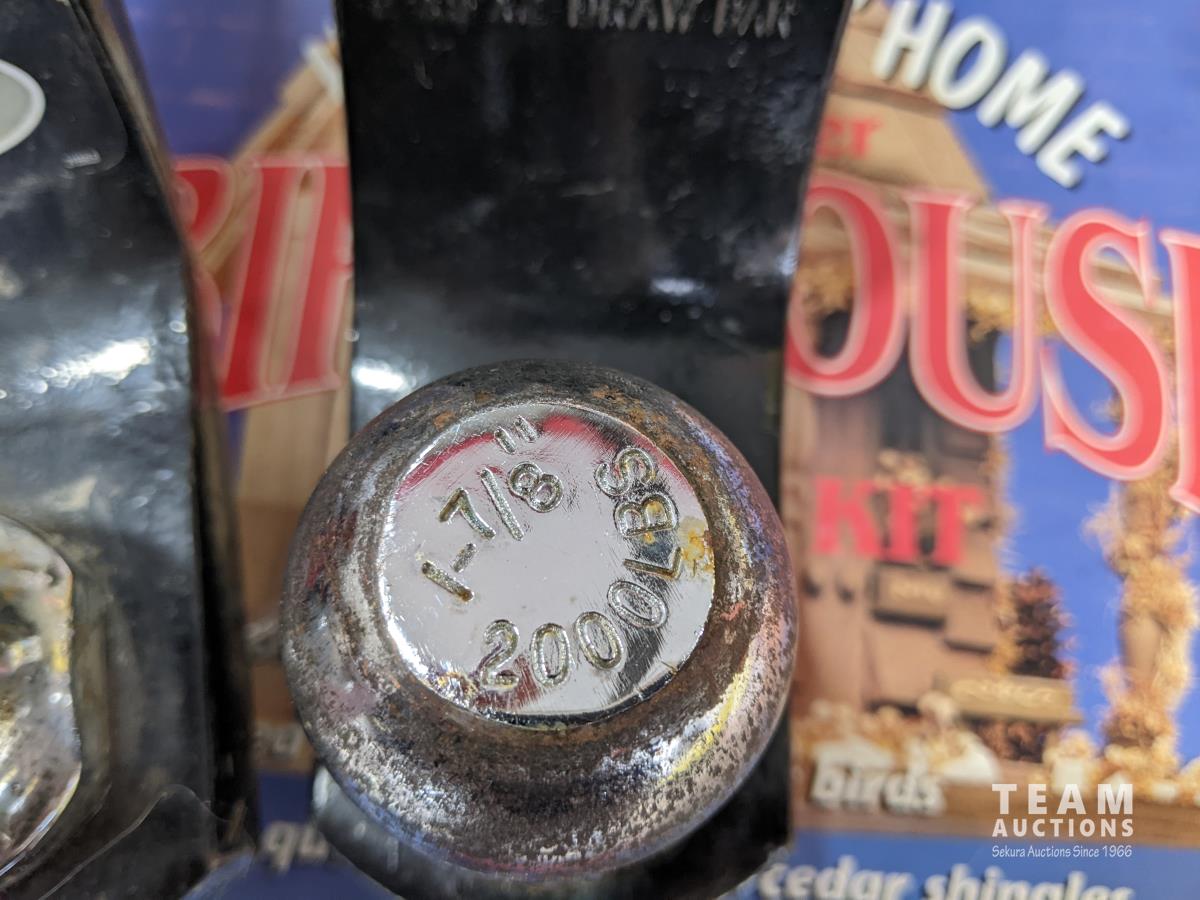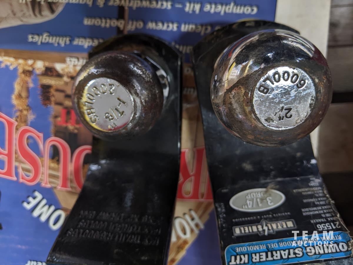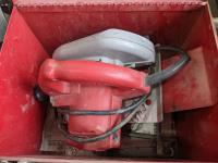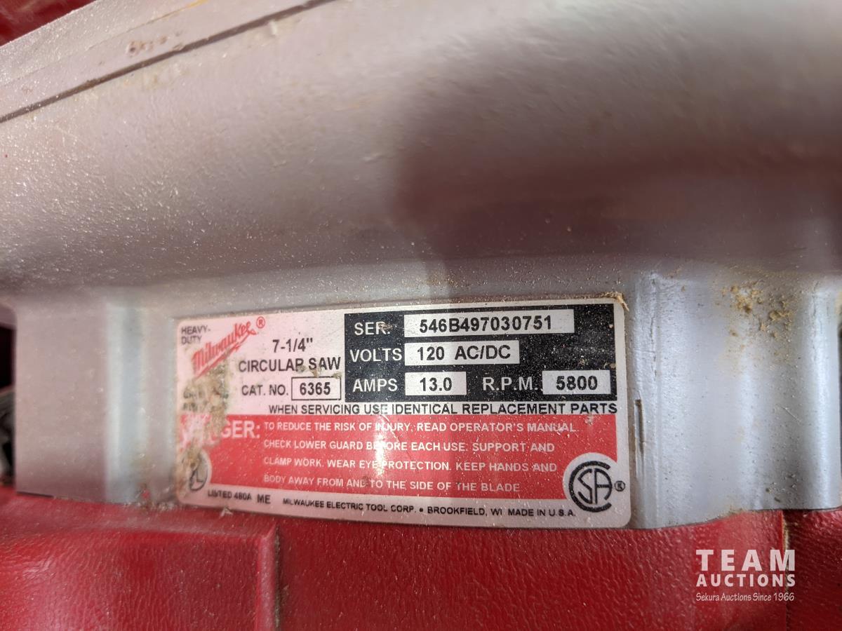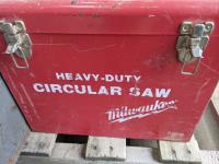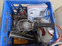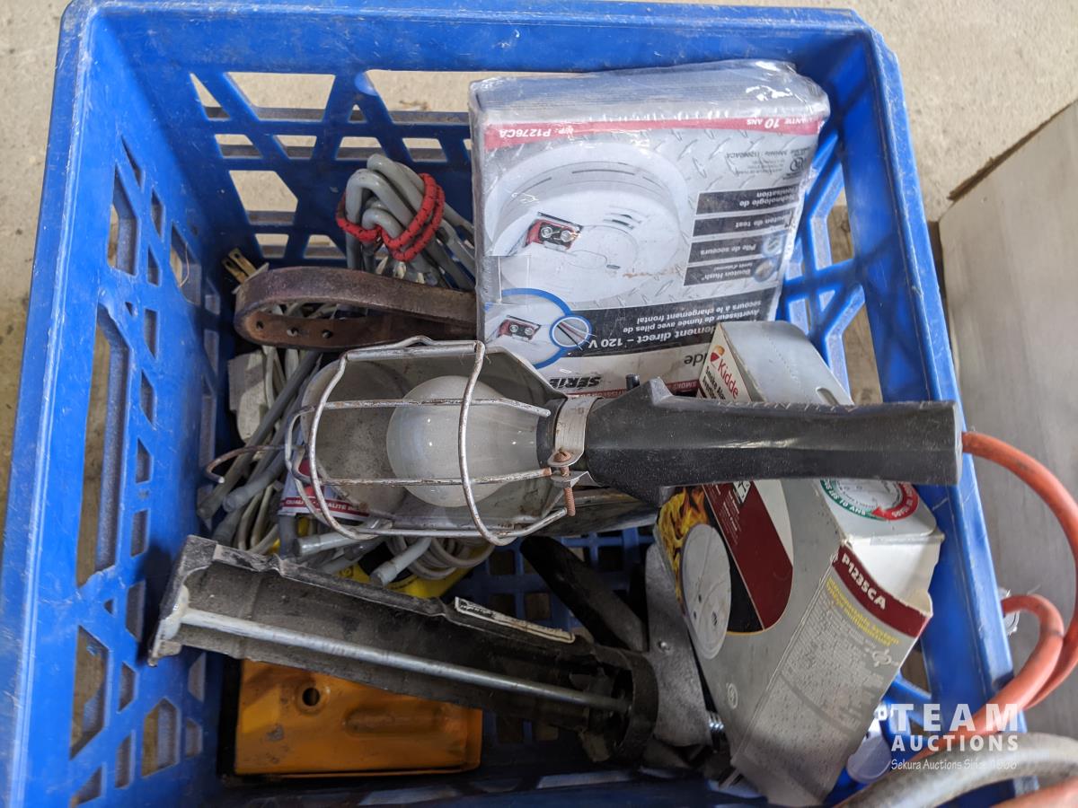 tool box with assorted tools, Milwaukee 7-1/4 inch circular saw, (2) ball hitches 1-7/8 inch and 2 inch, trouble light, caulking gun, chalk line, (2) smoke detectors, box of metal parts, birdhouse kit, (4) horseshoes