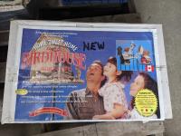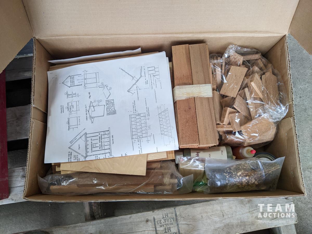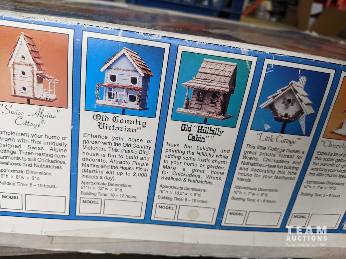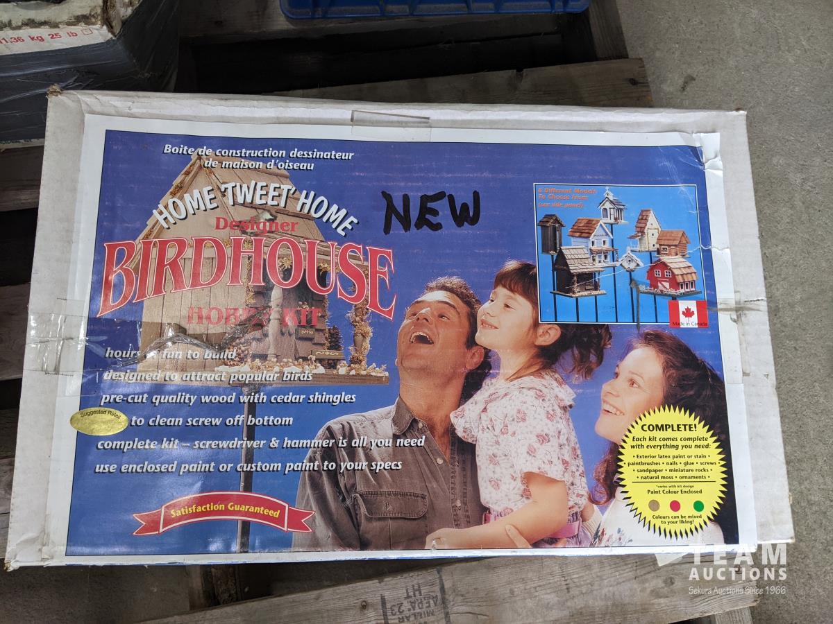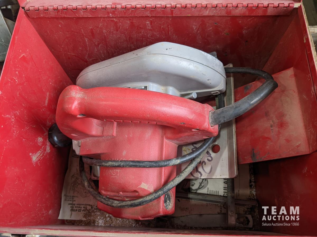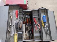 tool box with assorted tools, Milwaukee 7-1/4 inch circular saw, (2) ball hitches 1-7/8 inch and 2 inch, trouble light, caulking gun, chalk line, (2) smoke detectors, box of metal parts, birdhouse kit, (4) horseshoes