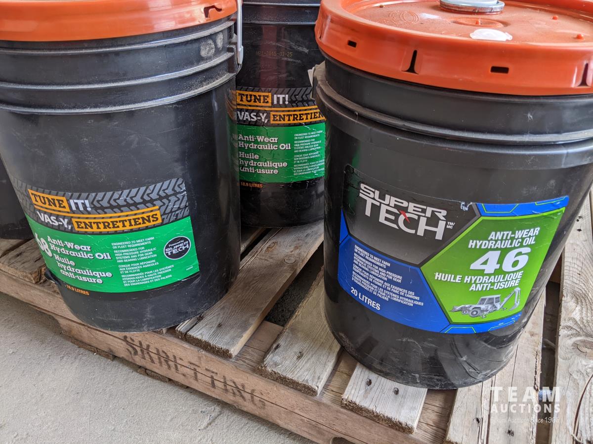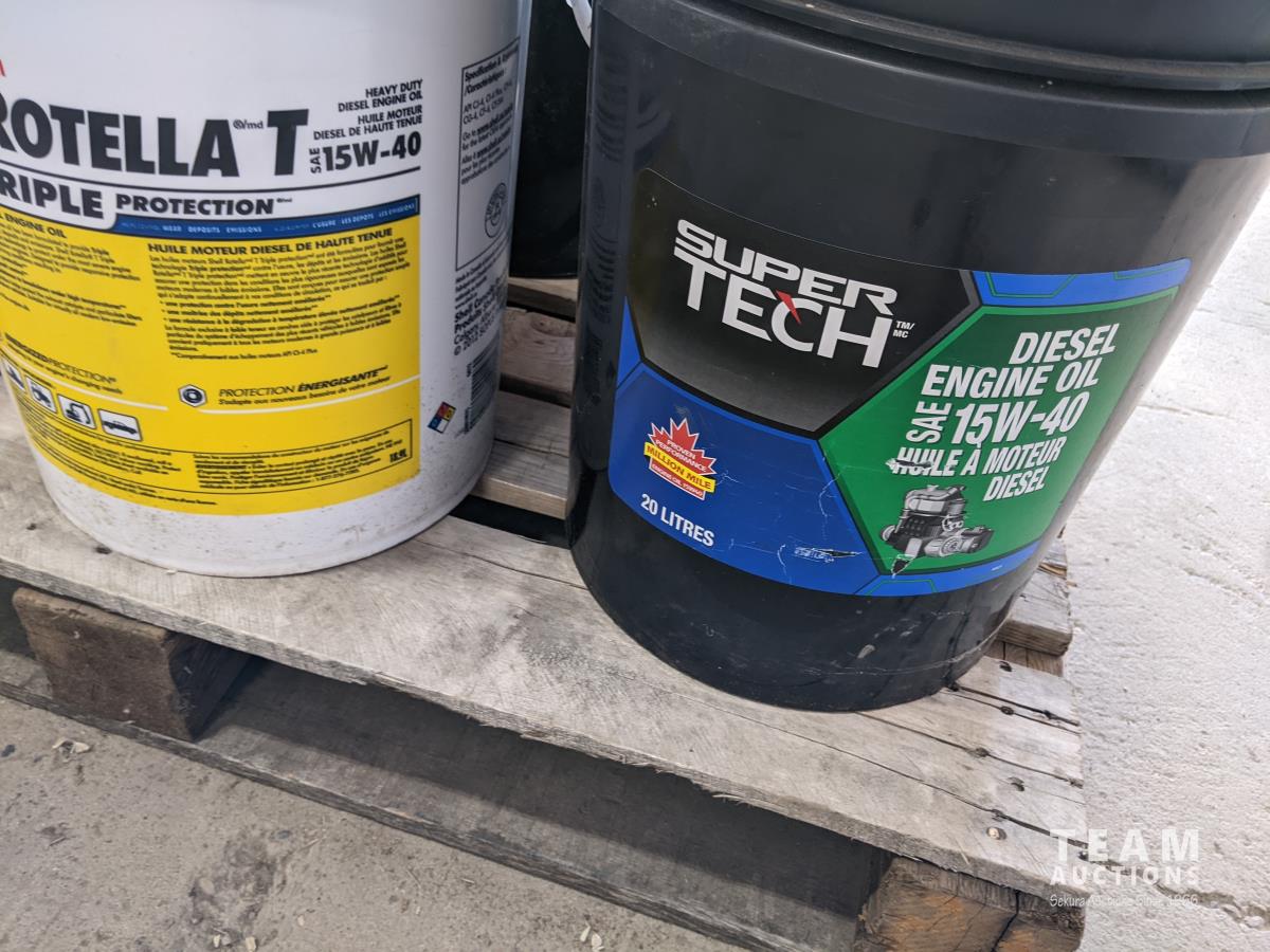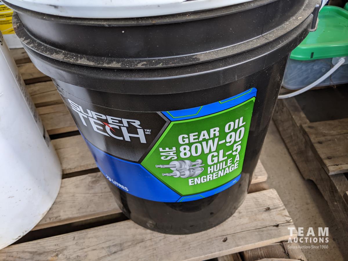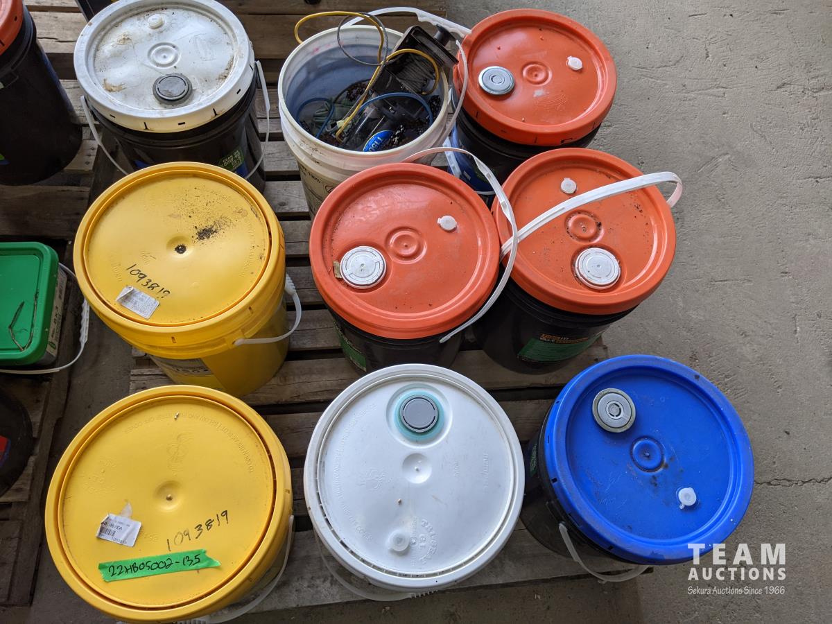 Pails of hydraulic oil (x3), pails of 15W40 motor oil (x2), 18kg grease (x2), pail of gear grease (x1), pail of assorted tools (x1)