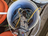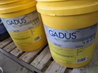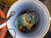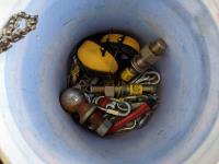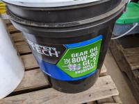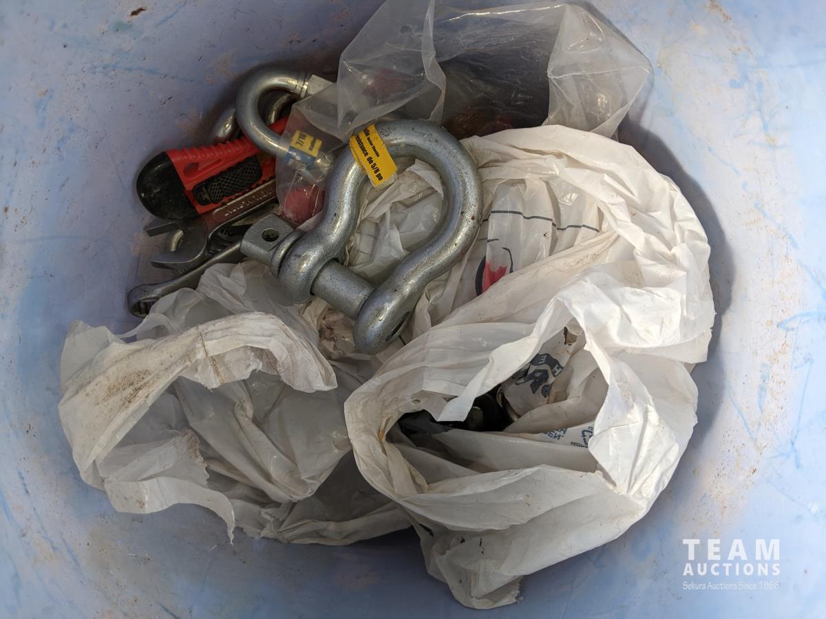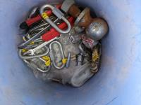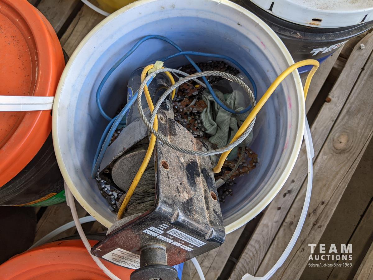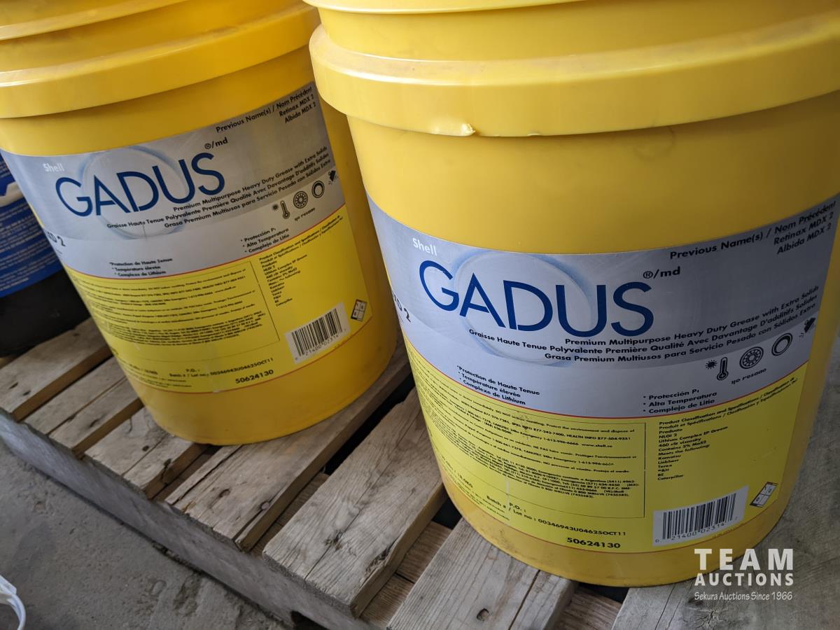 Pails of hydraulic oil (x3), pails of 15W40 motor oil (x2), 18kg grease (x2), pail of gear grease (x1), pail of assorted tools (x1)