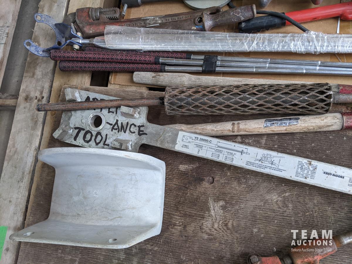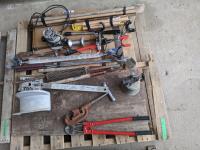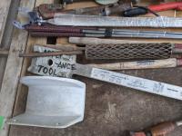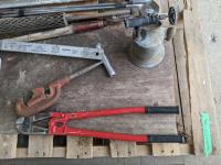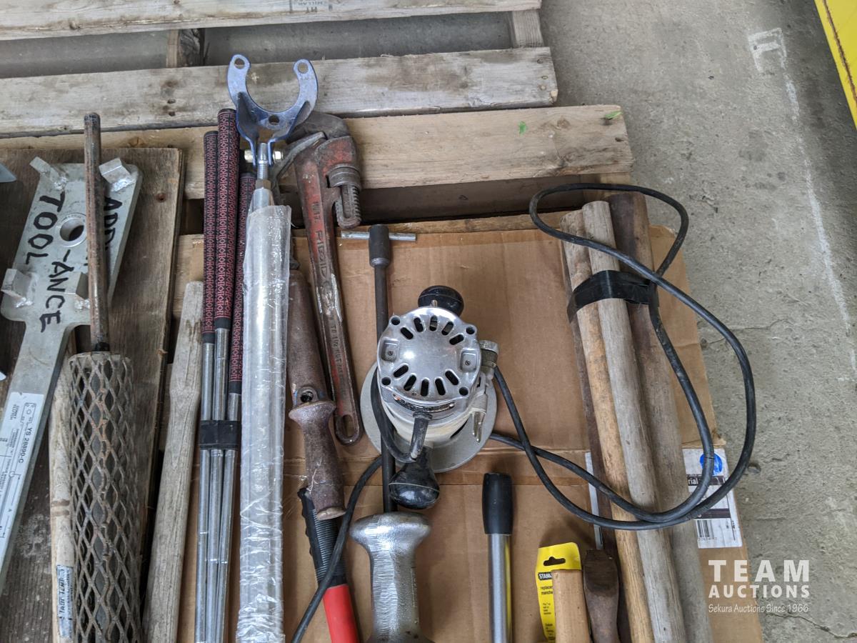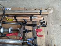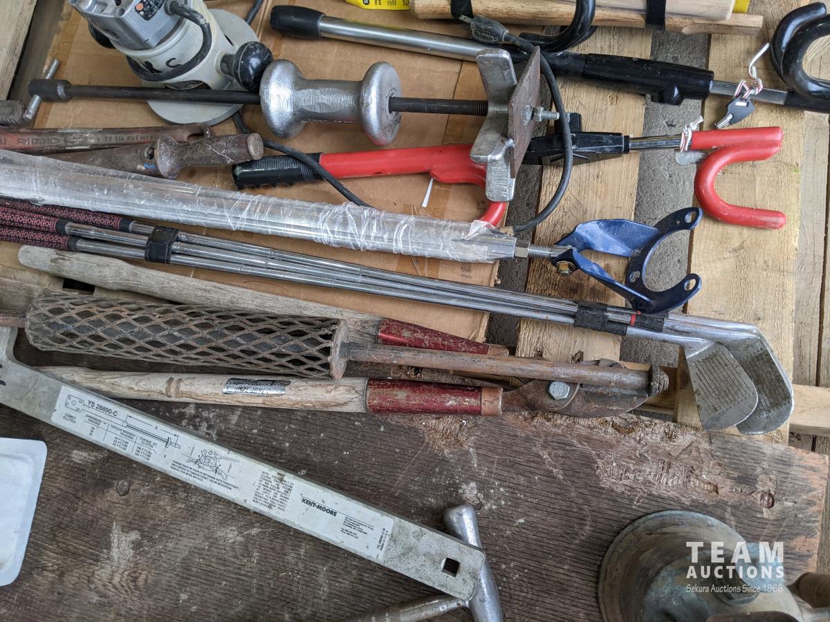 Antique oiler, bolt cutters, shears, (3) golf clubs, (6) hammer handles, (5) axe handles, Rigid 1-1/4 inch pipe wrench, Kenmore appliance tool, (2) steeling wheel locks, slide hammer, Black & Decker router, Rigid pipe cutter, spreader bar