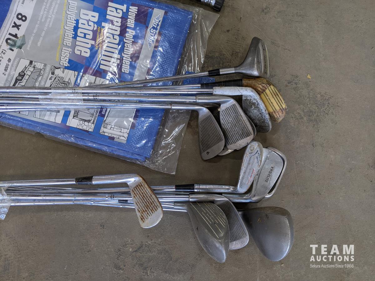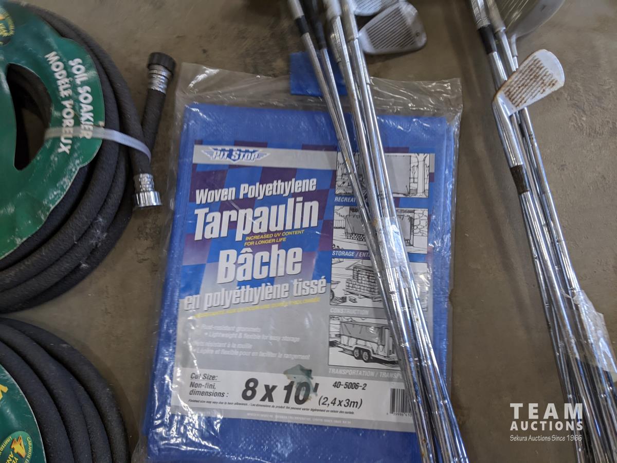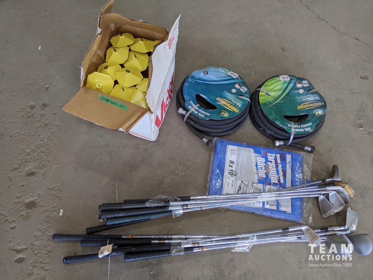1196 Qty of Bee Traps, Golf Clubs, Soaker Hoses, Tarp