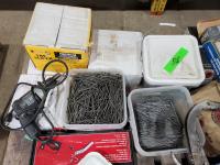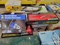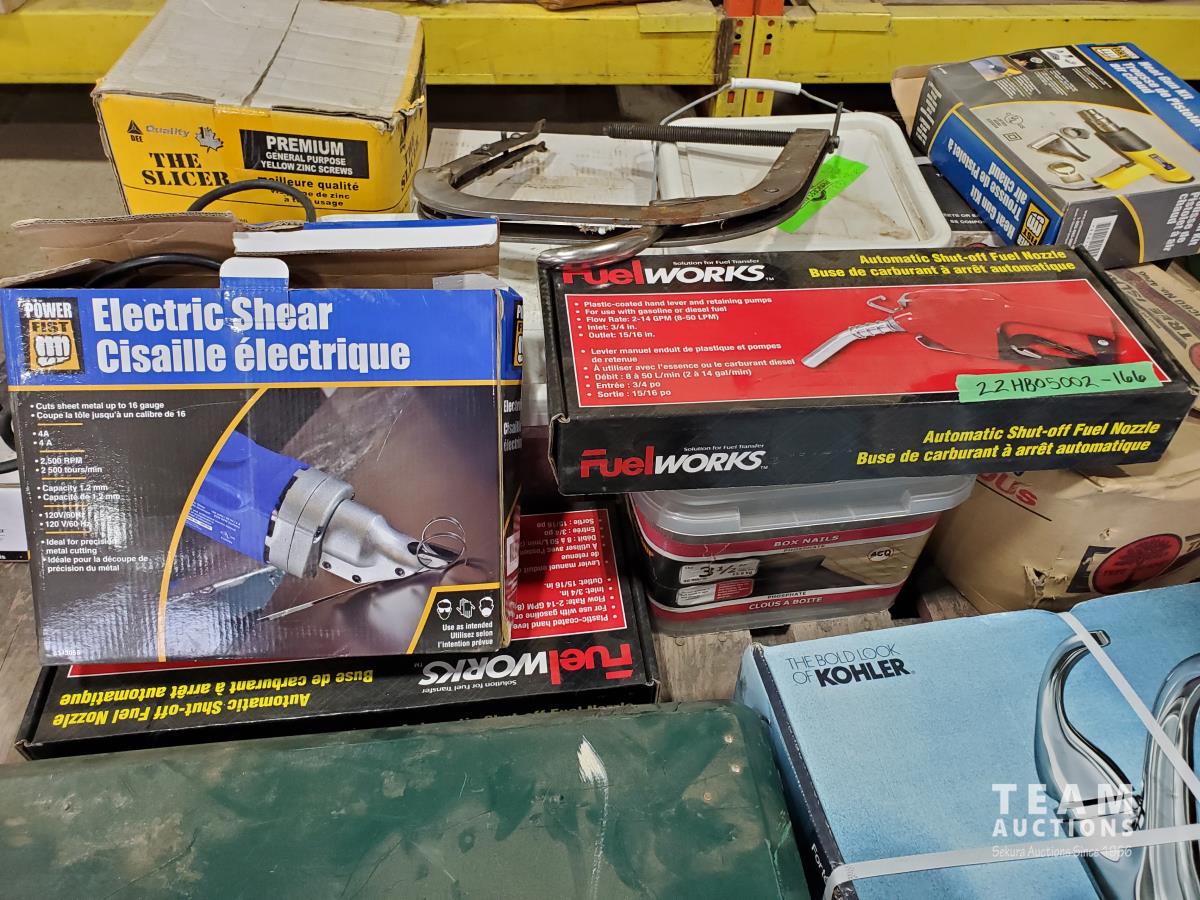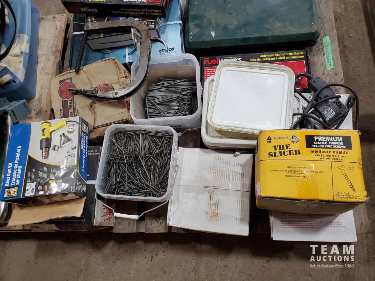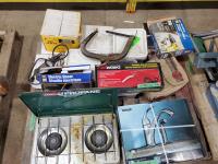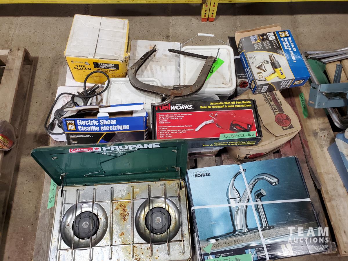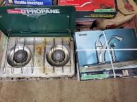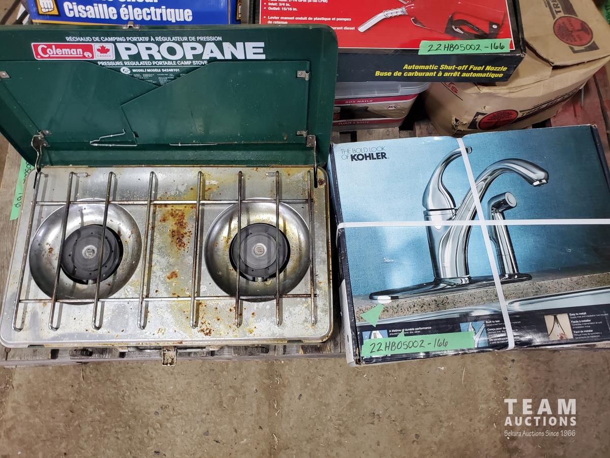 Kitchen faucet (x2), fuel nozzle (new), heat gun, electric shears, boxes of nails & screws, Coleman portable camp stove
