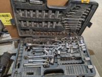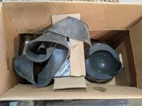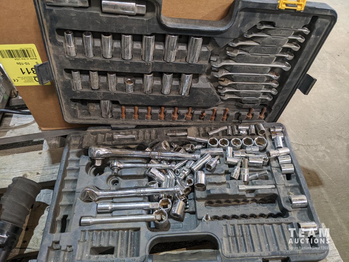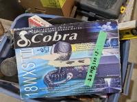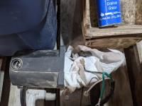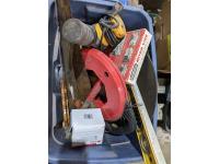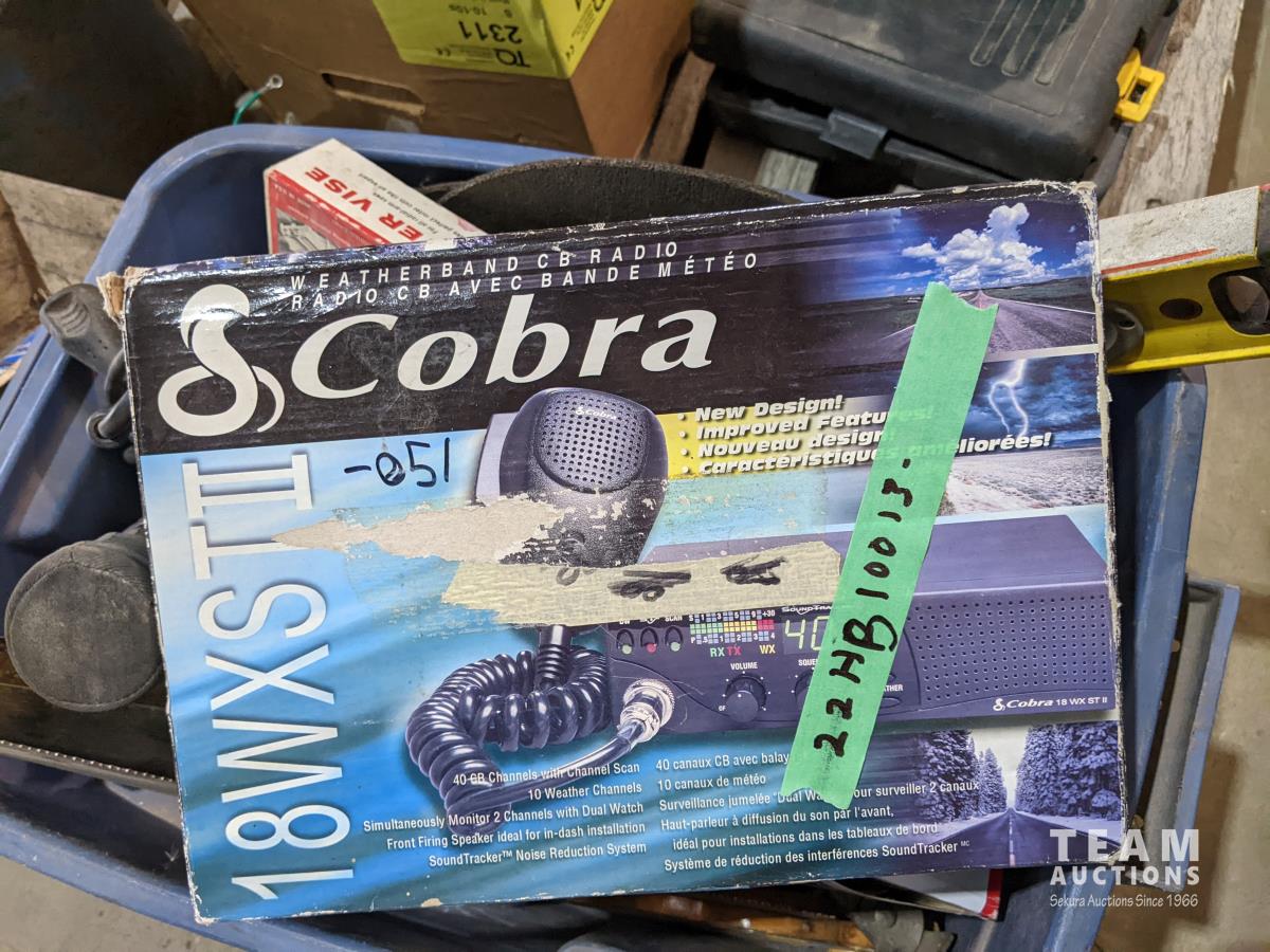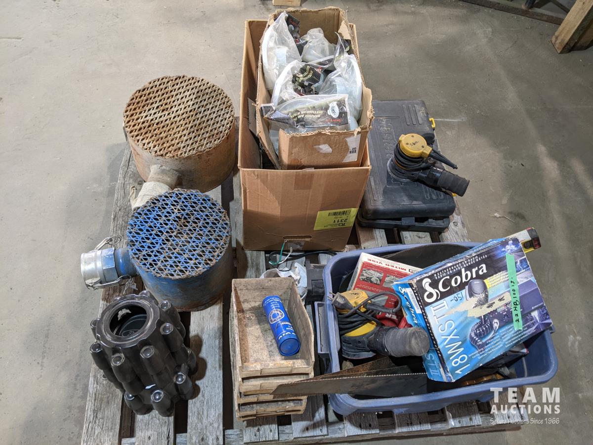 palm sander, trash pump screens, air diffusers, tool kit, Cobra radio, mitre vise, level, hand saws