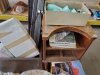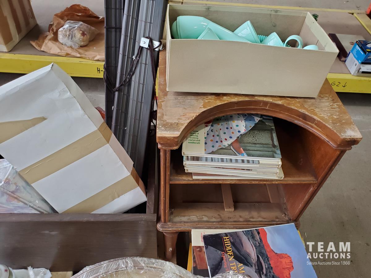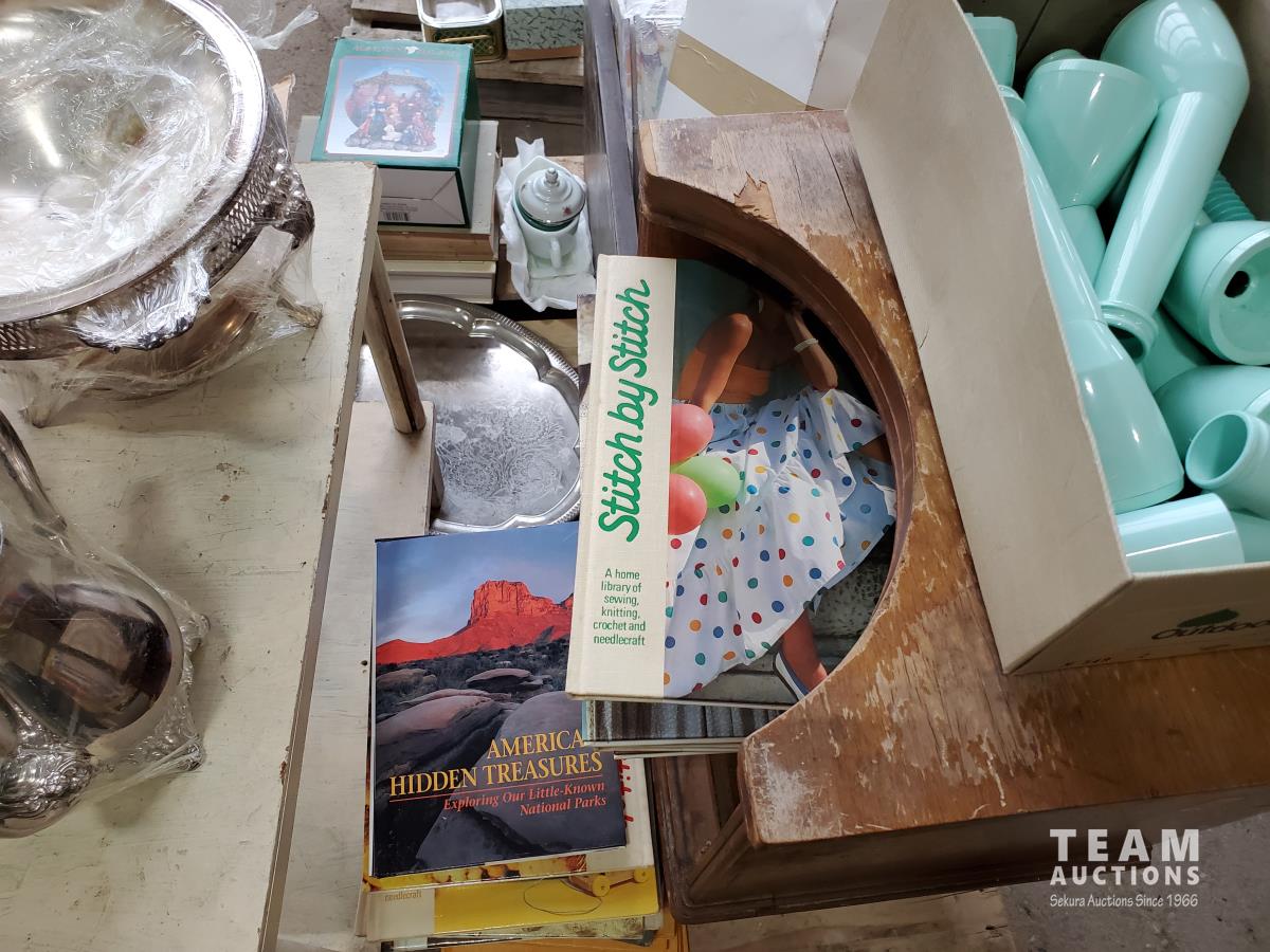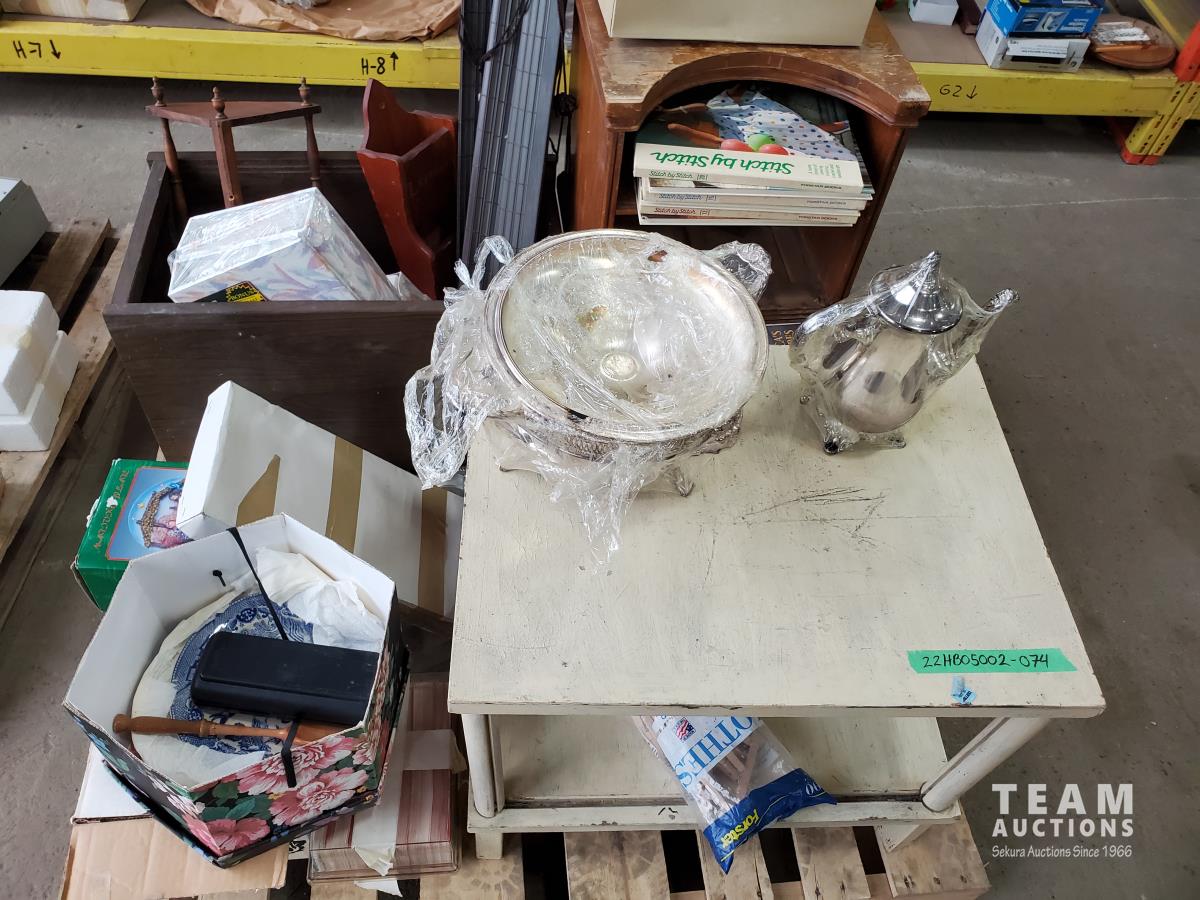 Vintage end tables, assorted books (stitching books & health books), photo albums, silver antique tea pot