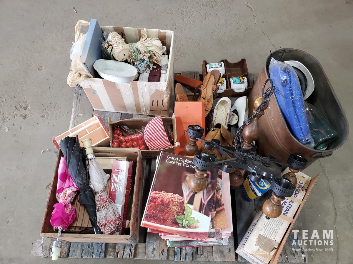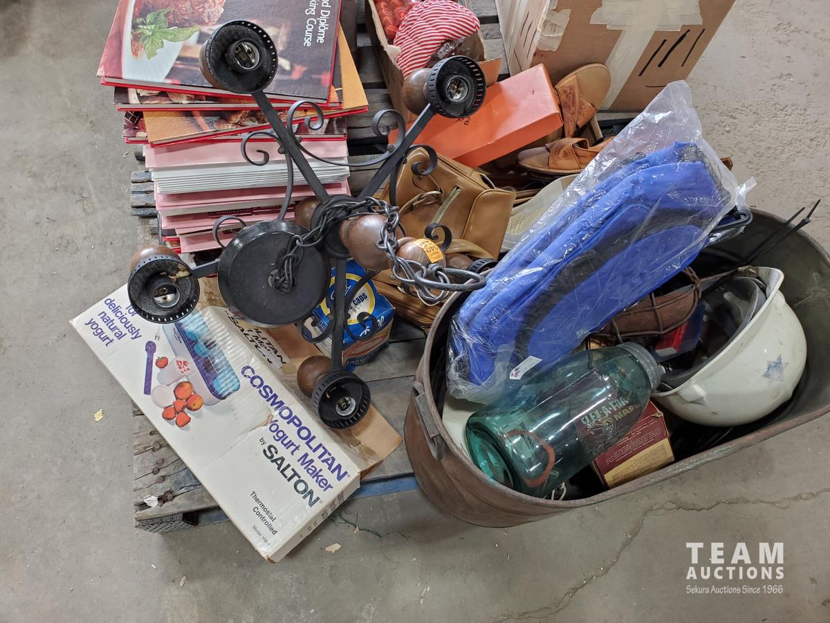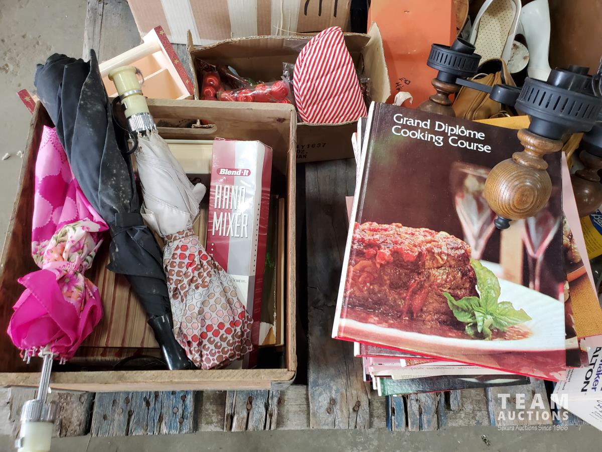 Assorted cookbooks, yogurt maker, hanging light fixture, cups, women's shoes, hand mixer, (3) umbrellas, tote bag, hard hat