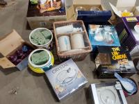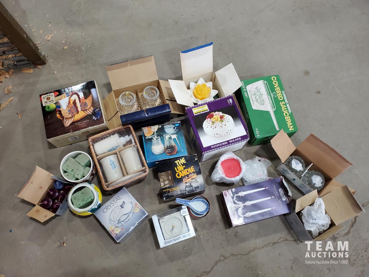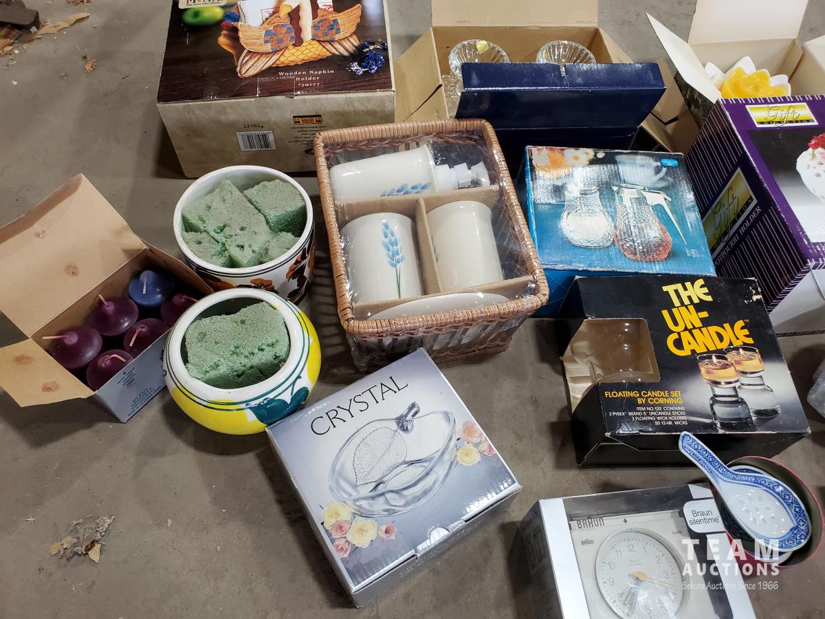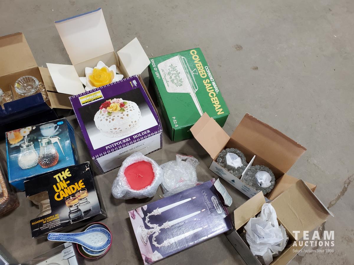 Assorted candles & holders, sugar-creamer set, napkin holder, potpourri holder, canning ware