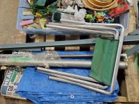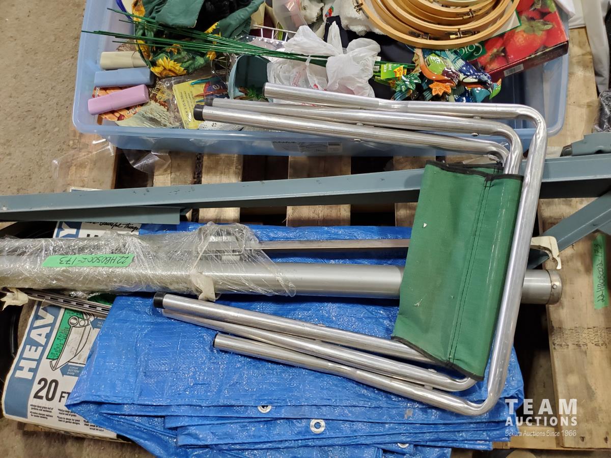 Projector screen, aluminum folding stool, large suitcase, cross stitching rings, garden bird stakes, steel bedframe, 20 ft landscaping edging