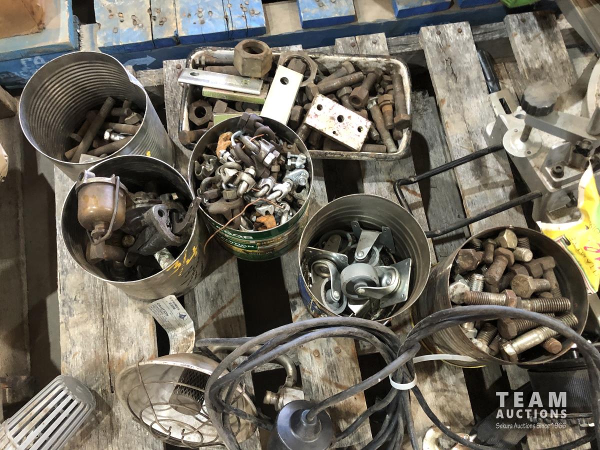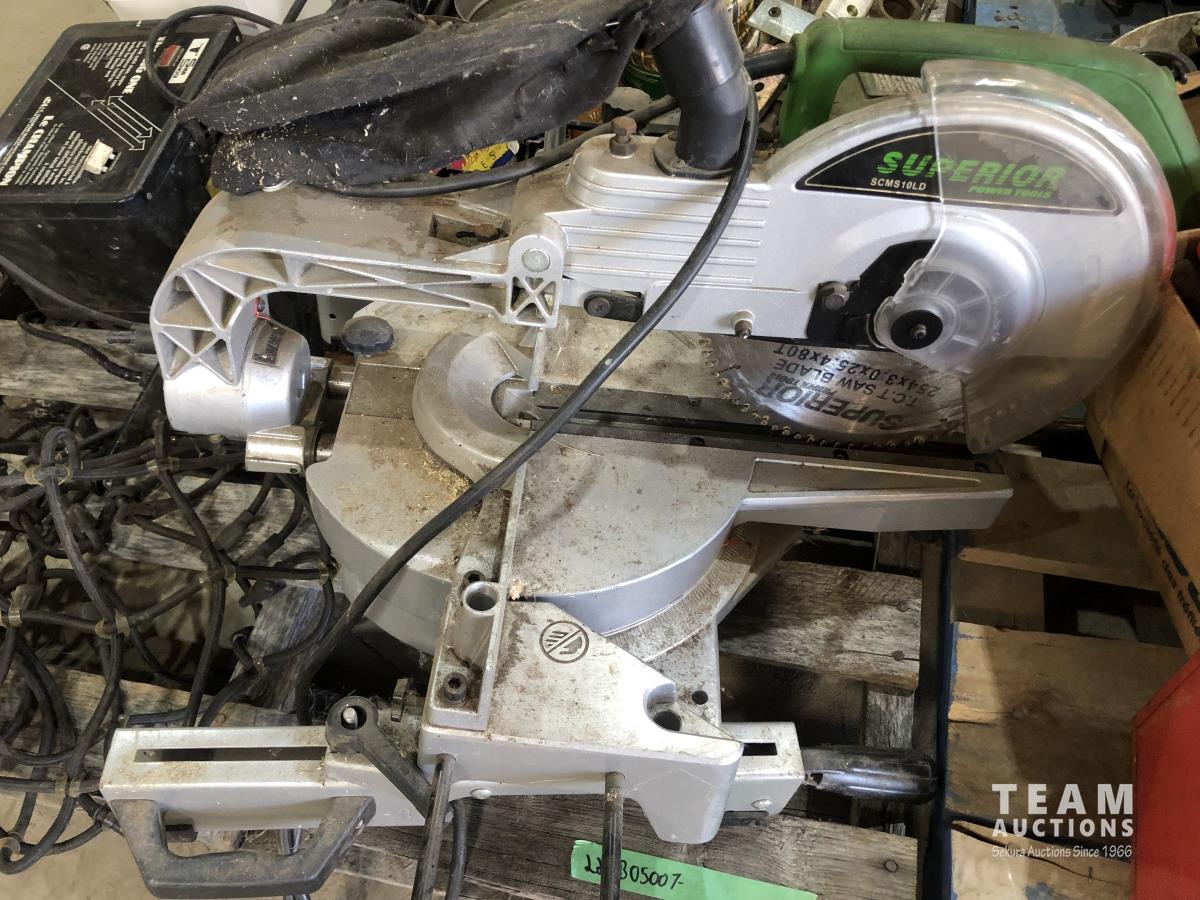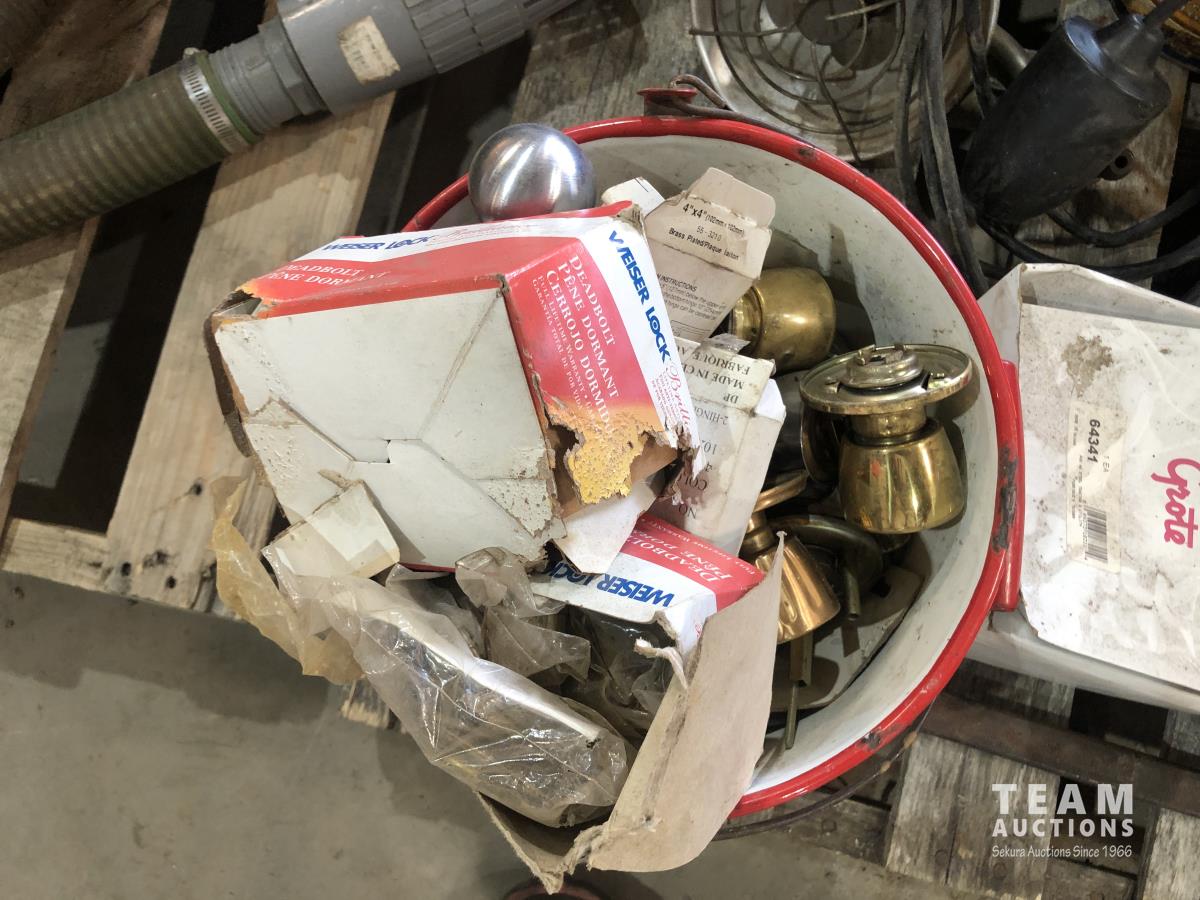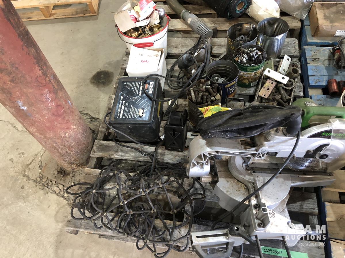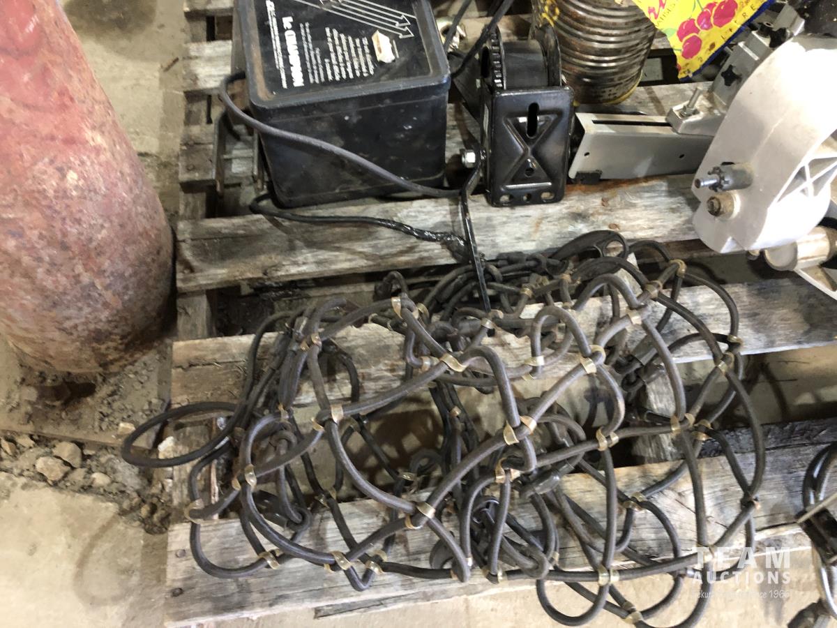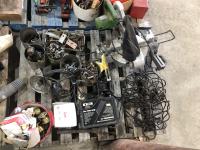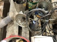 door knobs, cargo net, electric fence controller, mitre saw, bolts, strap wrench, propane heater
