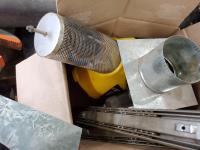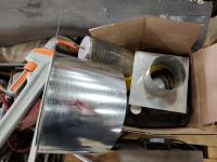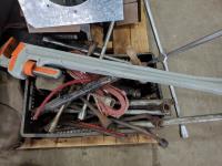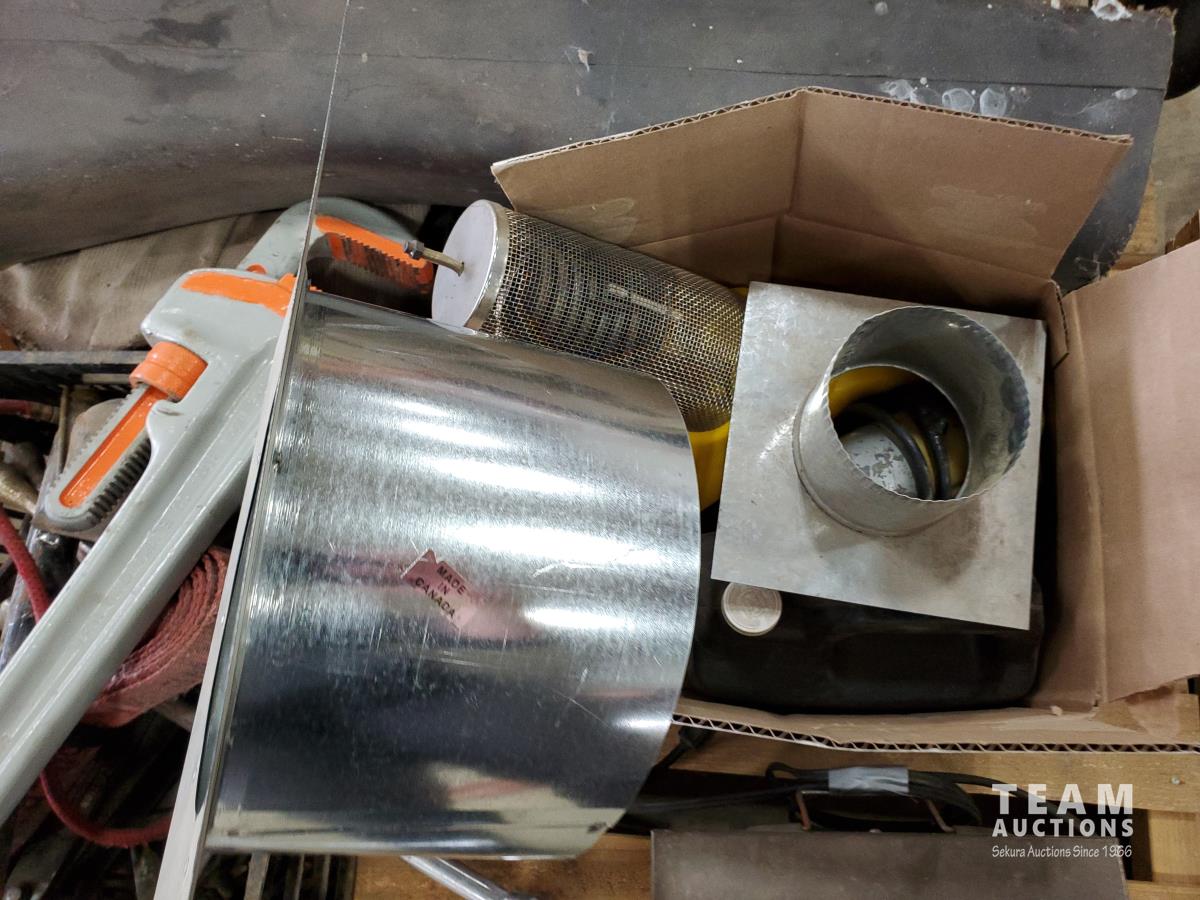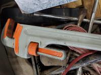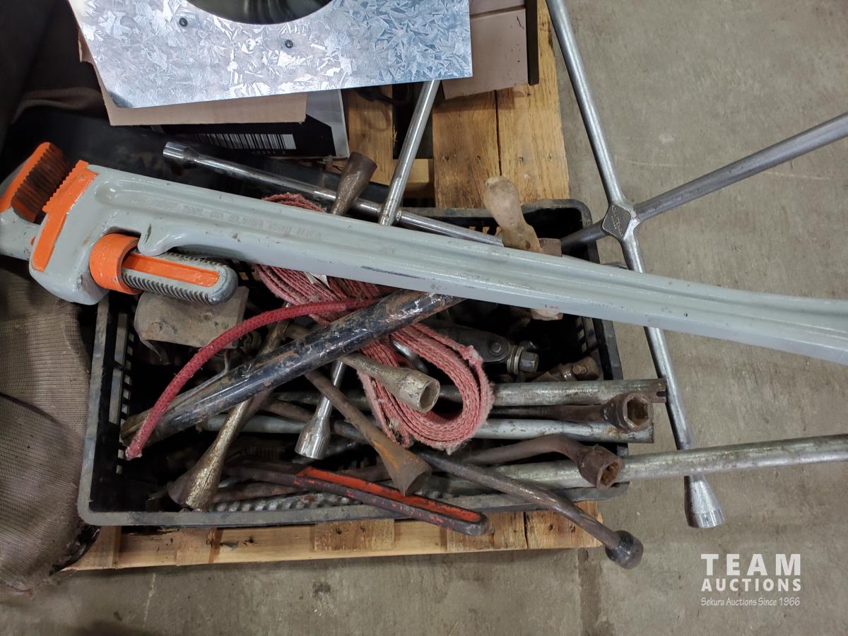John deere ride on mower bag, tote of assorted tire irons, Rigid 36" aluminum pipe wrench, box of miscellaneous heaters, black & decker drill