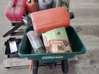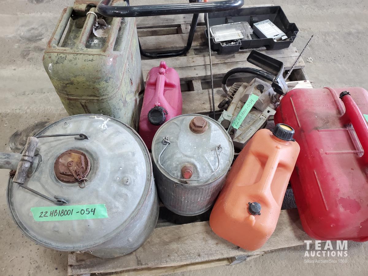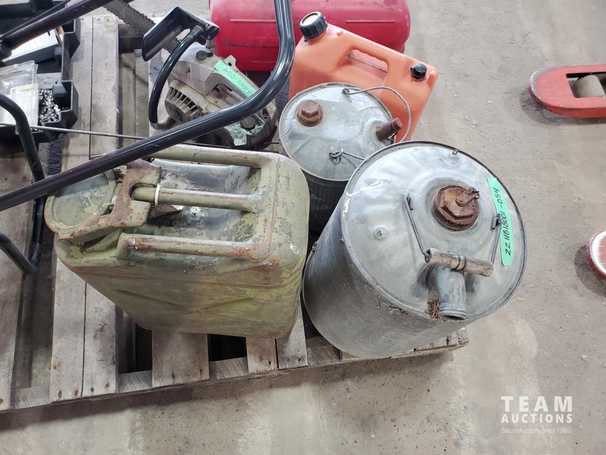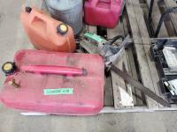 (4) Jerry cans, (3) antique jerry cans, seed spreader, chain saw & coleman lantern