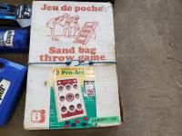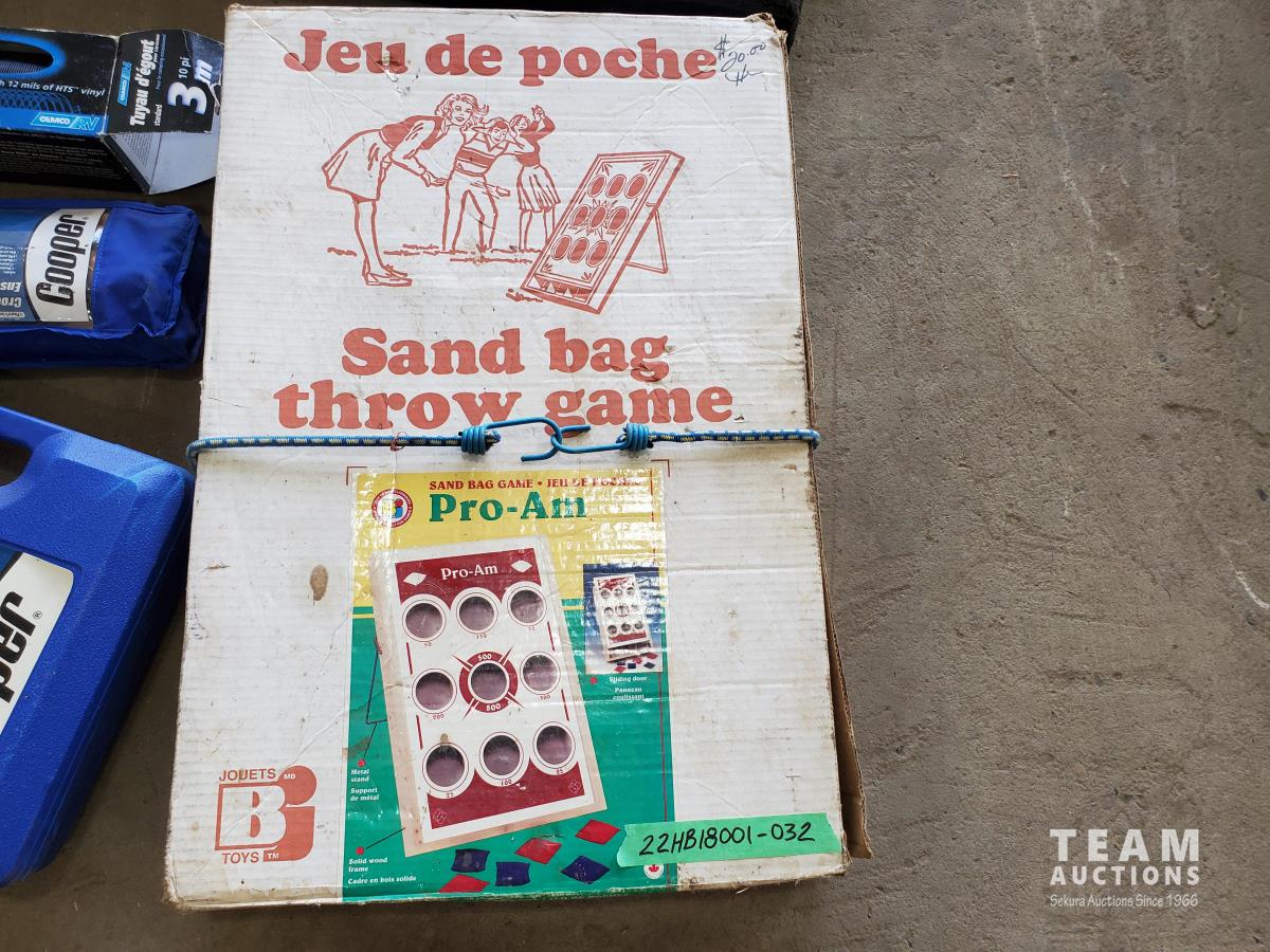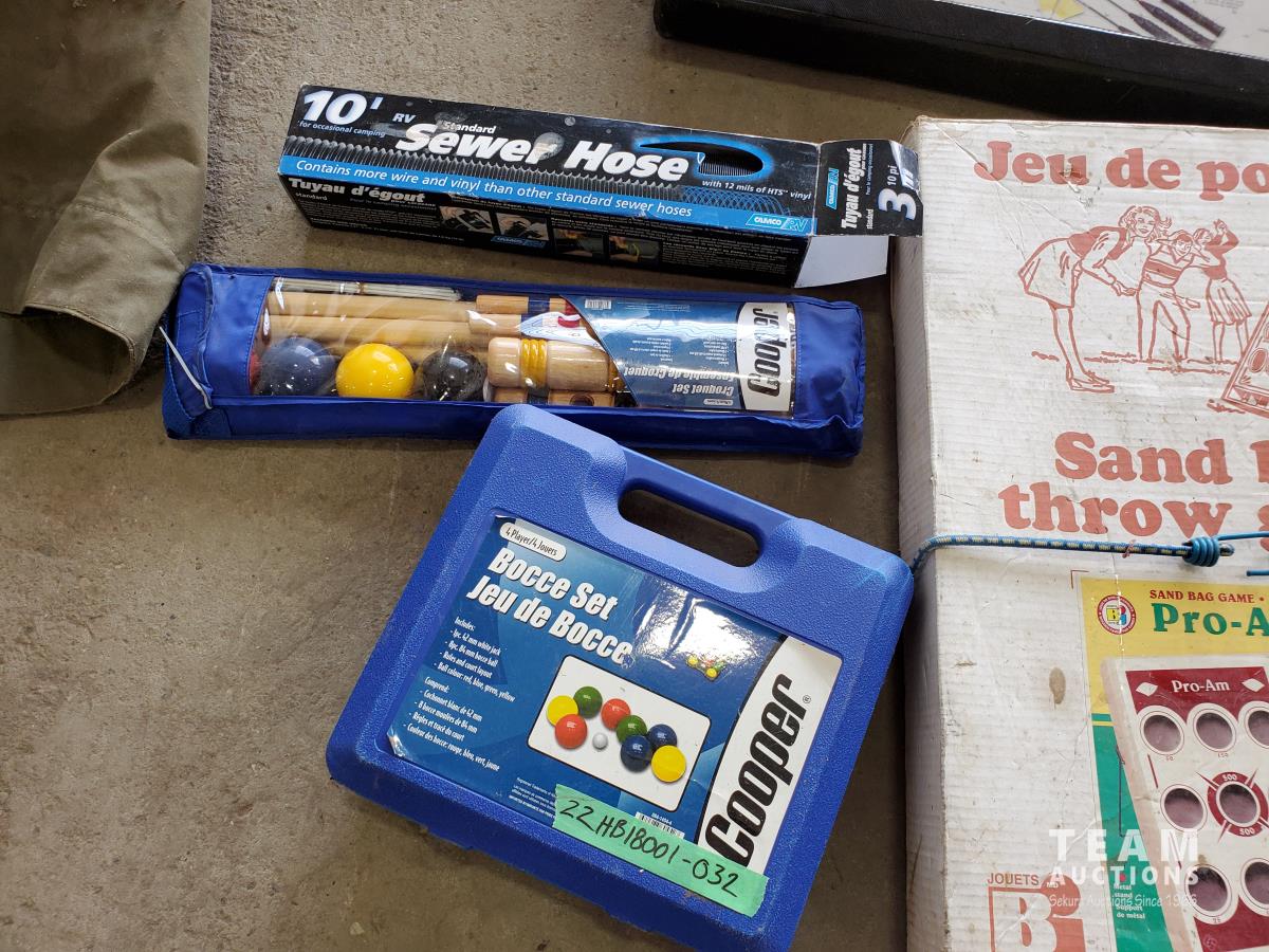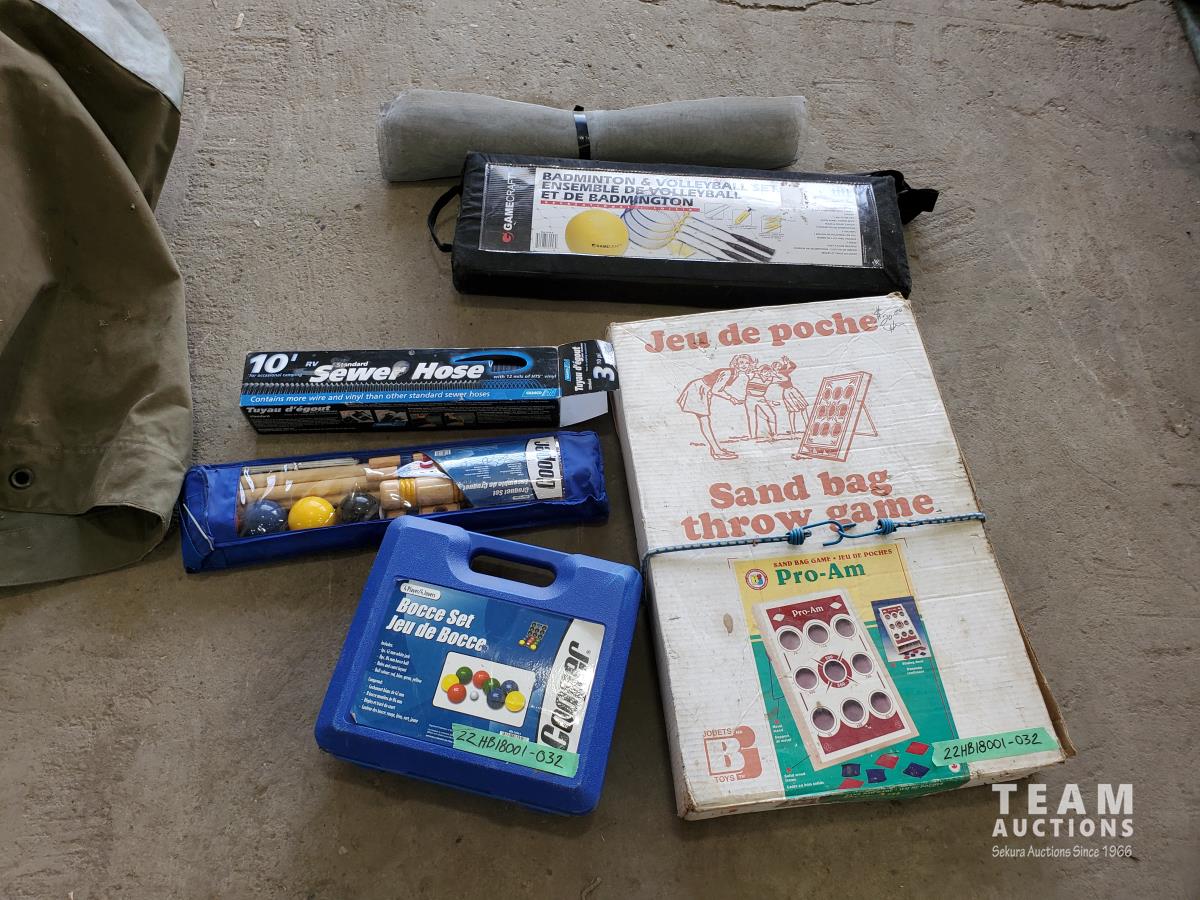 Sand bag throw game, badminton & volleyball set, Bocce set, croquet set & 10' sewer hose