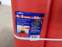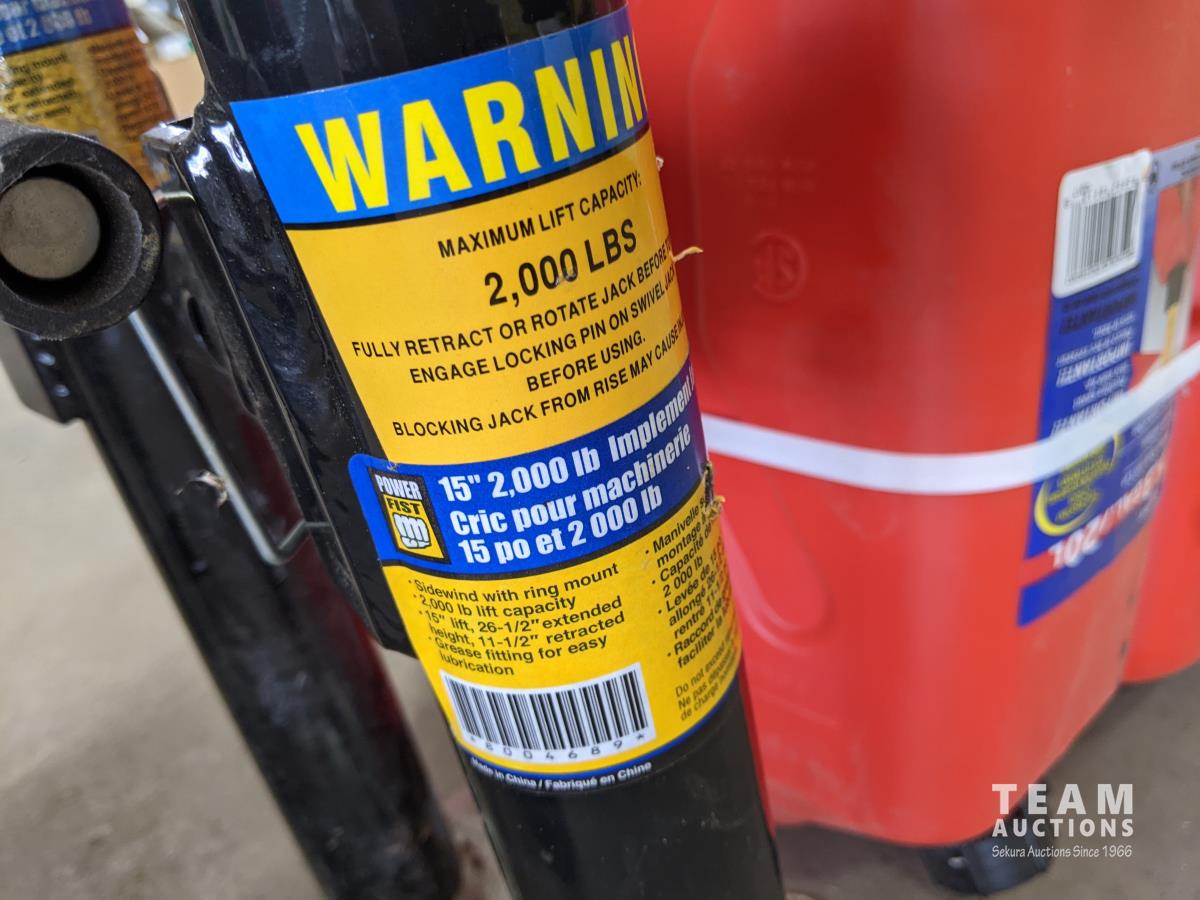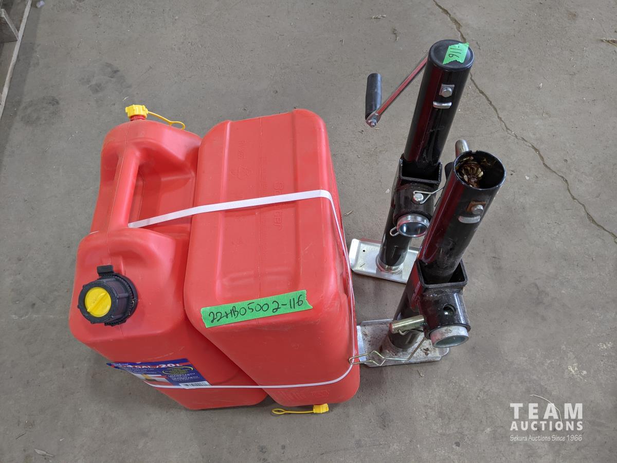 Jerry cans (x2 new), Powerfist utility jacks 15 inch 2000LBS (x2)