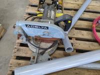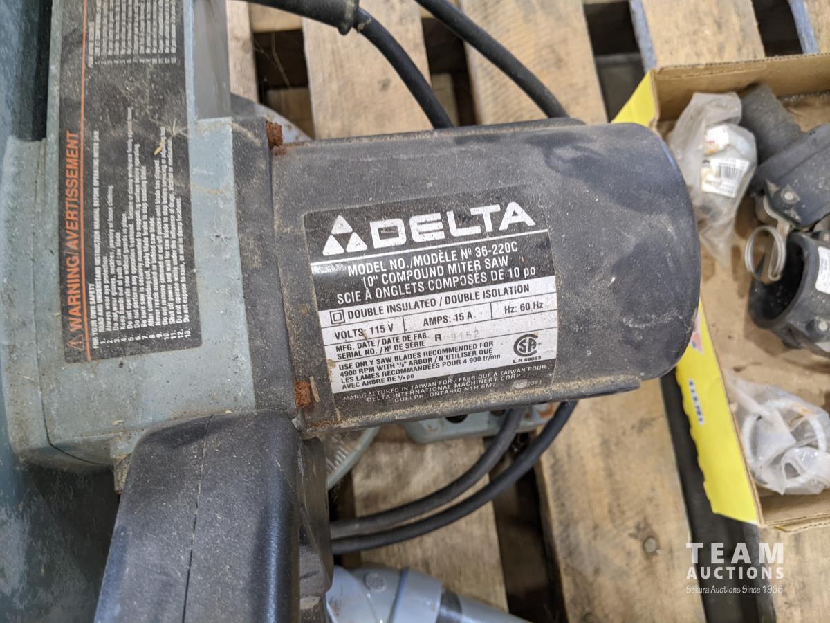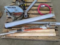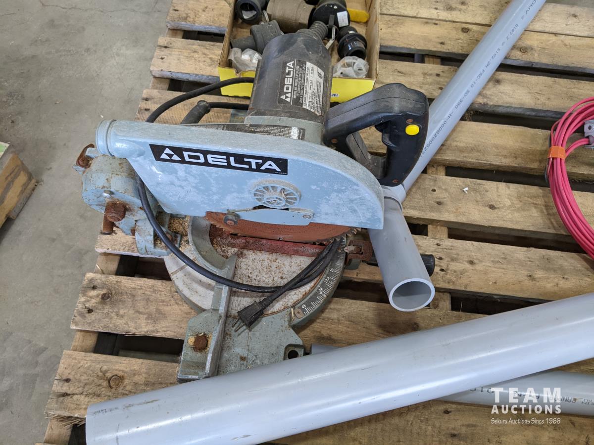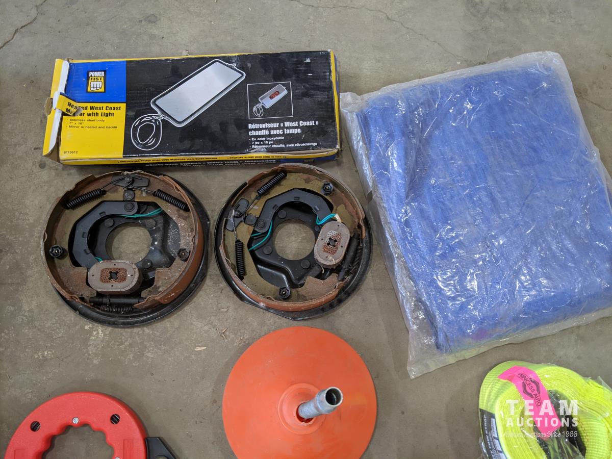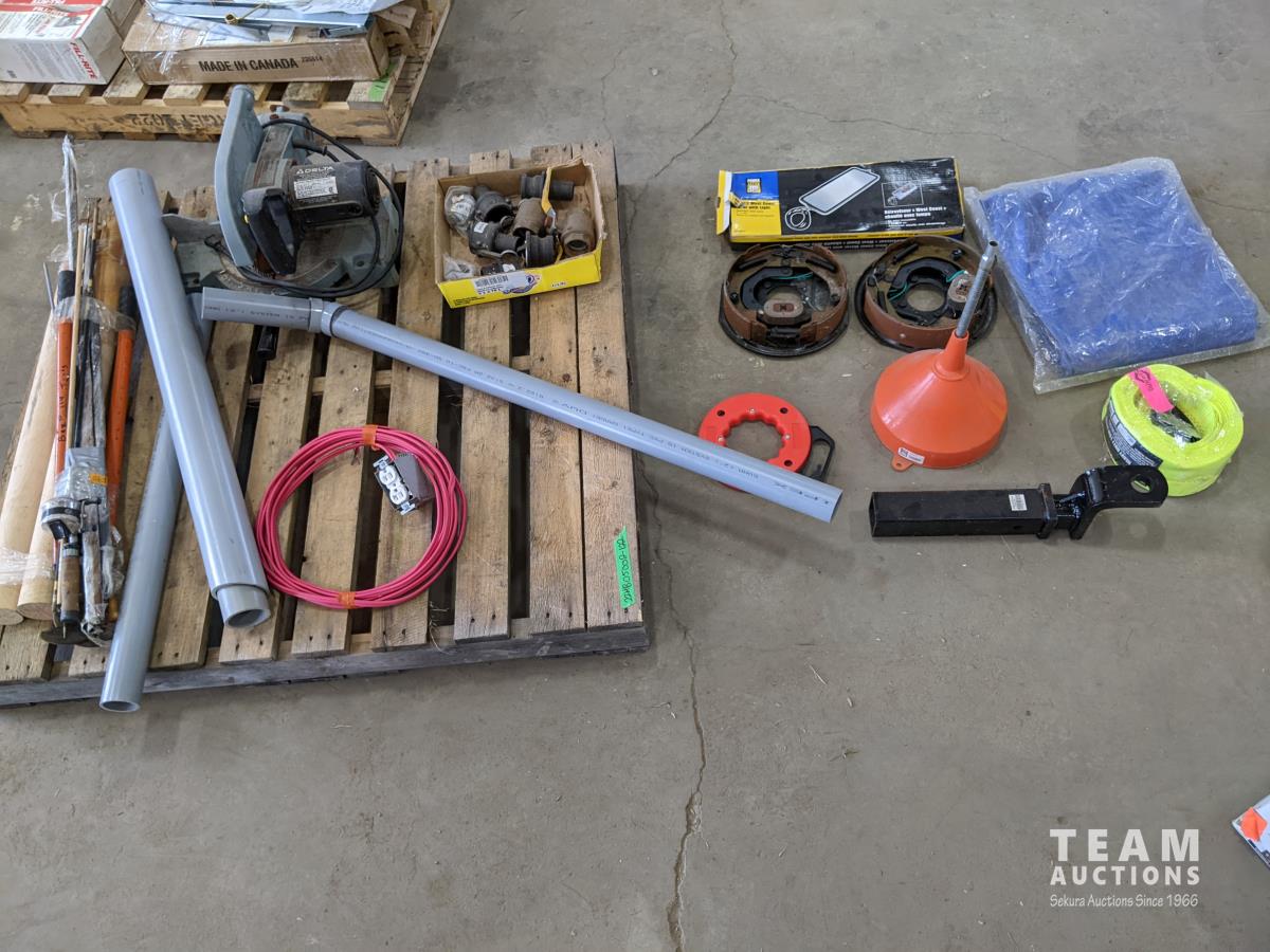 Pallet of miscellaneous shop tools & equipment: tarp, hitch, Delta saw, brake drums