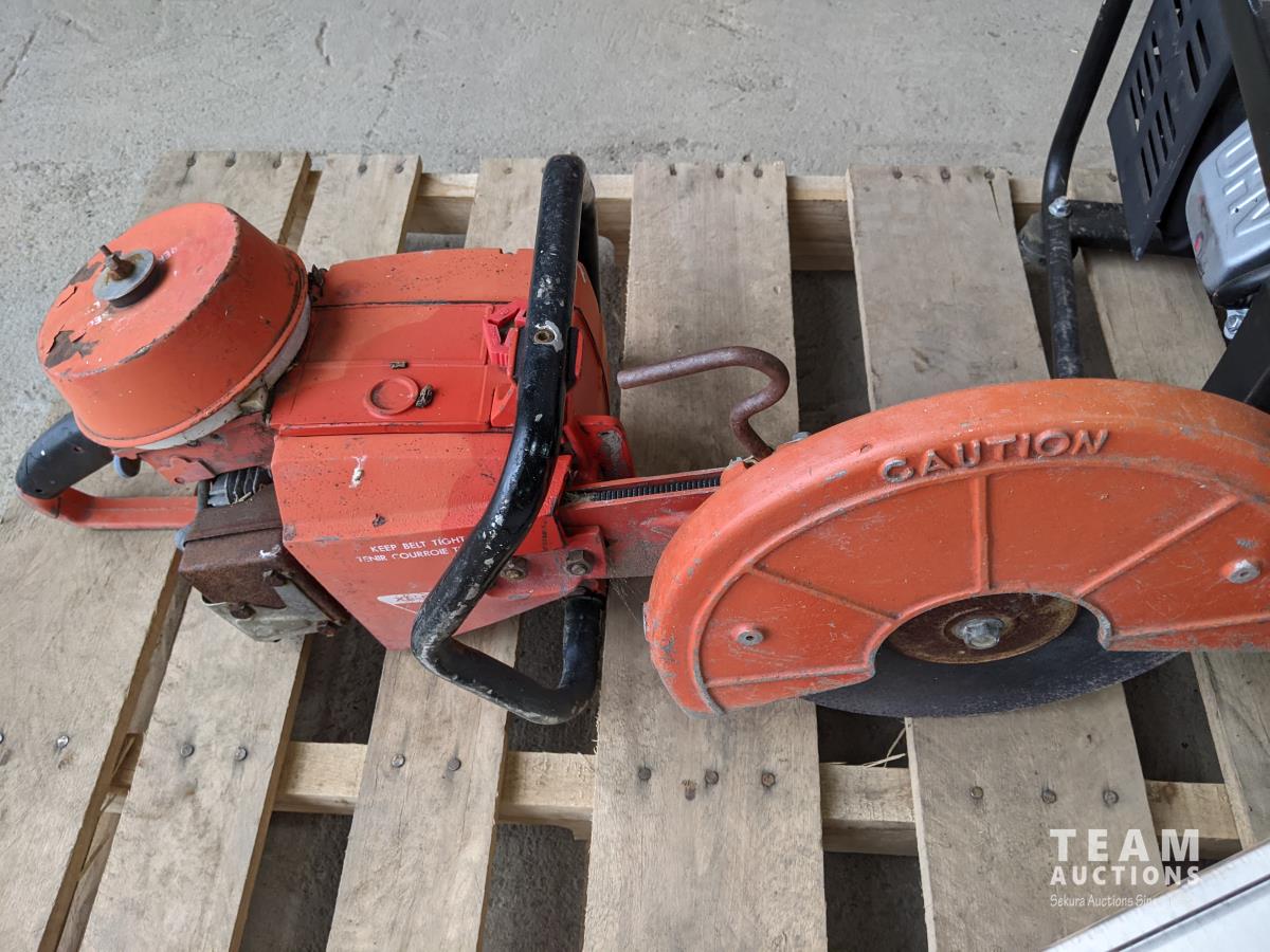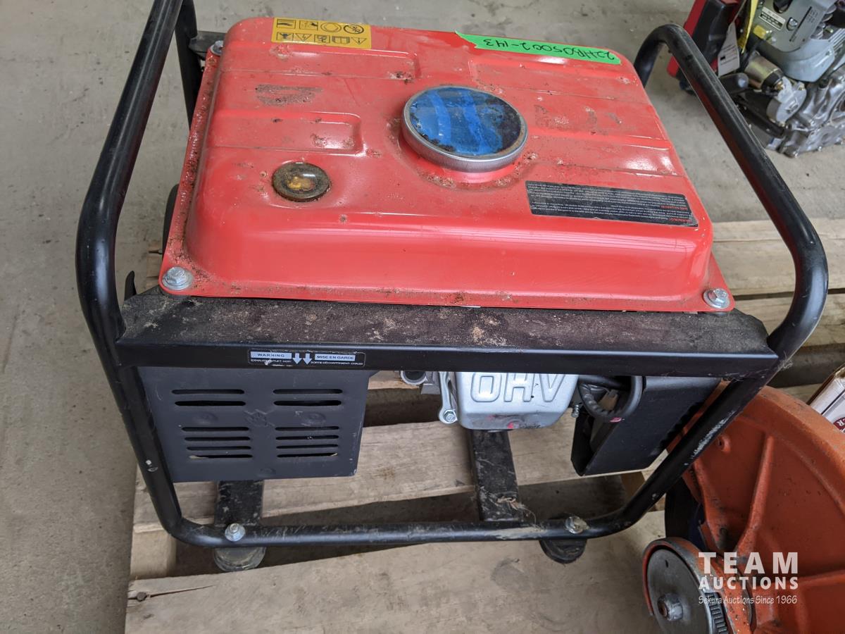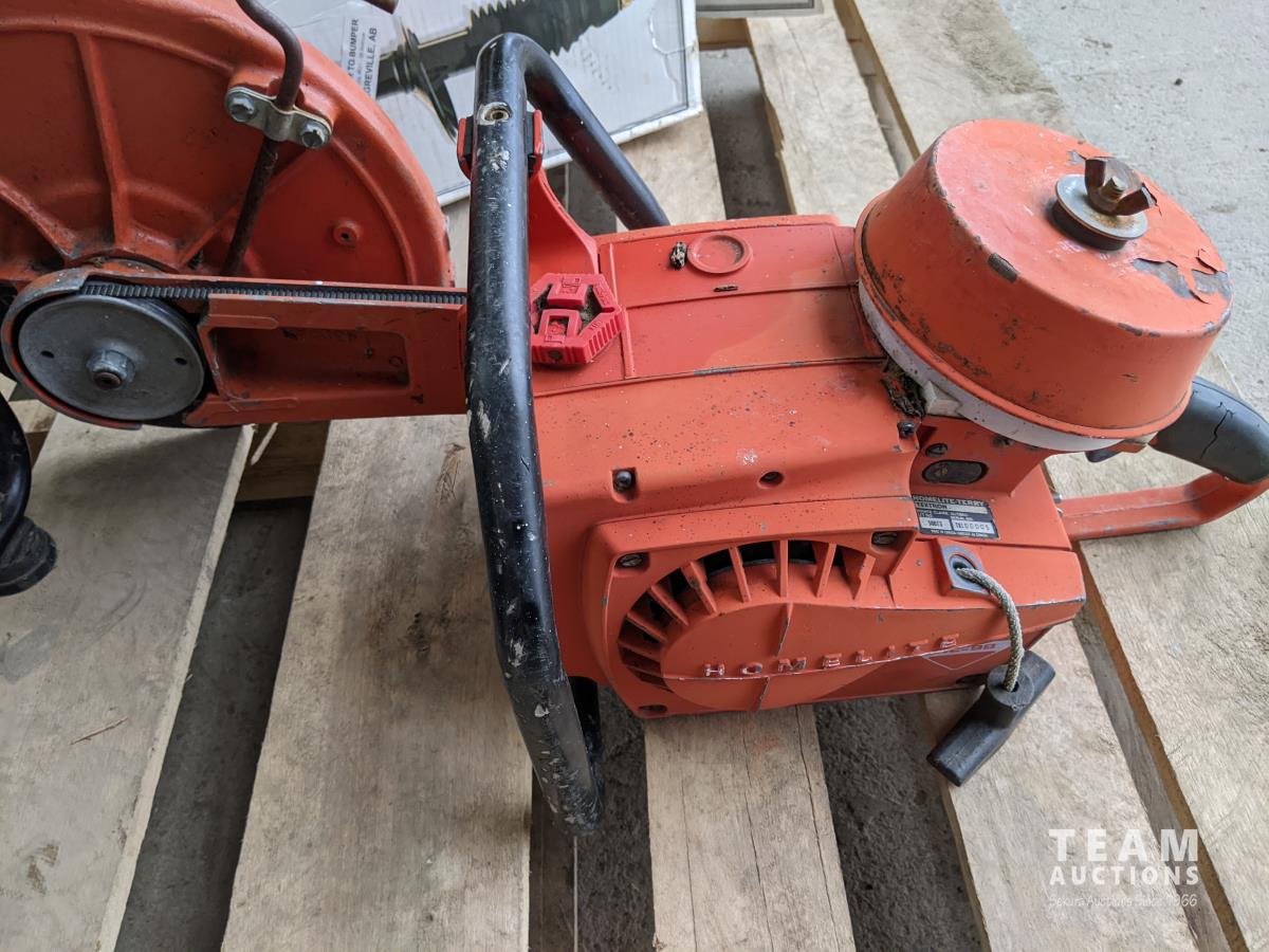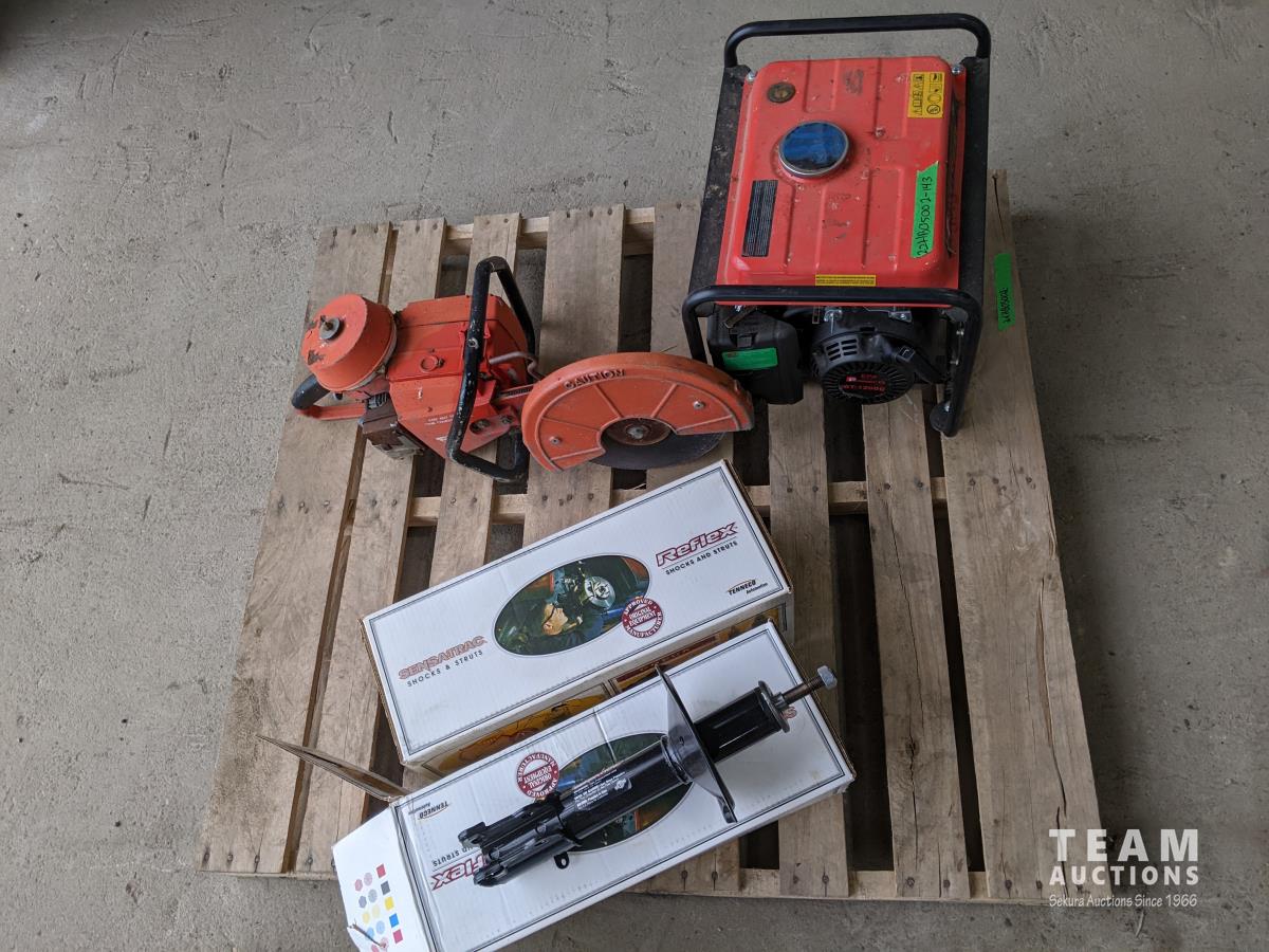 Pallet with Homelight chop saw, Power G 1200W Petroleum generator, Monroe shocks (x2)