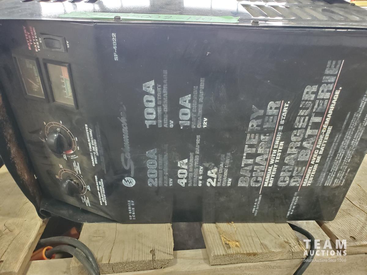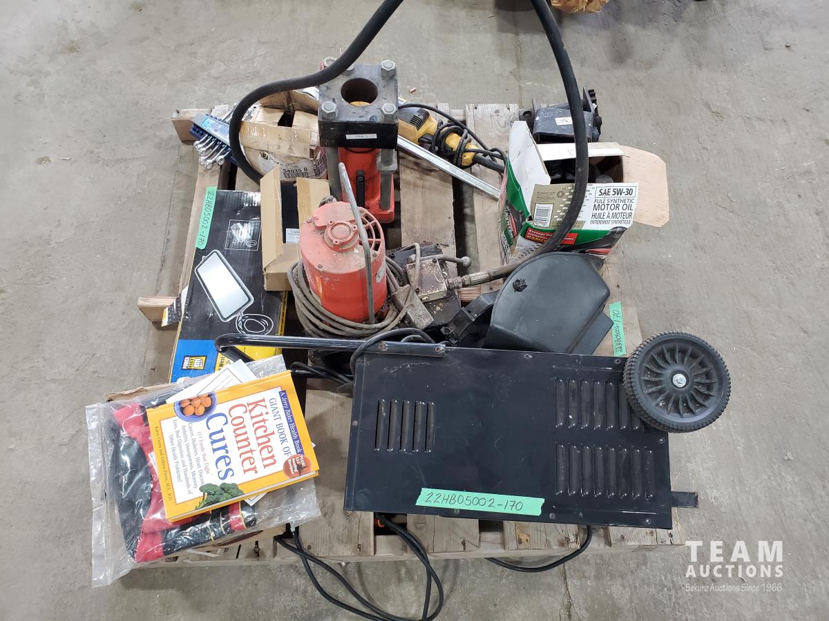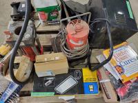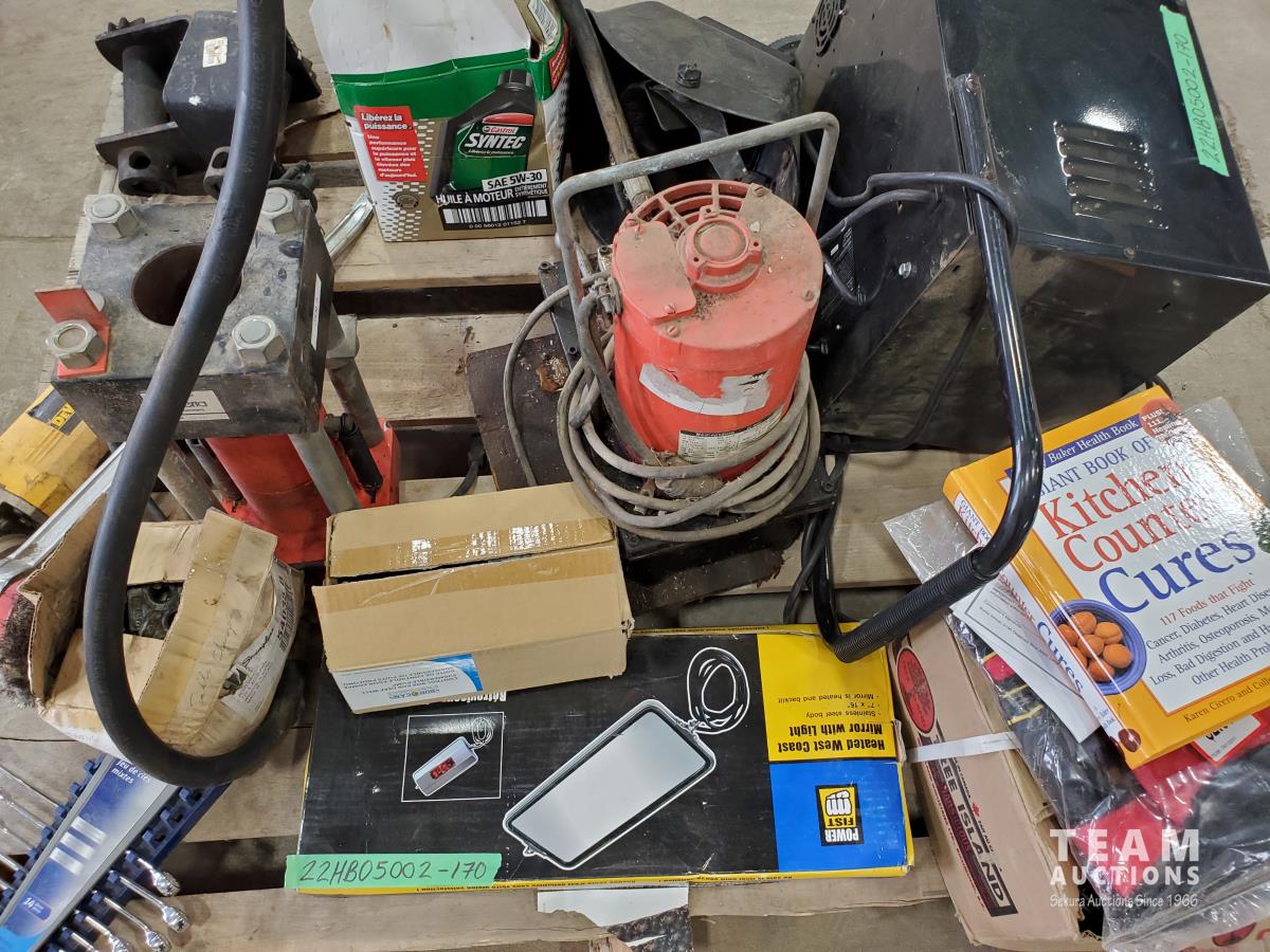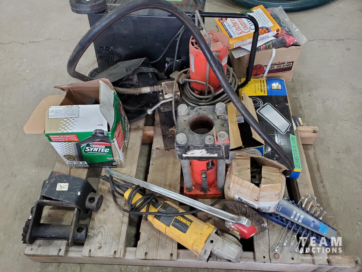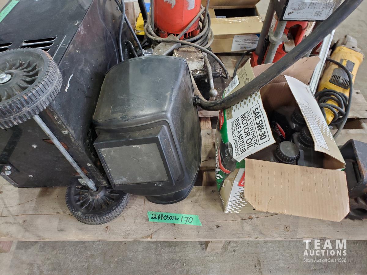 Battery charger, welding helmet, jugs SAE 5W oil (x5), DeWalt grinder, 9 pocket pouch attachment Gator power crimp, control box for deep well pump