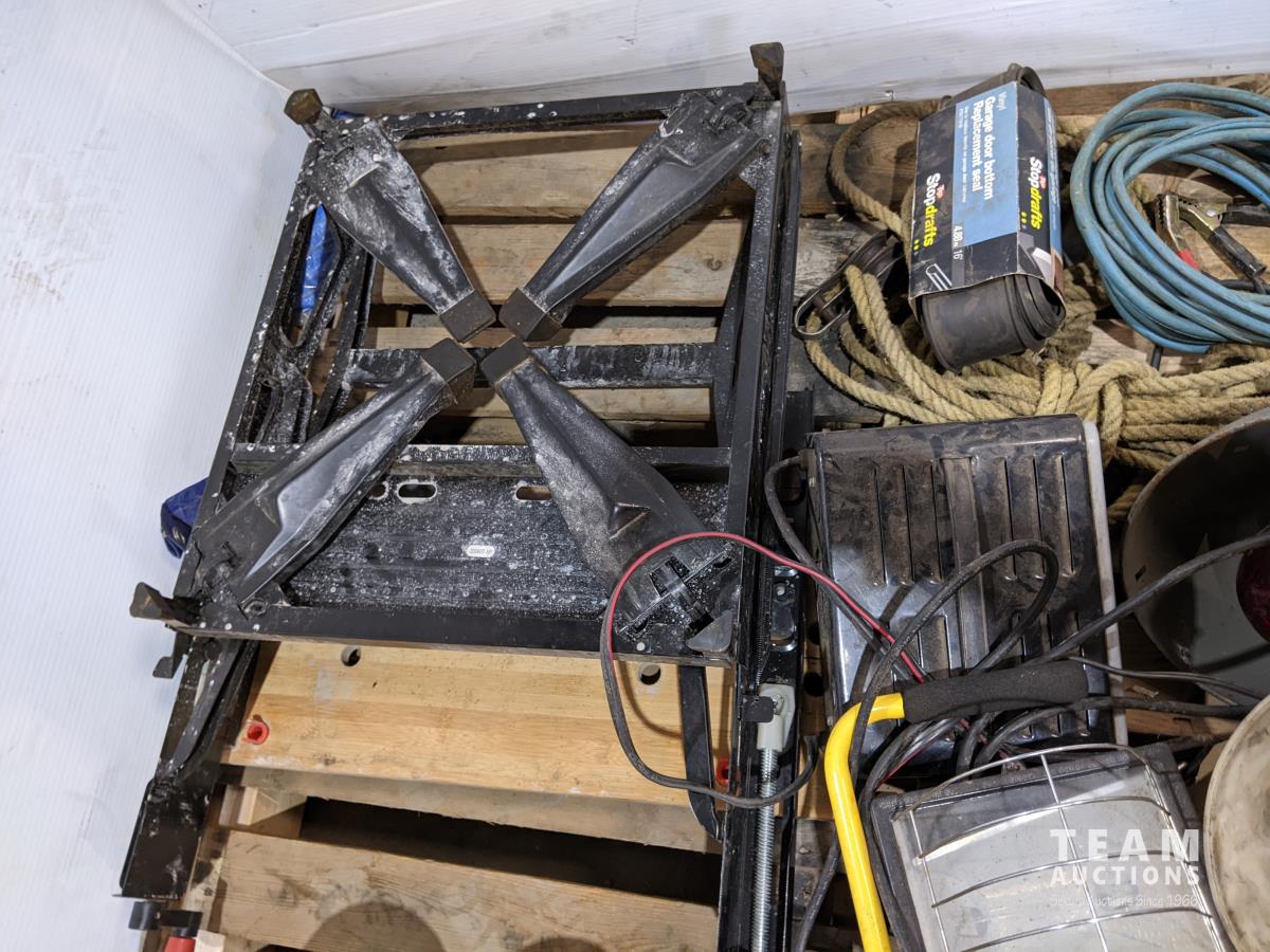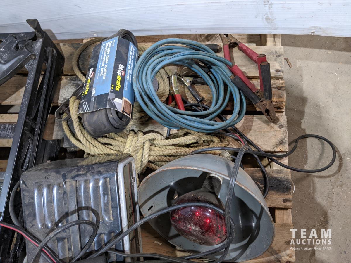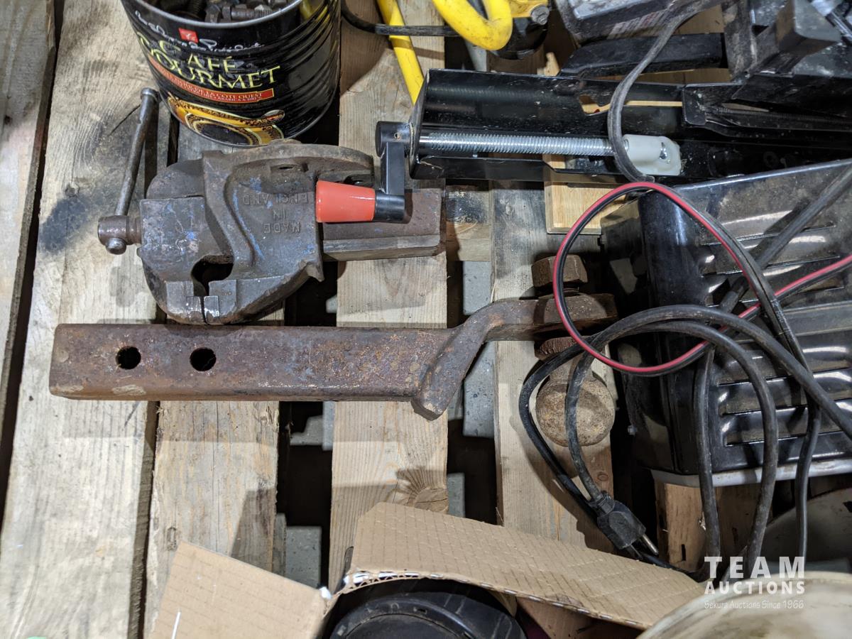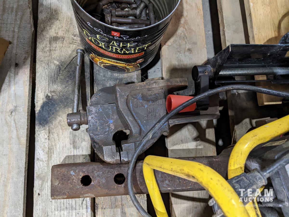 Portable work bench, record vice, ball hitch, battery charger, lights