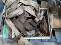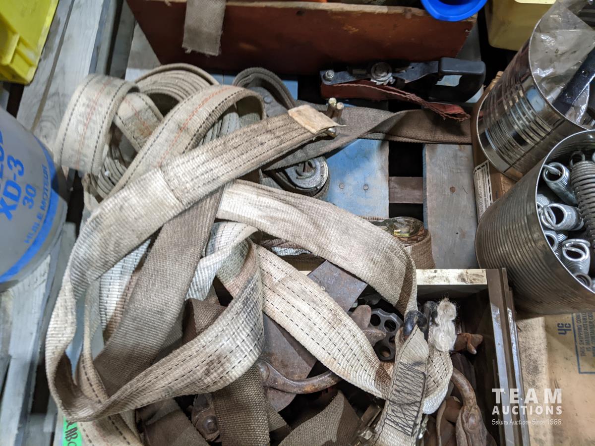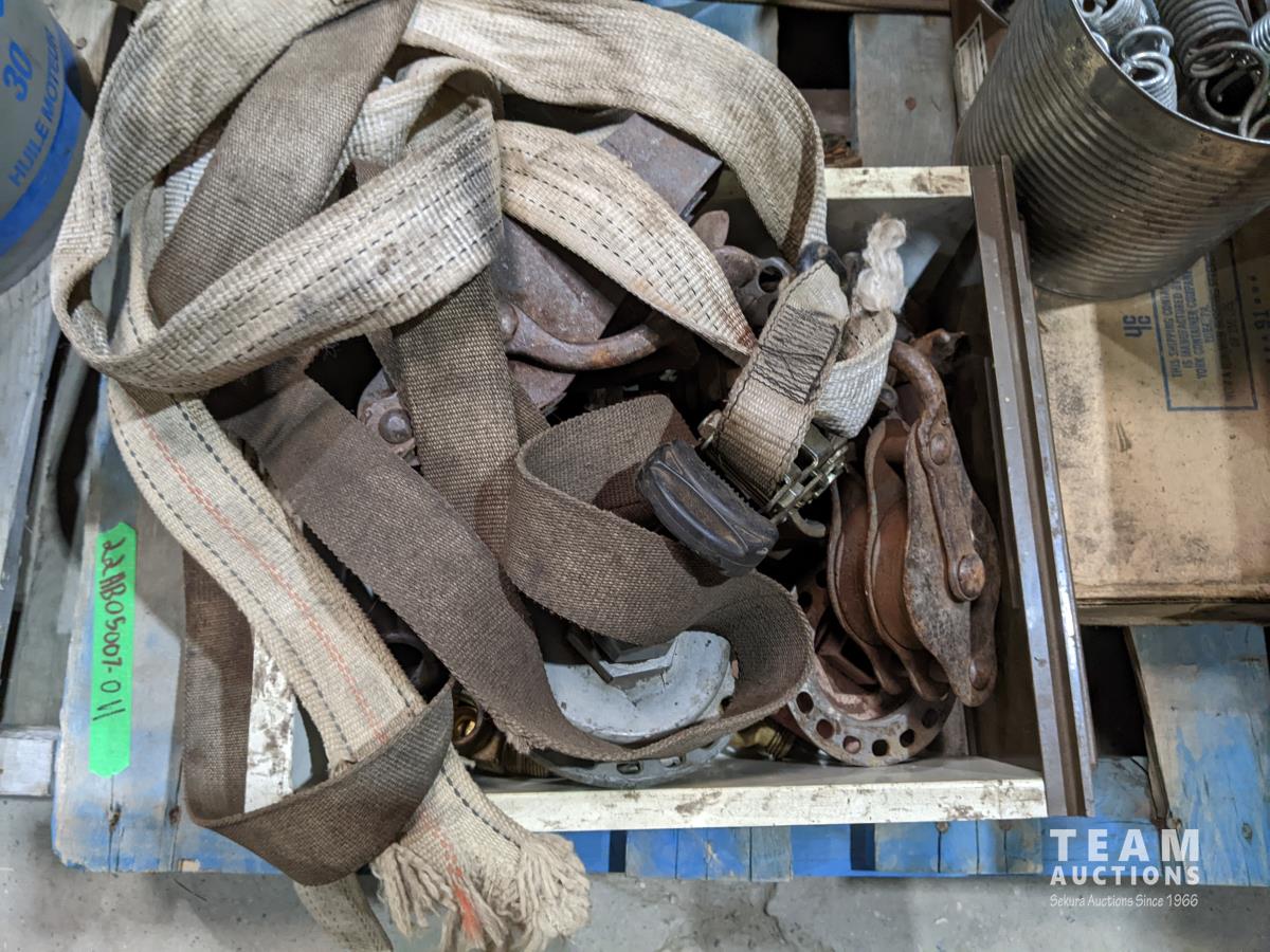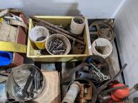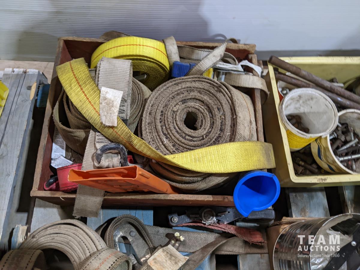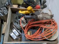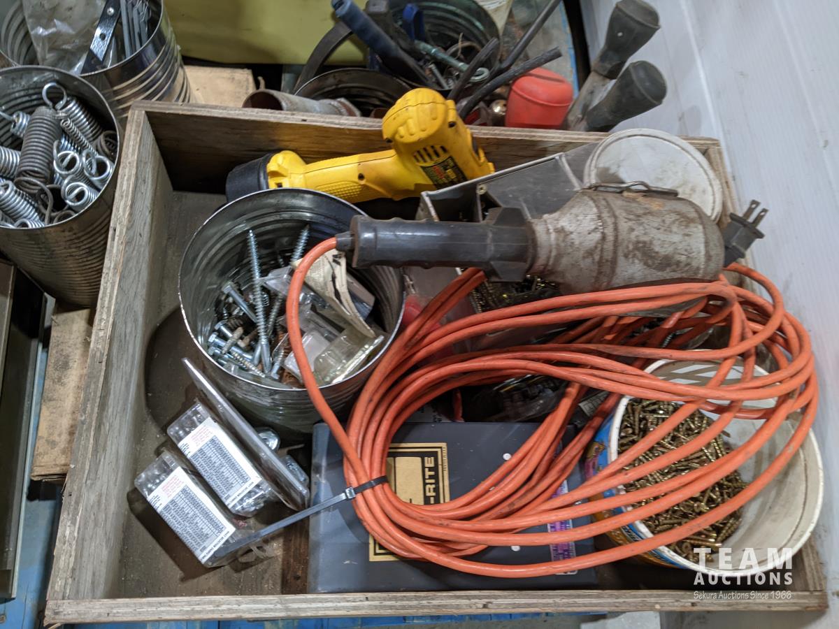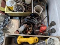 Miscellaneous hardware, ratchets, straps, miscellaneous fittings, DeWalt drill (working), welding rods