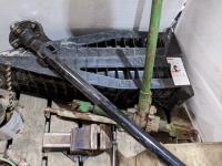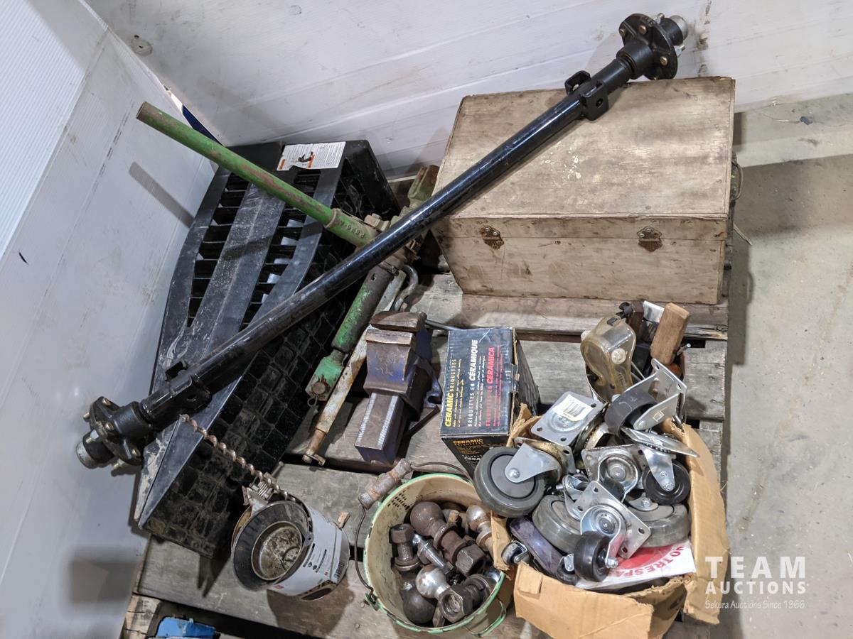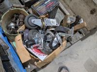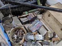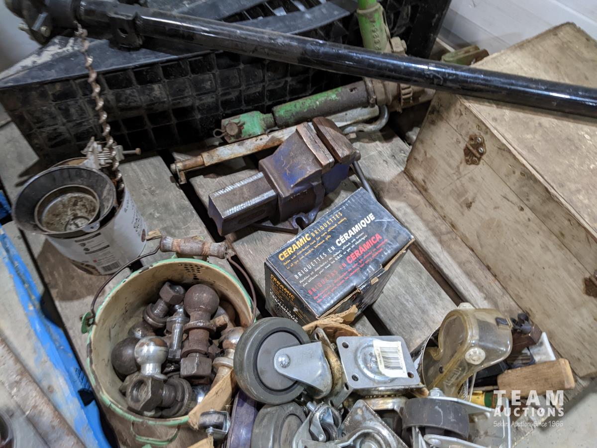 Car ramps, axle, hydraulic ratchet, pail of ball hitches, box of caster wheels, ceramic BBQ briquettes, vice
