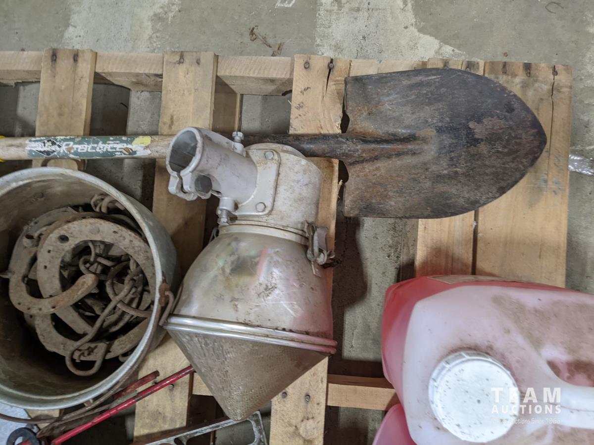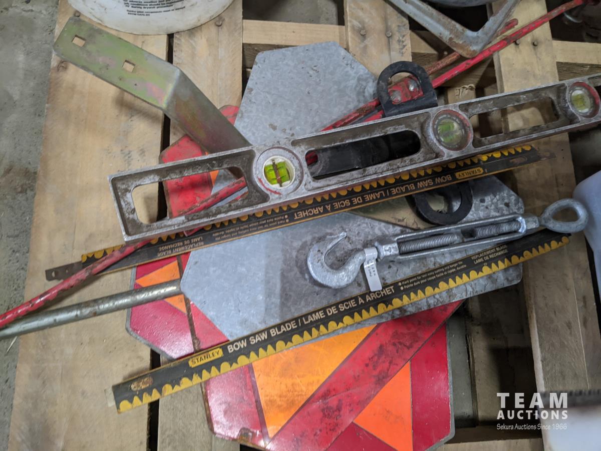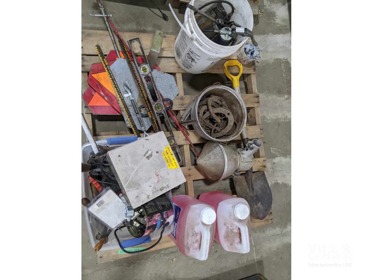 Pallet of miscellaneous horse shoes, shovel, farm vehicle signs, grease guns, saw blades