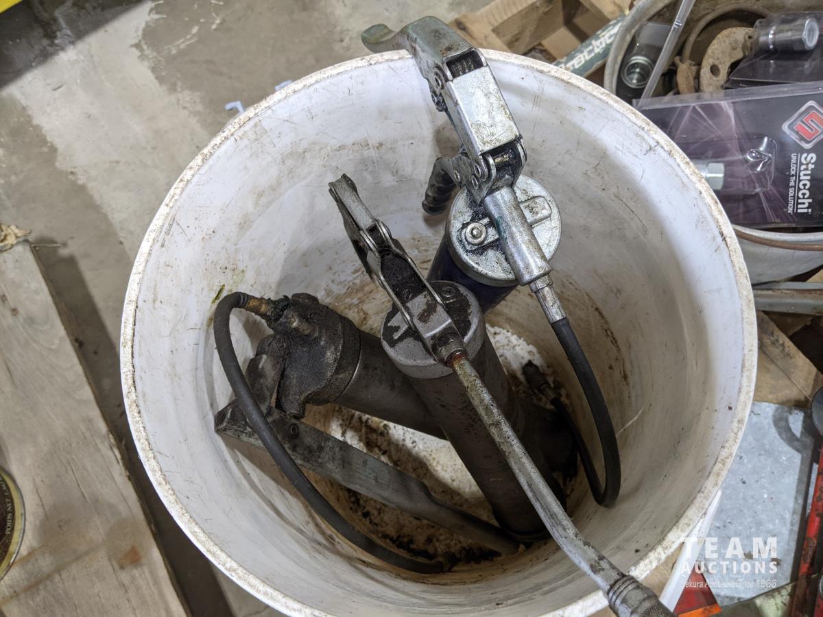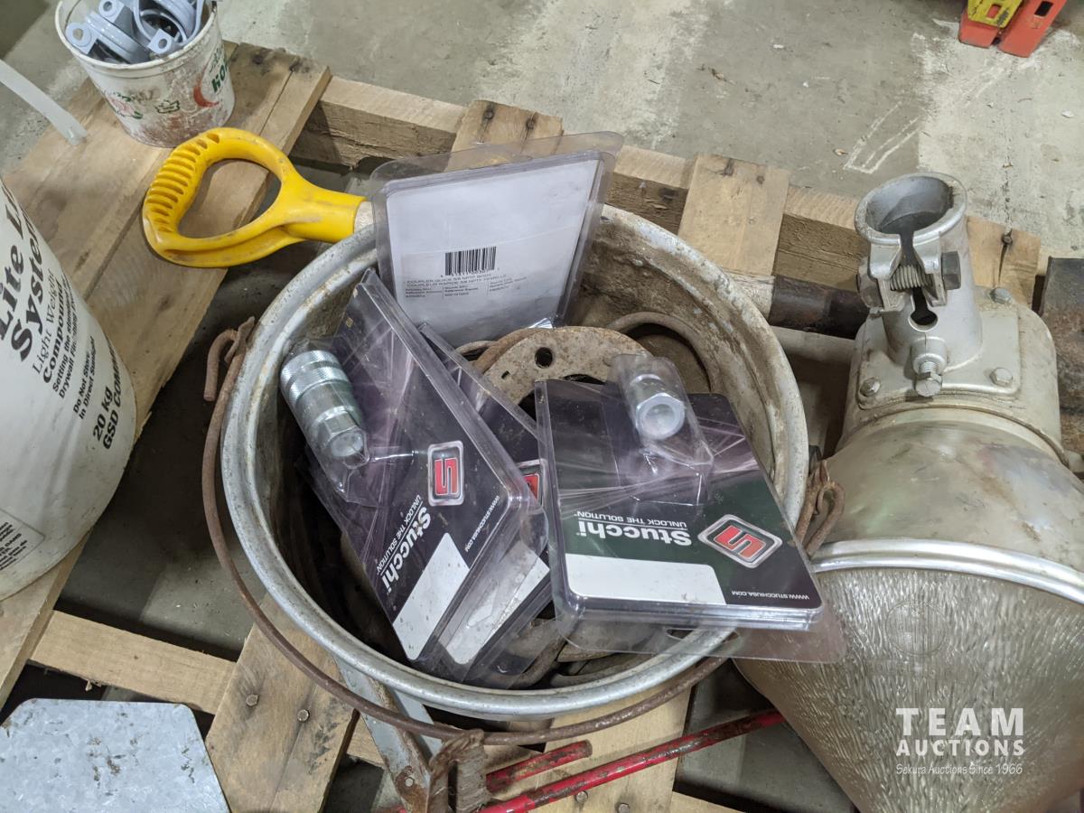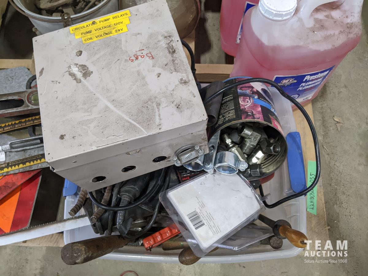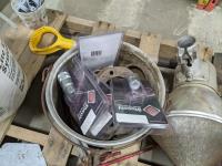 Pallet of miscellaneous horse shoes, shovel, farm vehicle signs, grease guns, saw blades