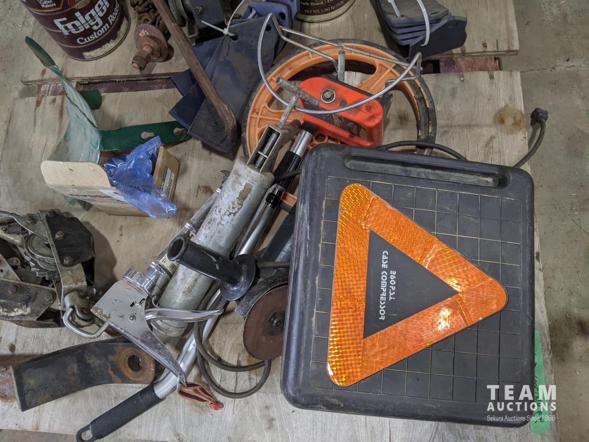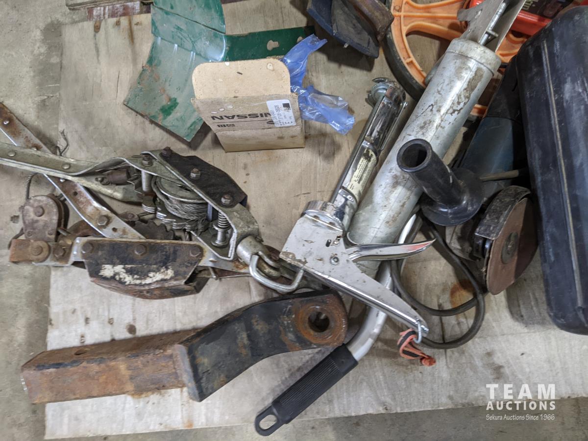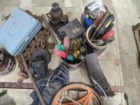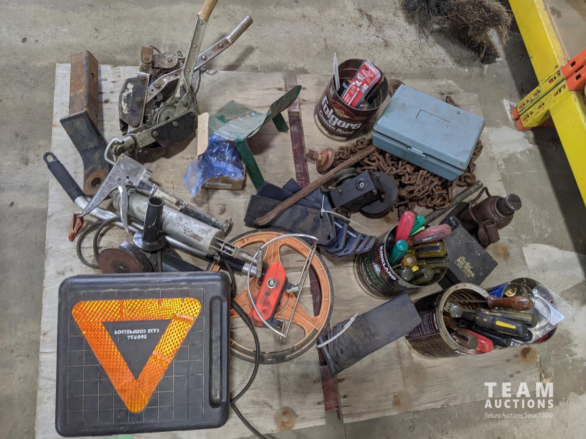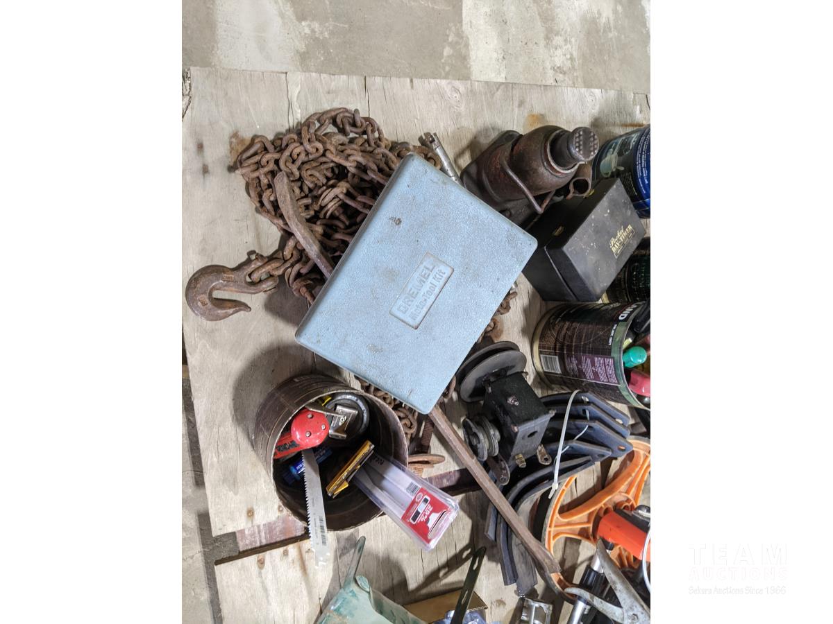 Pallet of miscellaneous hand tools, hitch, chain, older Dremel