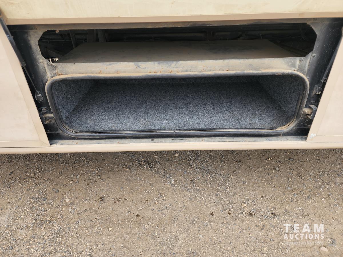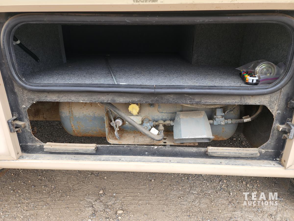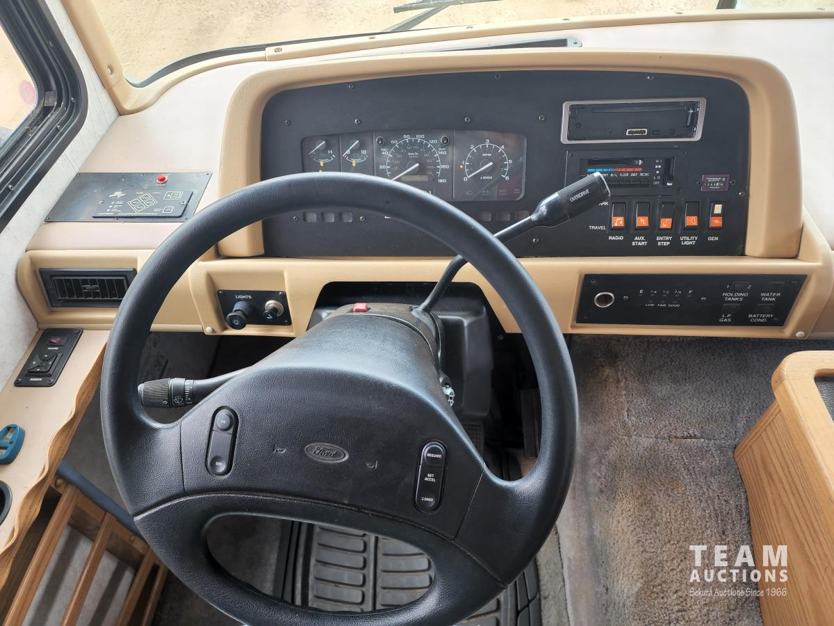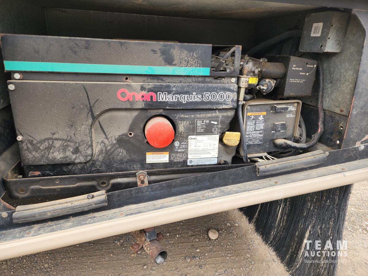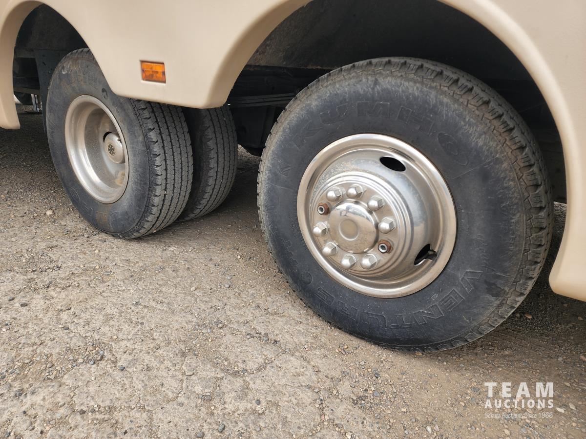 460 Ford engine (fuel injected), one 13 ft slideout, 18 ft awning, (2) top a/c units, dash a/c, fridge, stove, microwave, sofa, (2) chairs, dinette, backup camera, new air mattress, (2) TV's, DVD player, tag axle, Onan 5000w generator, 1250w inverter, sleeps 4, 235/85R16 dual tires